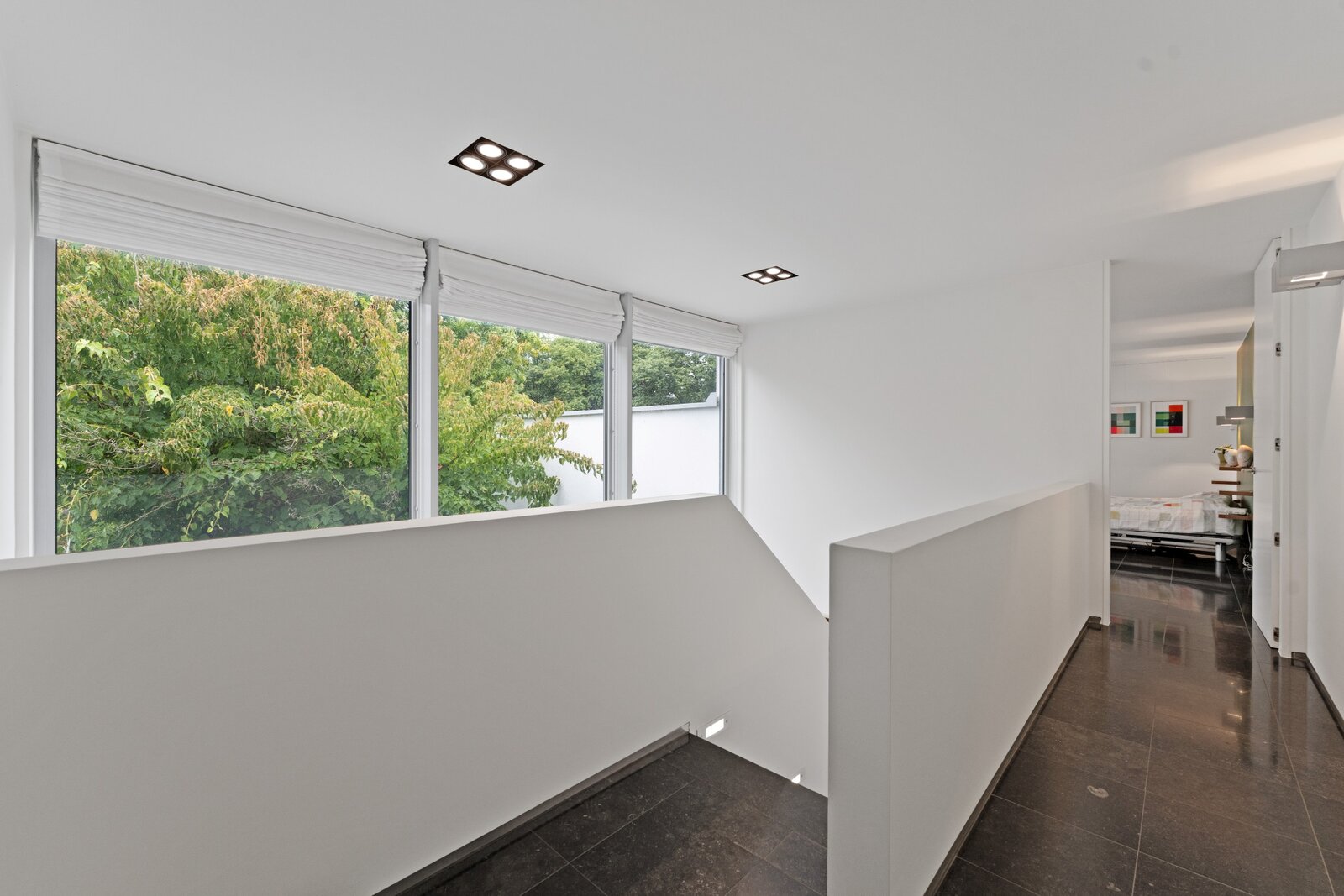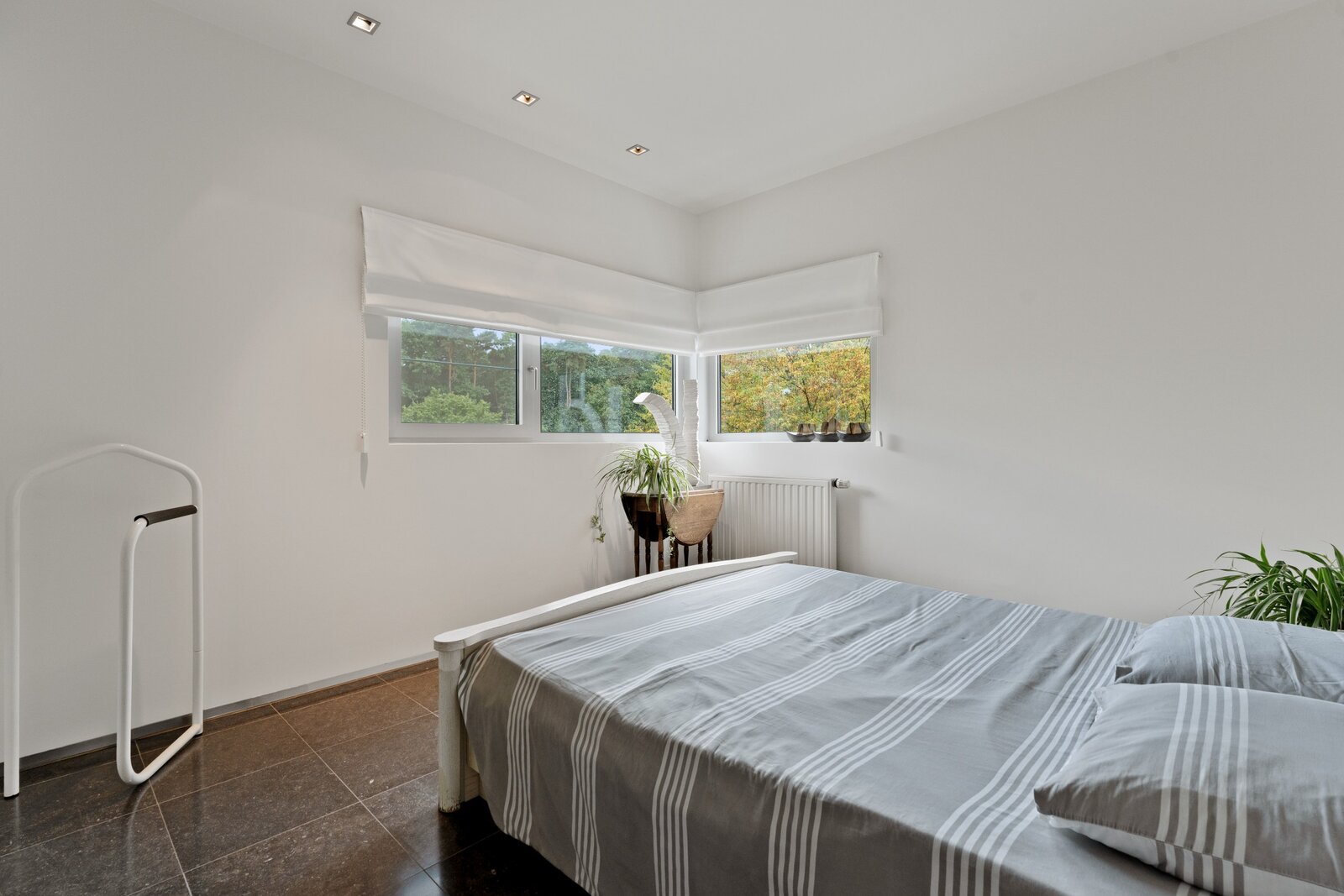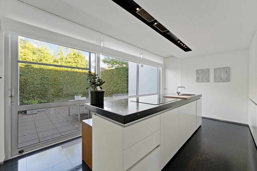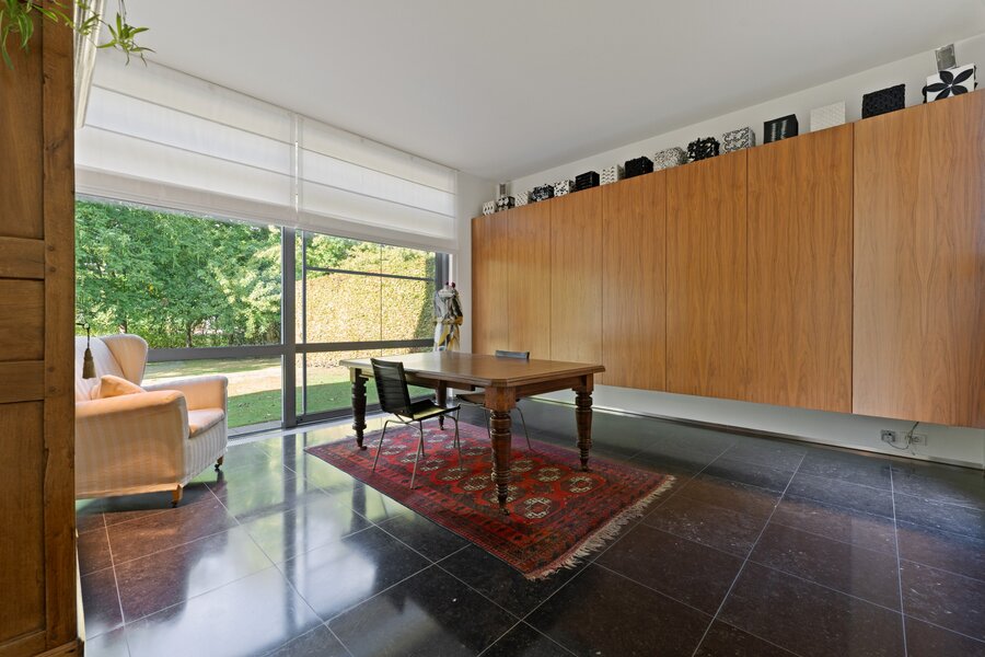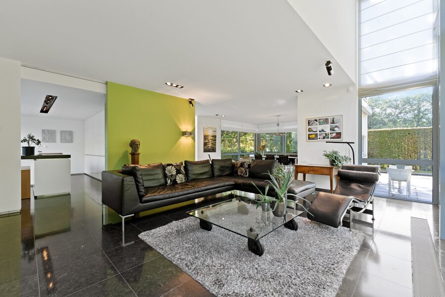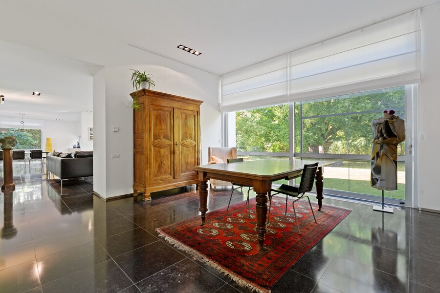 U betreedt de woning vanuit de centrale inkomhal met vestiaire en apart toilet. Voorts gaat u verder naar het leefgedeelte dat is voorzien van zithoek, eetruimte en bijkomende ruimte voorzien van ingemaakte kasten waarbij het mogelijk is deze te gebruiken als extra zithoek, hobbykamer of extra slaapkamer. Het leefgedeelte is voorzien van plafondhoge ramen waardoor deze ruimtes baden in het daglicht en u overal zicht heeft op de groene omgeving. De keuken is open maar is afsluitbaar langs twee kanten met schuifdeuren. Deze is voorzien van een natuurstenen werkblad en van de nodige toestellen (vaatwasmachine, inductievuur, combi oven, koelkast met vriesvak) en beschikt over een naastgelegen berging met koelcel.