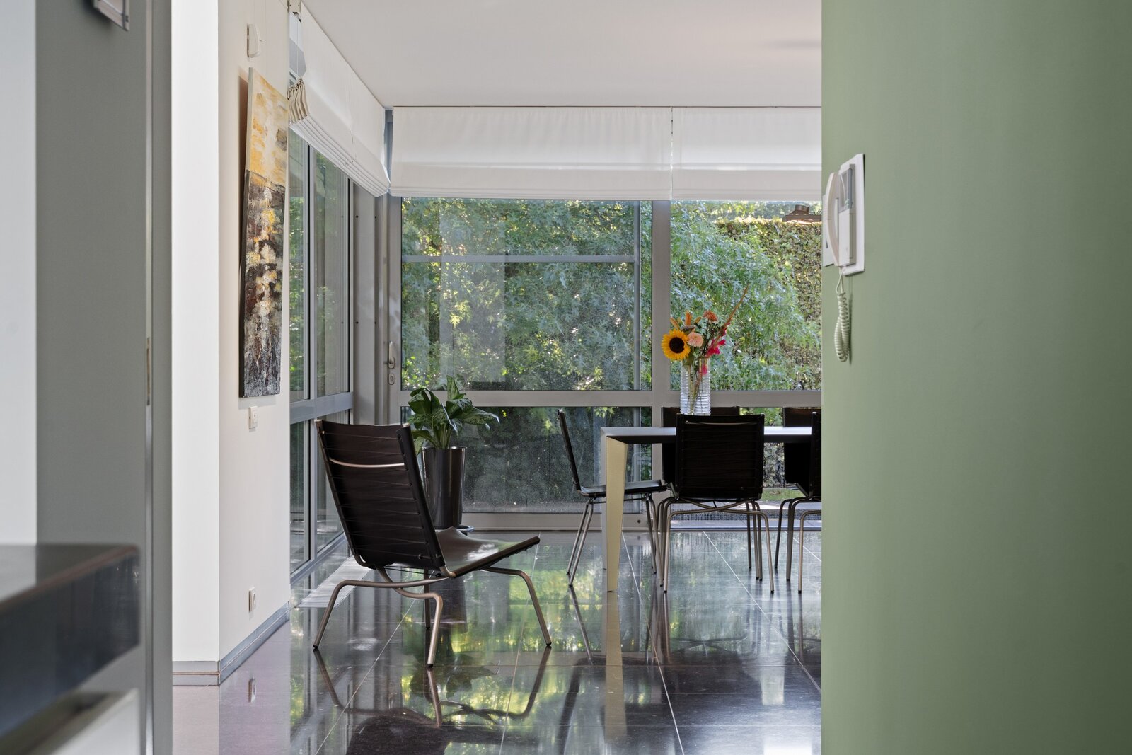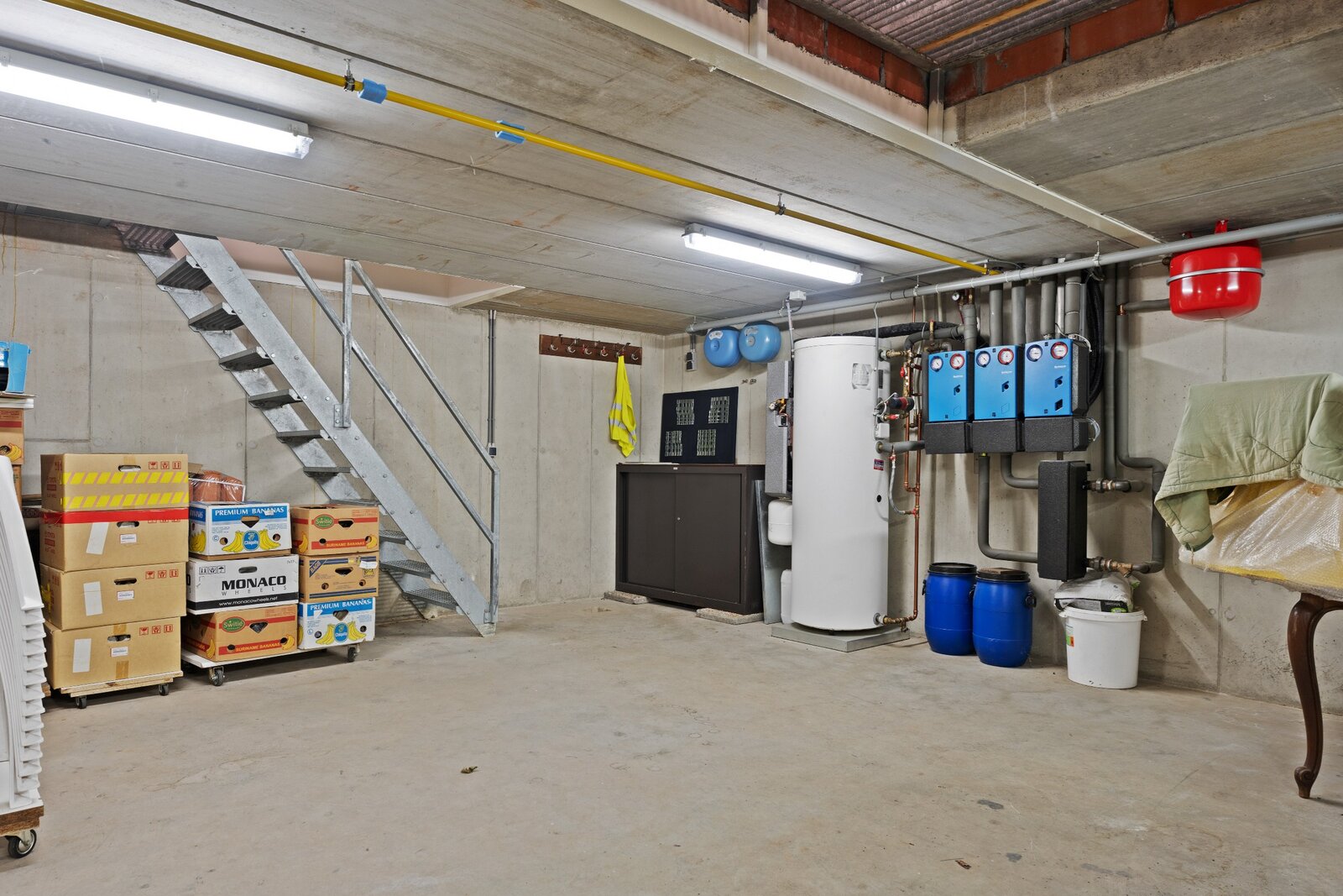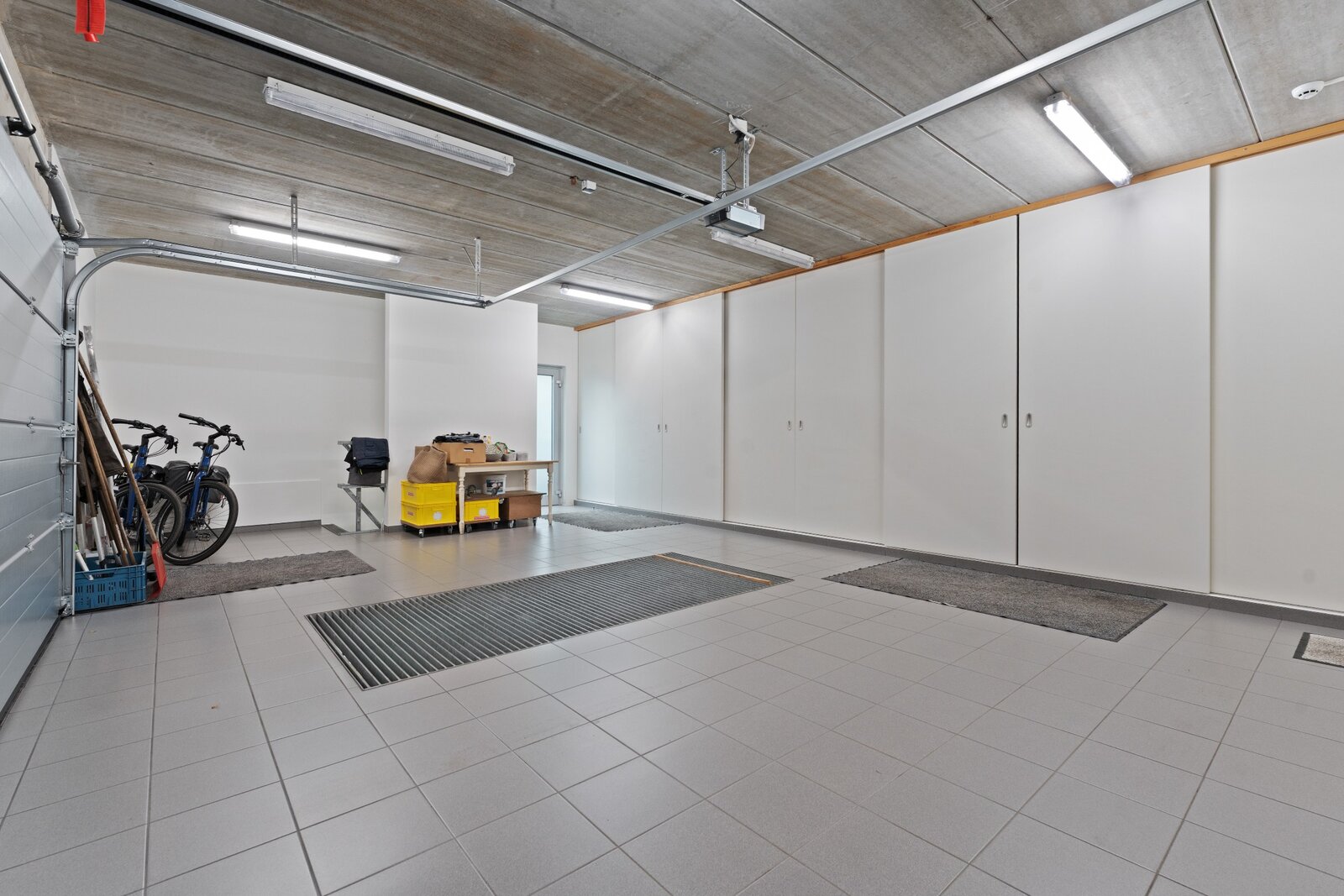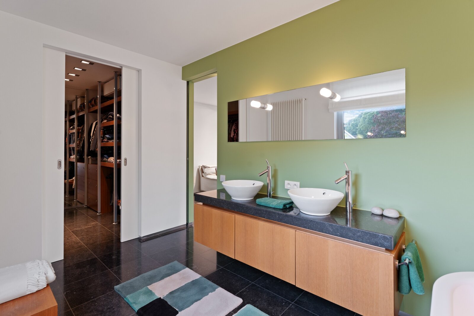 U betreedt de woning vanuit de centrale inkomhal met vestiaire en apart toilet. Voorts gaat u verder naar het leefgedeelte dat is voorzien van zithoek, eetruimte en bijkomende ruimte voorzien van ingemaakte kasten waarbij het mogelijk is deze te gebruiken als extra zithoek, hobbykamer of extra slaapkamer. Het leefgedeelte is voorzien van plafondhoge ramen waardoor deze ruimtes baden in het daglicht en u overal zicht heeft op de groene omgeving. De keuken is open maar is afsluitbaar langs twee kanten met schuifdeuren. Deze is voorzien van een natuurstenen werkblad en van de nodige toestellen (vaatwasmachine, inductievuur, combi oven, koelkast met vriesvak) en beschikt over een naastgelegen berging met koelcel.