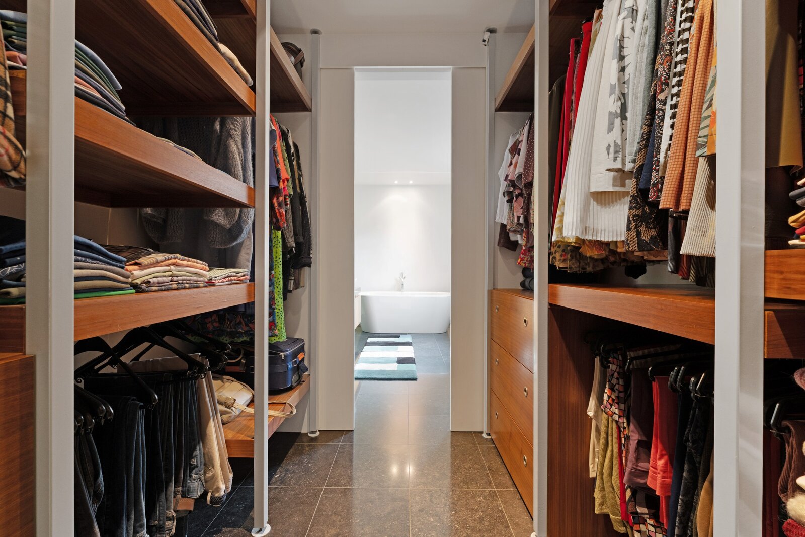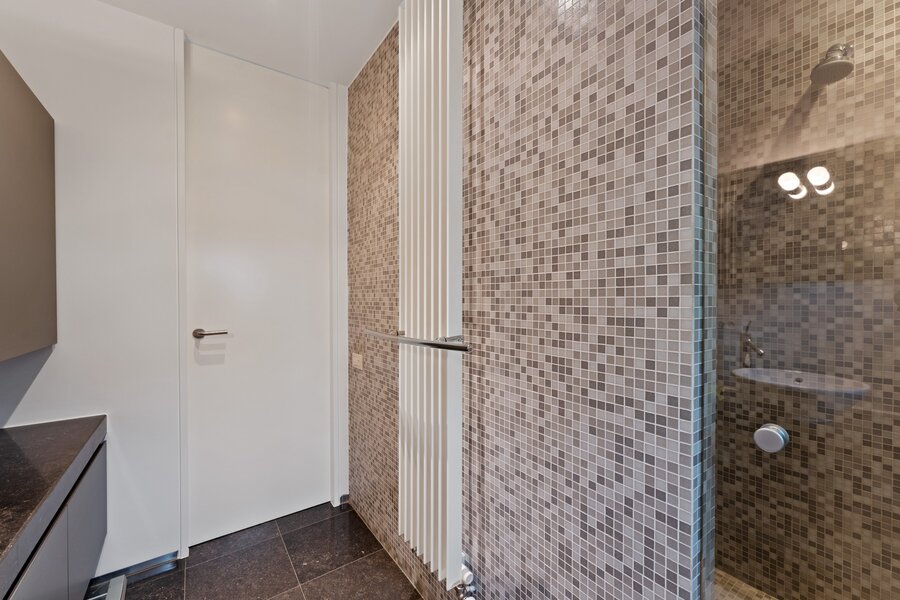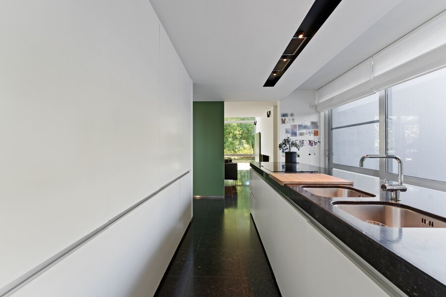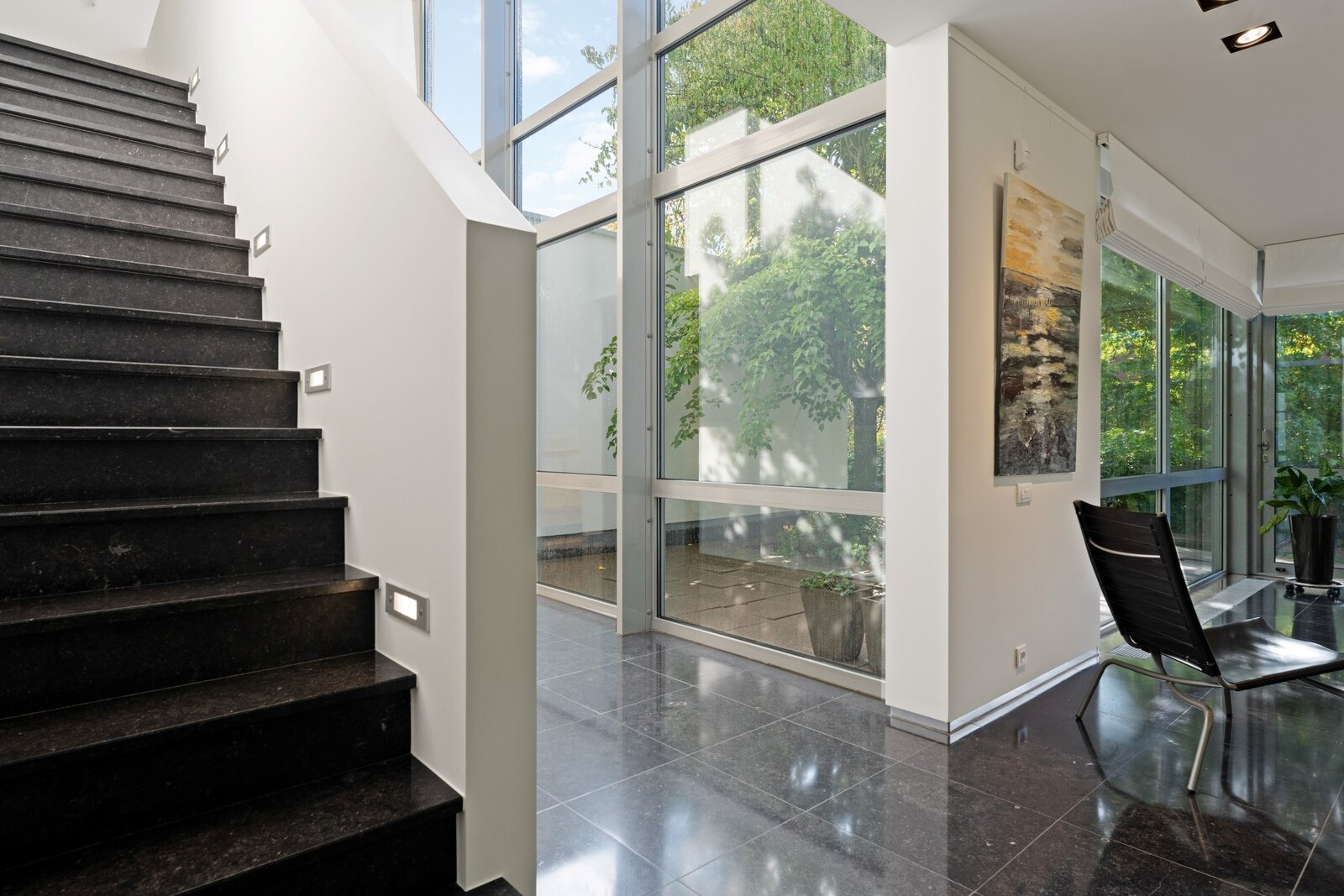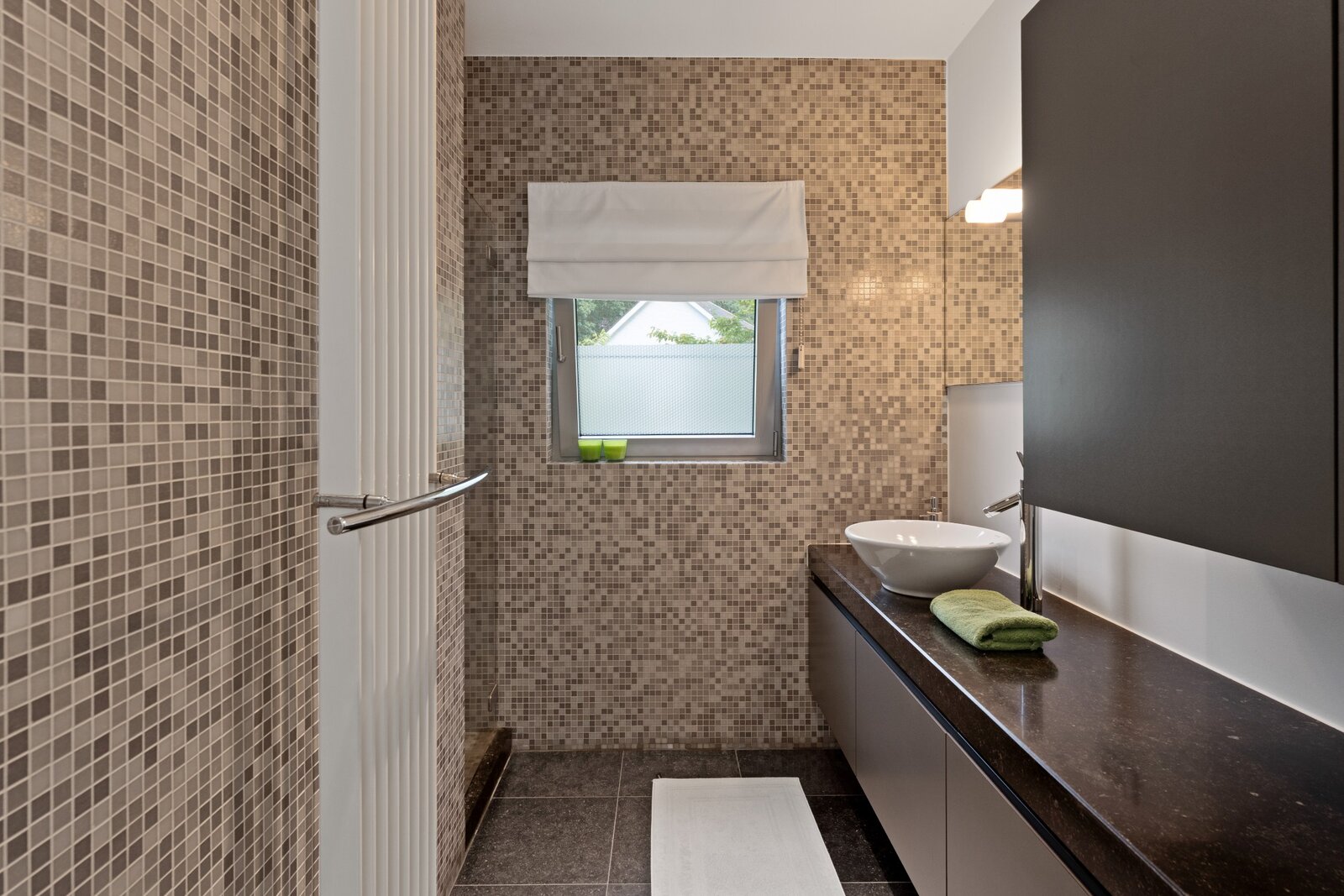 U betreedt de woning vanuit de centrale inkomhal met vestiaire en apart toilet. Voorts gaat u verder naar het leefgedeelte dat is voorzien van zithoek, eetruimte en bijkomende ruimte voorzien van ingemaakte kasten waarbij het mogelijk is deze te gebruiken als extra zithoek, hobbykamer of extra slaapkamer. Het leefgedeelte is voorzien van plafondhoge ramen waardoor deze ruimtes baden in het daglicht en u overal zicht heeft op de groene omgeving. De keuken is open maar is afsluitbaar langs twee kanten met schuifdeuren. Deze is voorzien van een natuurstenen werkblad en van de nodige toestellen (vaatwasmachine, inductievuur, combi oven, koelkast met vriesvak) en beschikt over een naastgelegen berging met koelcel.