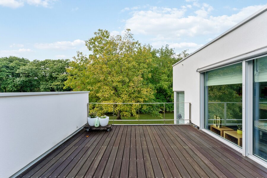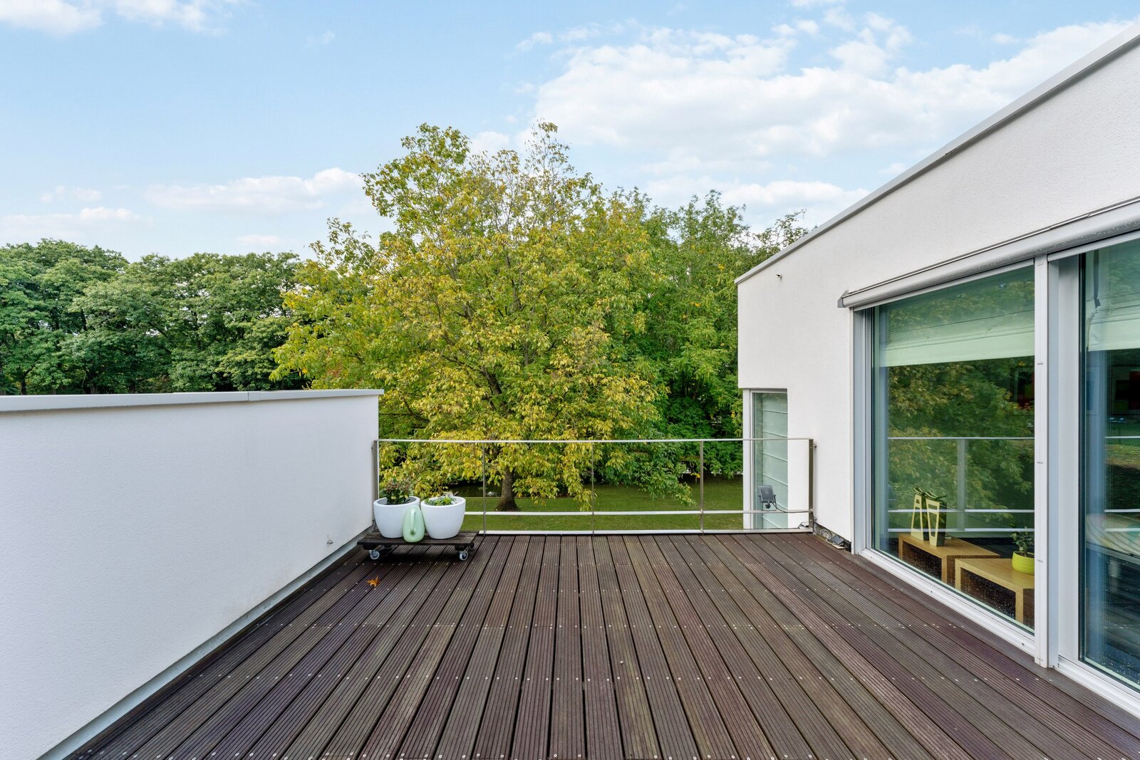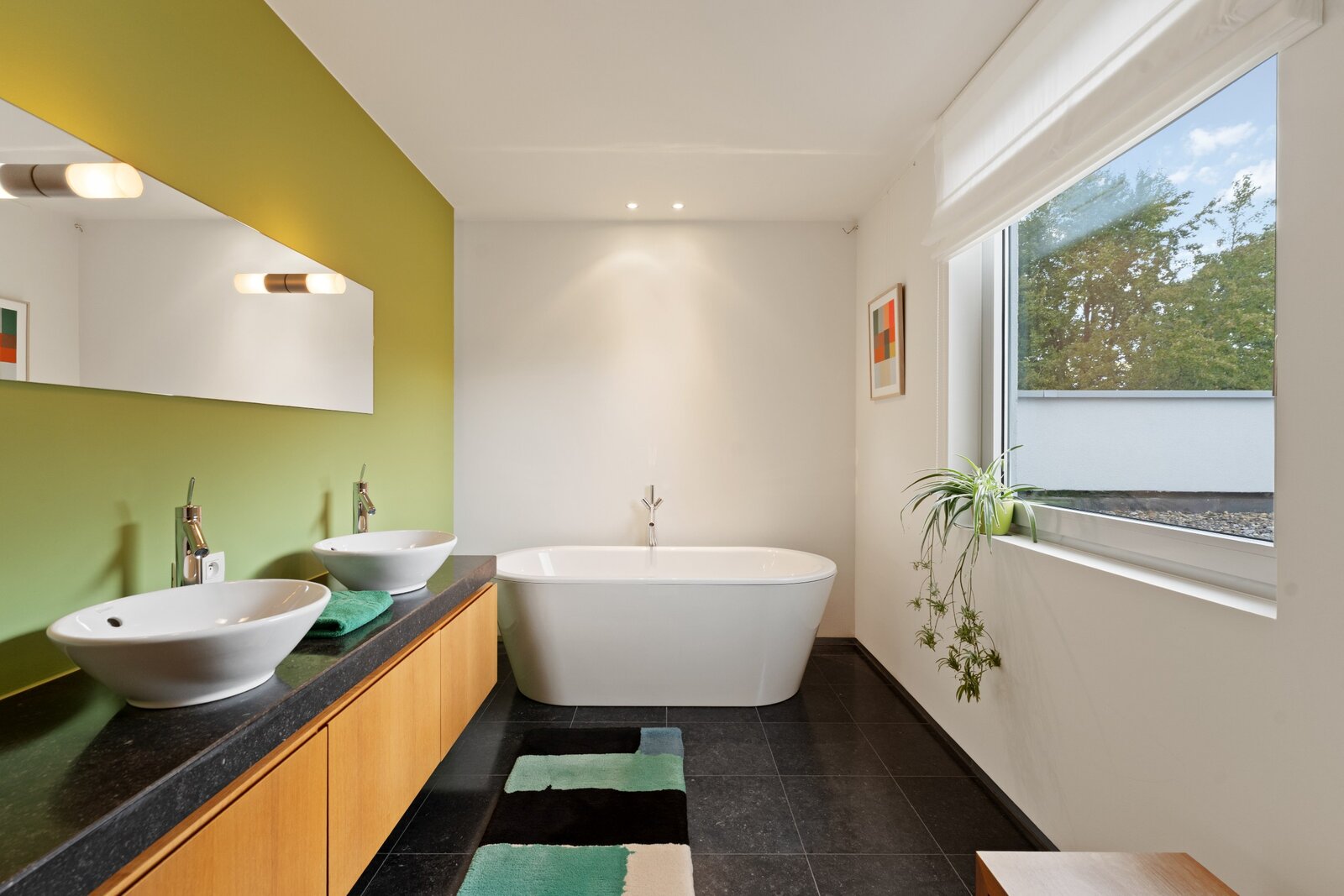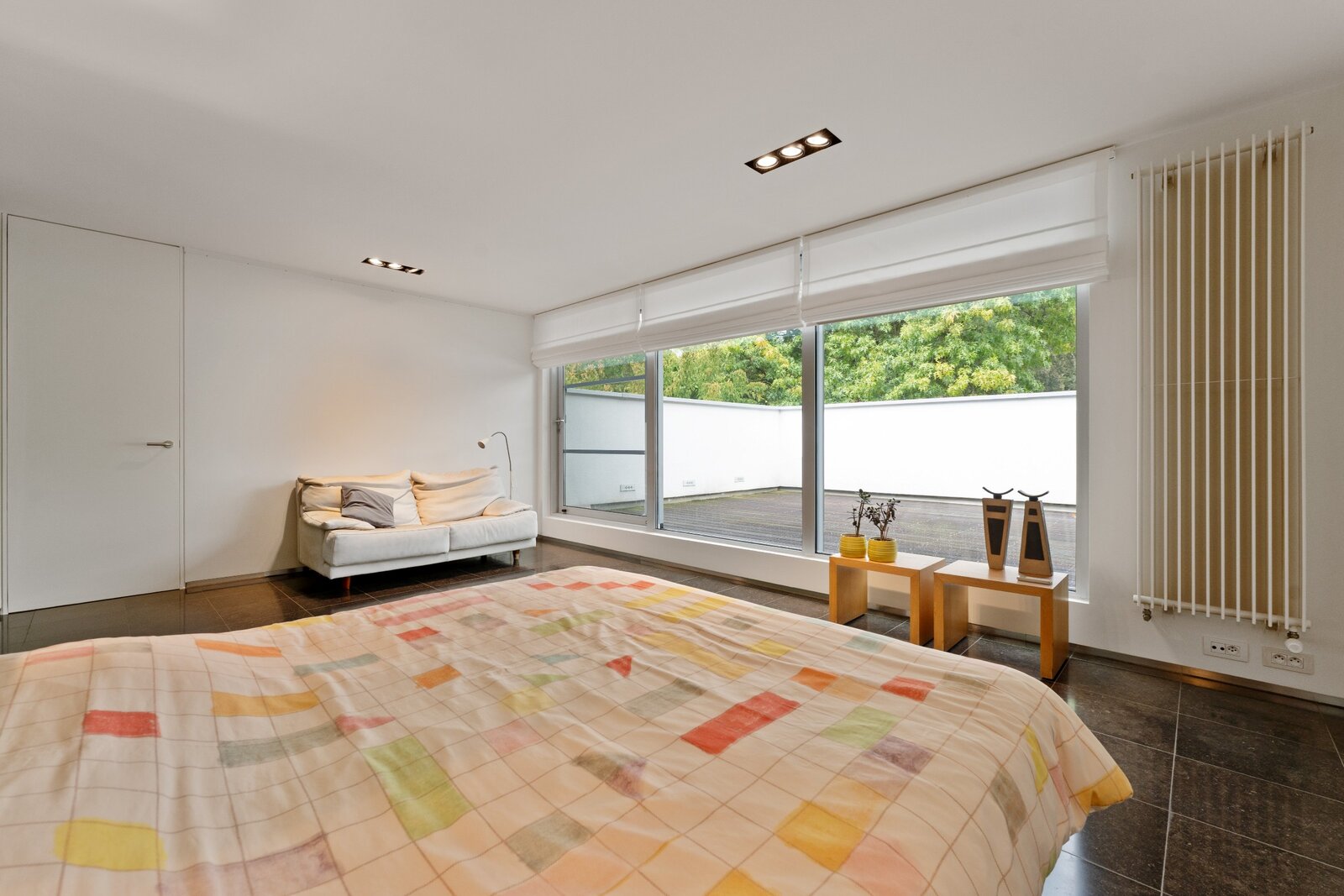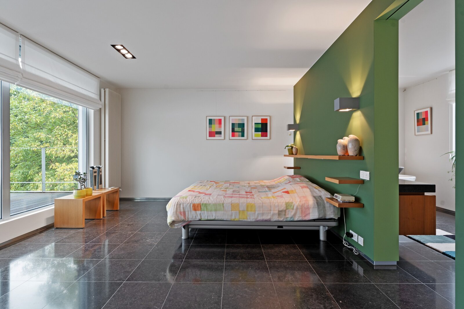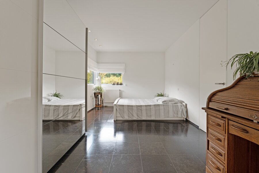 Op de verdieping bevindt er zich enerzijds een royale master bedroom met dressing en ensuite badkamer met ligbad en dubbele lavabo. Deze kamer beschikt eveneens over een eigen balkon met zicht op de achterliggende tuin. Anderzijds vinden we een tweede slaapkamer terug die de mogelijkheid biedt om deze op te splitsen in twee aparte slaapkamers. Verder ook een tweede badkamer met douche en lavabomeubel, apart toilet en wasplaats met ingemaakte kasten.