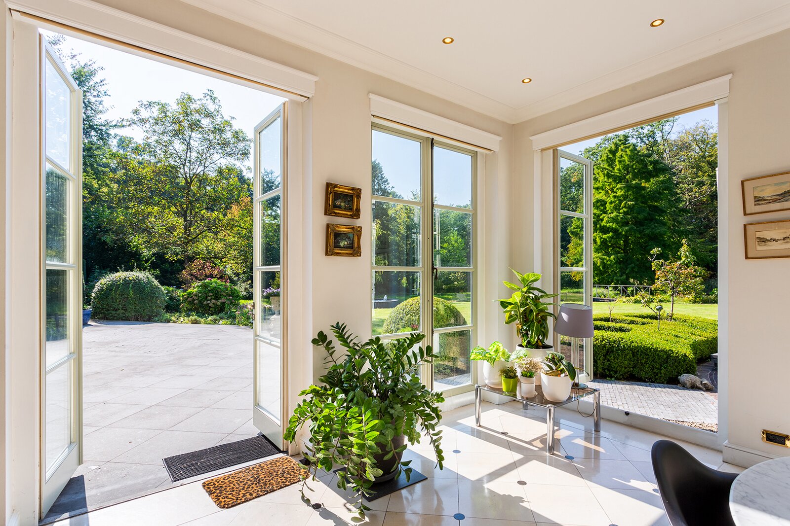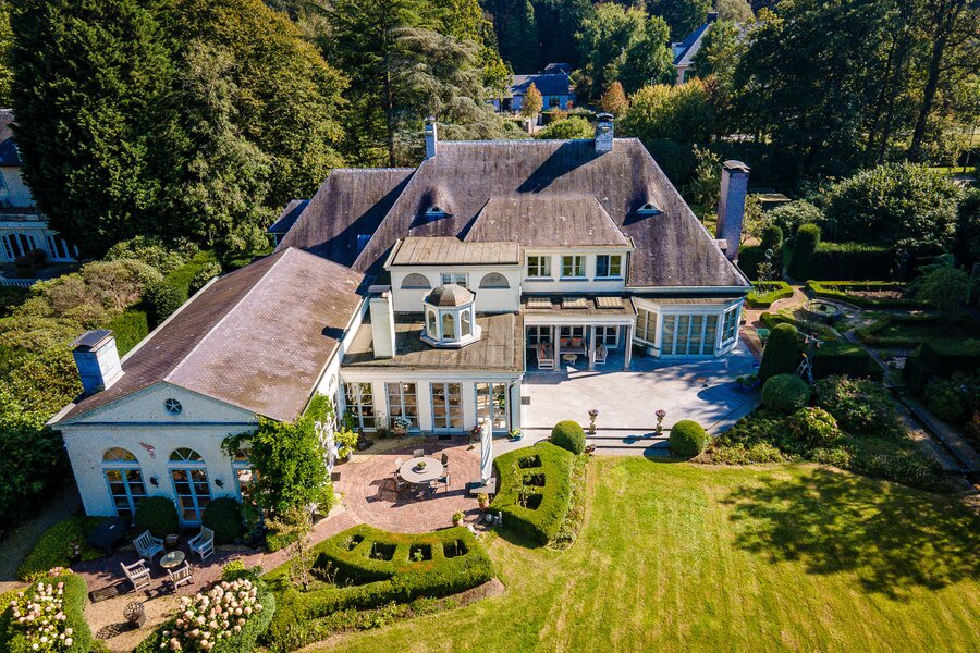 Bij binnenkomst verwelkomt de royale hal u en leidt u links naar een salon en een ruime woonkamer, beide met een prachtig uitzicht op de zorgvuldig aangelegde, groene tuin. Vanuit de woonkamer loopt u via een deur naar een aparte eetkamer. Verderop in de eetkamer komt u in de volledig uitgeruste keuken, die aansluit op een ruime familiekamer met directe toegang tot het luxueuze binnenzwembad. Rechts in de inkomhal bevindt zich een stijlvolle bureau en een praktische vestiaire. De woning beschikt over twee inpandige garages, waarbij de meest rechtse garage toegang biedt tot een volledig uitgeruste fitnessruimte, een kleedkamer en een ontspannende spa met een Turks bad.