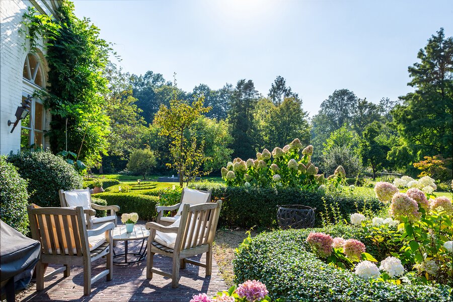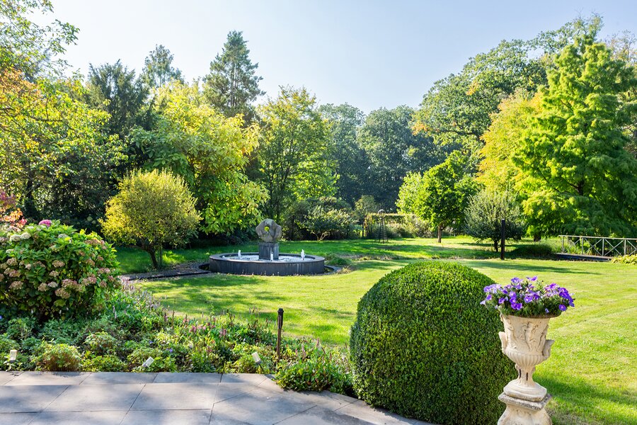 Buiten is de tuin een oase van rust, prachtig afgewerkt met verschillende terrassen, een vijver en fraai aangelegde paden, die samen zorgen voor een harmonieuze en ontspannen sfeer.