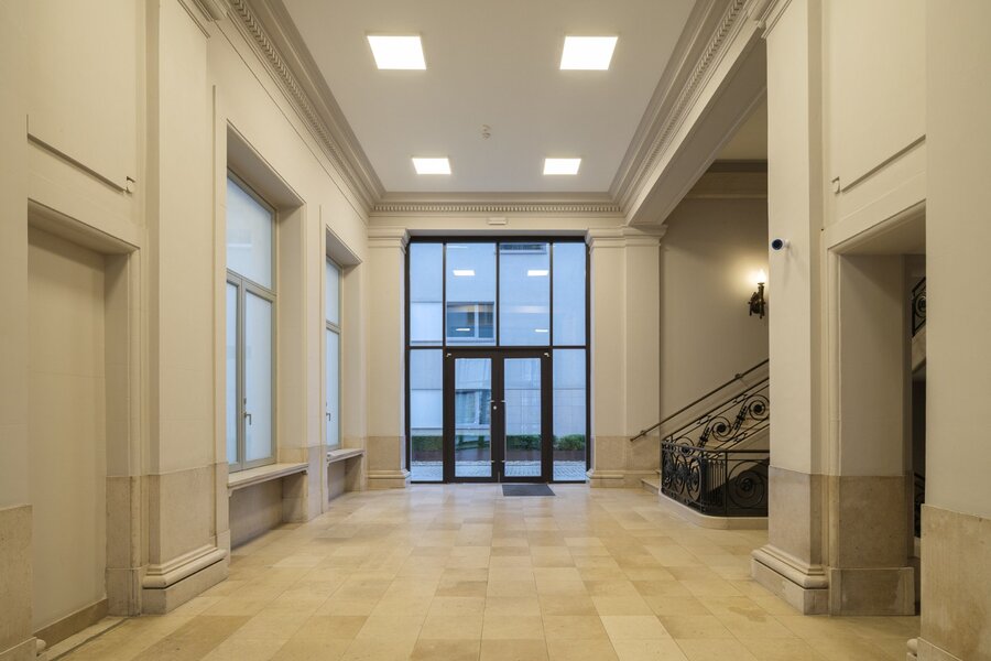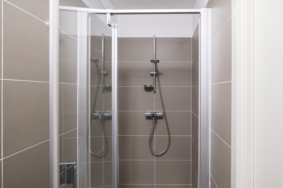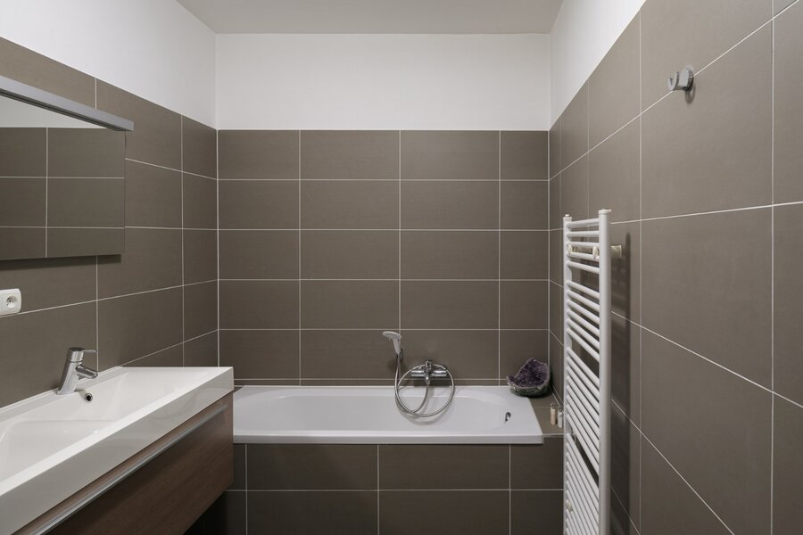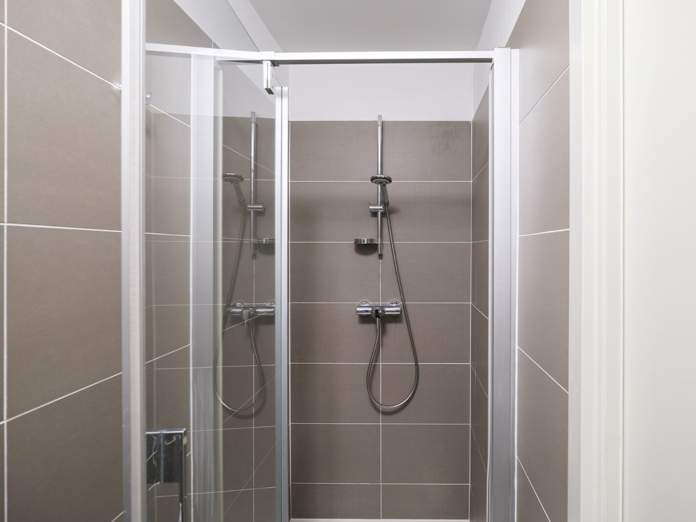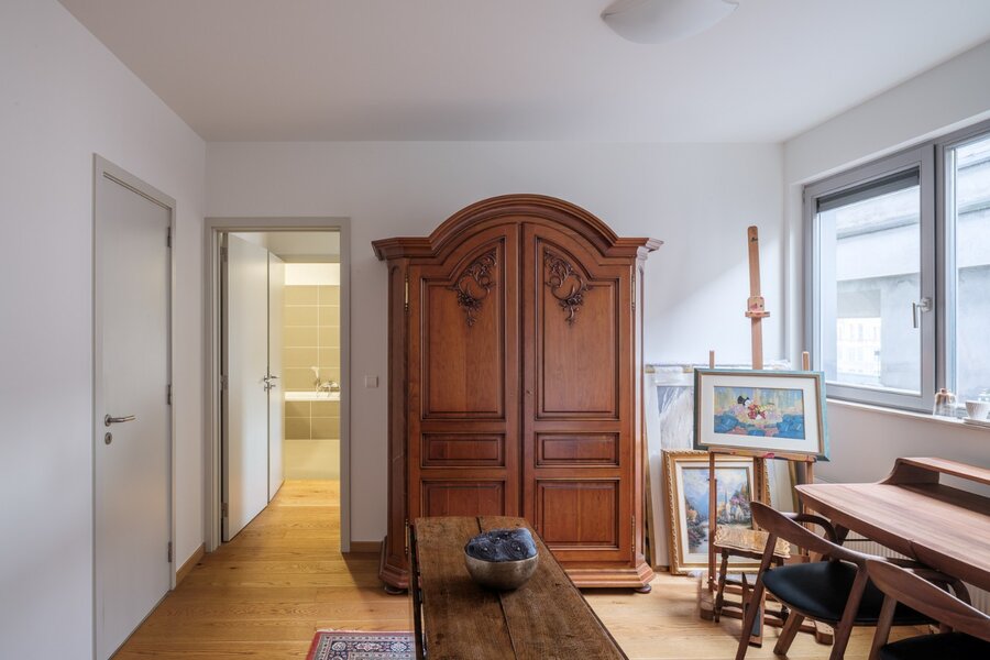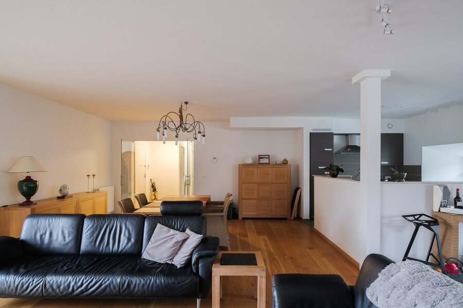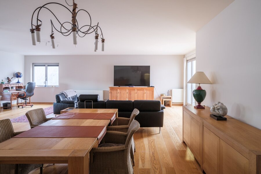 Er zijn twee badkamers: één met ligbad, dubbele wastafel en toilet, en een aparte douchekamer met douche en lavabo. De praktische berging met aansluiting voor een wasmachine zorgt voor extra comfort. De afwerking is stijlvol en warm, met een overwegend parketvloer die het geheel een tijdloze uitstraling geeft.