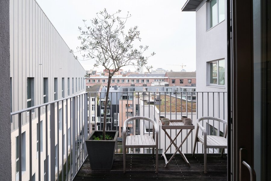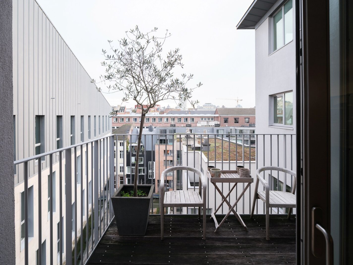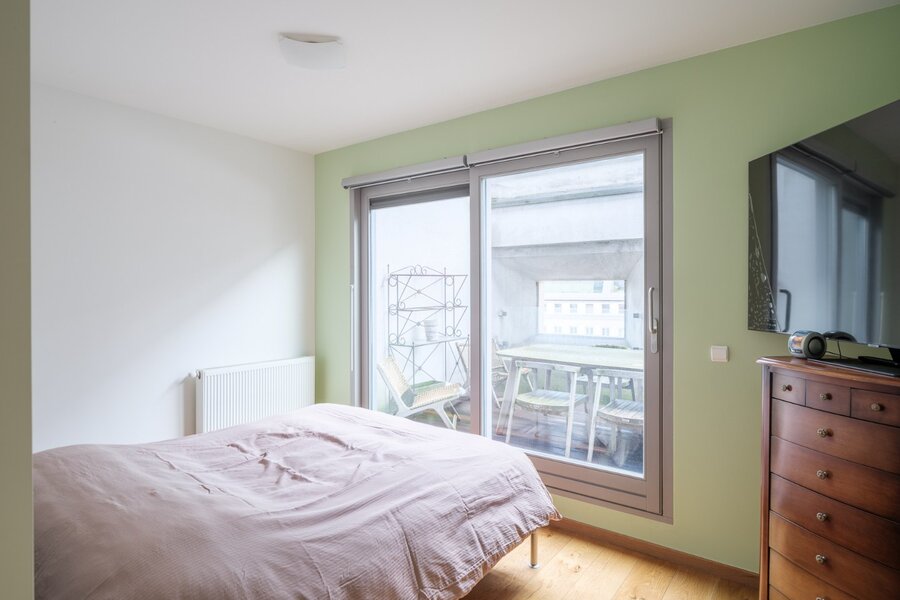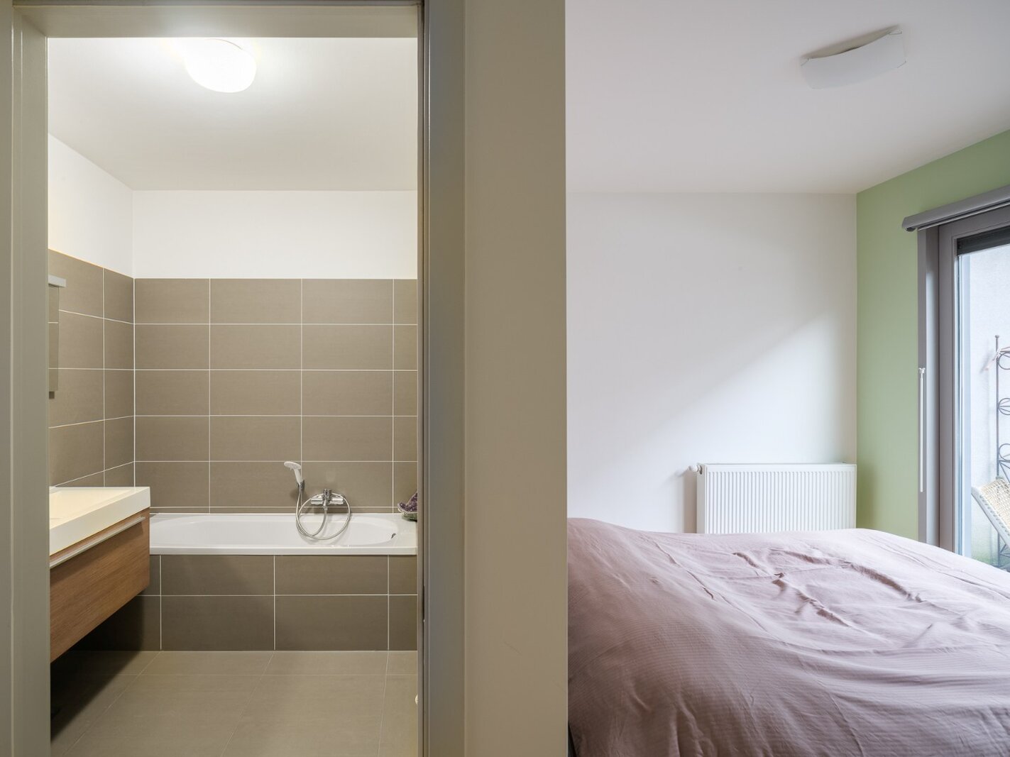 Het appartement beschikt over twee volwaardige slaapkamers (13 m² en 15 m²), elk met directe toegang tot het knusse binnenterras met zicht op de Kouter – een zeldzame troef in het centrum.