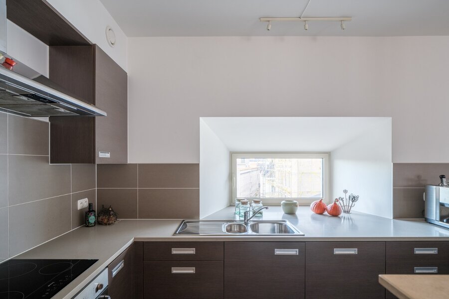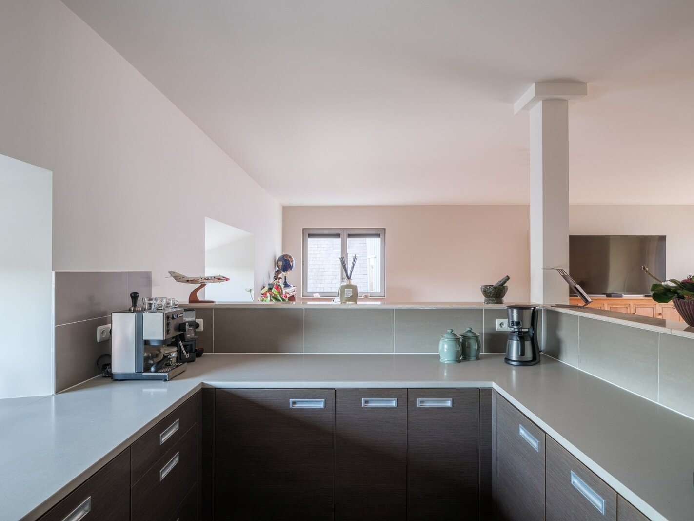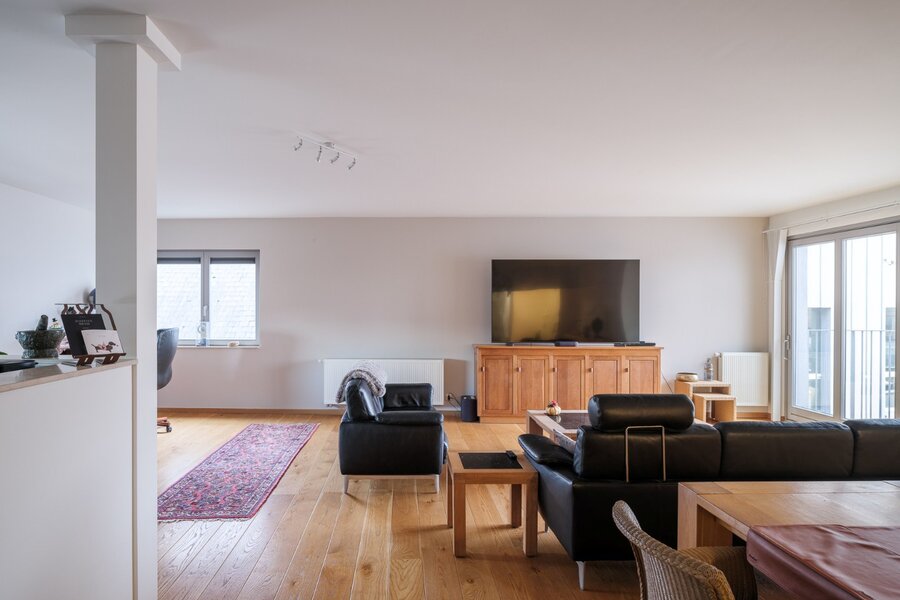 Via de inkomhal, die ook perfect dienst kan doen als bureau, betreed je de royale leefruimte van maar liefst 65 m². De grote raampartijen en het zuidgerichte terras brengen licht en lucht binnen. Aansluitend vind je de open, volledig uitgeruste keuken met oven, keramische kookplaat, koelkast, dampkap en vaatwasser – ideaal voor wie graag kookt en ontvangt.