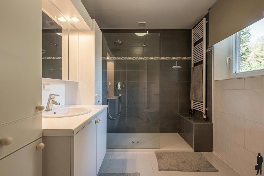 Tweede badkamer met inloopdouche, wastafel en toilet