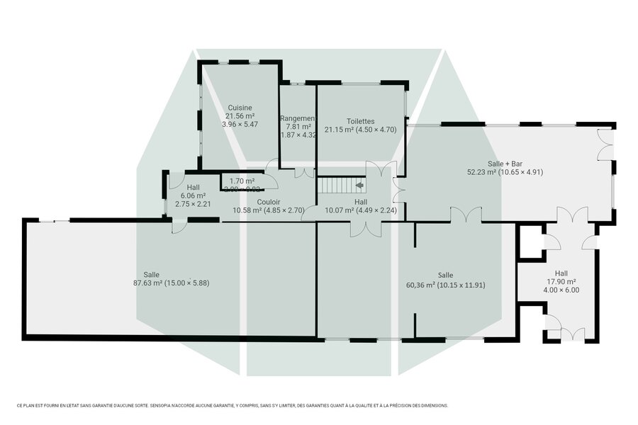 The 3 halls of 90m², 60m² and 50m², as well as the bar, were fully renovated in 2023. A professional kitchen is ideally located to serve the spaces. Separate ladies’ and gents’ toilets complete this level.