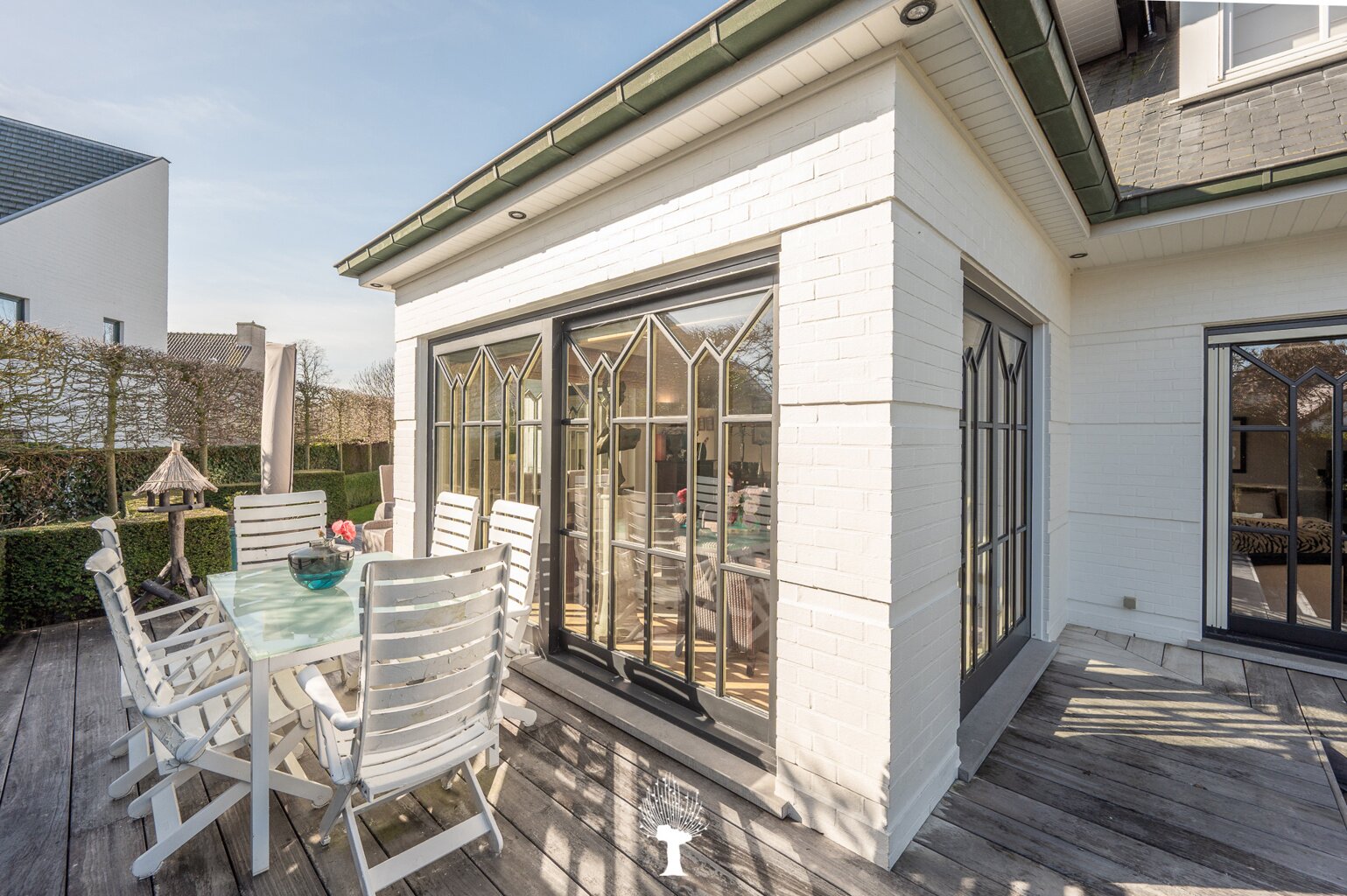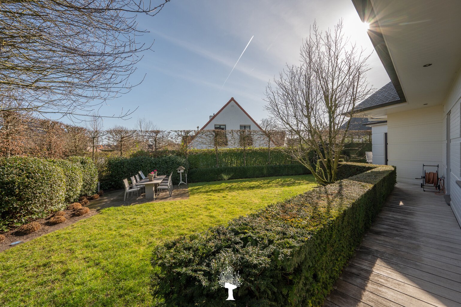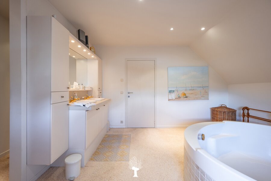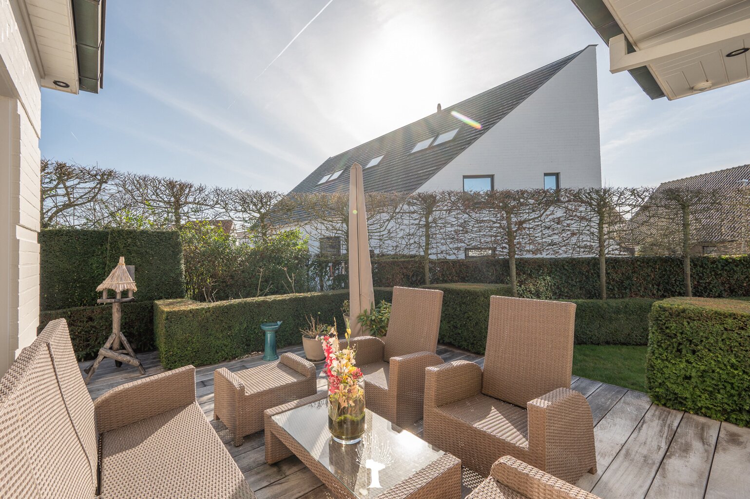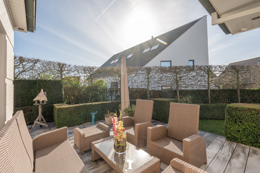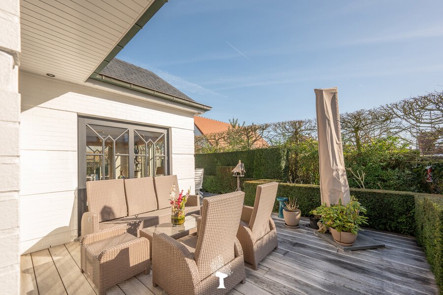 Aangename alleenstaande villa , fraai gelegen in een rustige villawijk aan de rand van het Zoute, op loopafstand van vele winkels. Samenstelling : Royale inkomhall met vestiaire en toilet. Apart bureel. Ruime woonkamer met gashaard. Eetkamer. Ingerichte keuken voorzien van alle moderne huishoudapparaten en gezellige eethoek, alles uitgevend op het terras en de tuin. Bijkeuken/wasplaats. Op de 1ste verdieping : 2 zéér ruime slaapkamers met veel lichtinval. Praktische douchekamer met 2 wastafels. Master bedroom met dressing en privatief terras. Badkamer met ligbad, dubbele lavabo, douche en toilet. Ruime zolder. Garage voor 2 wagens. Meerdere staanplaatsen voor de villa. Zeer degelijke afwerking. Bezoek gaarne na afspraak in één van onze kantoren.