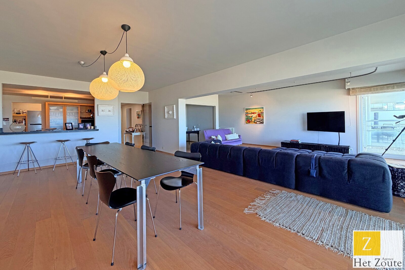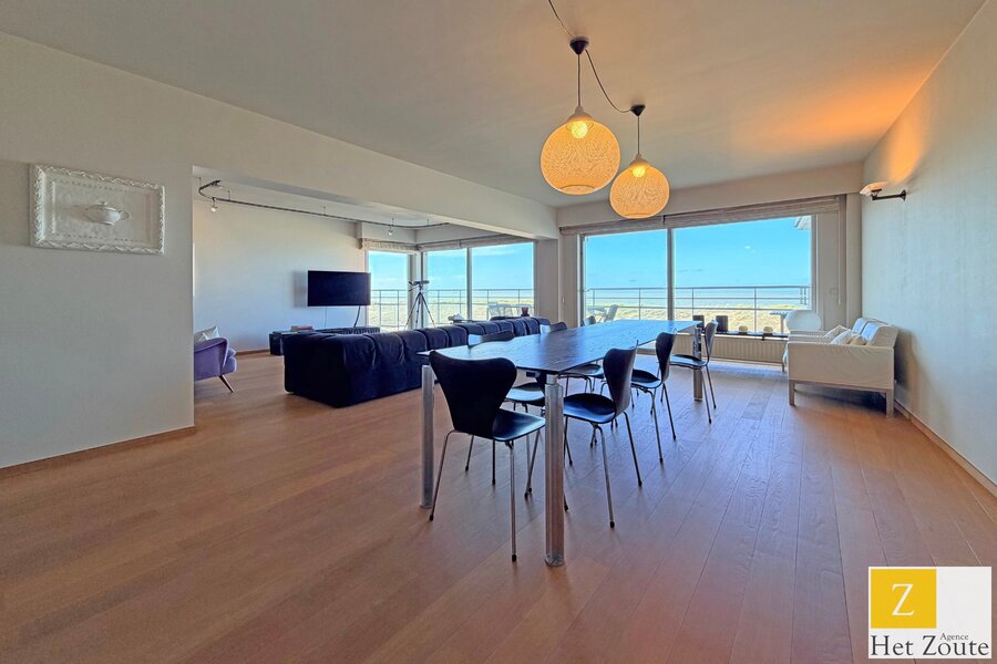 Aan de iconische Wandeldijk in het Zoute bevindt zich dit uitzonderlijk appartement met een gevelbreedte van circa 12 meter en een indrukwekkend frontaal zicht op zee. Deze exclusieve ligging combineert een panoramisch uitzicht met een zeldzaam gevoel van ruimte en privacy. Het appartement biedt een royale leefruimte en eetkamer waar grote raampartijen zorgen voor overvloedig lichtinval en een directe connectie met de unieke kustlijn. De open keuken sluit naadloos aan bij de leefruimte en draagt bij aan het open karakter van het appartement.