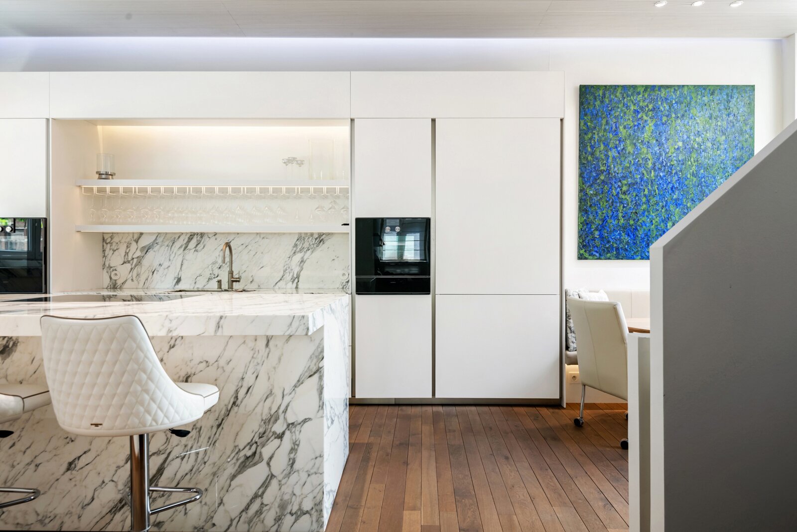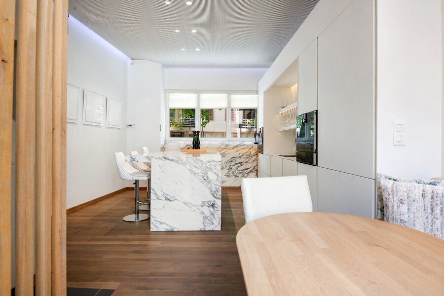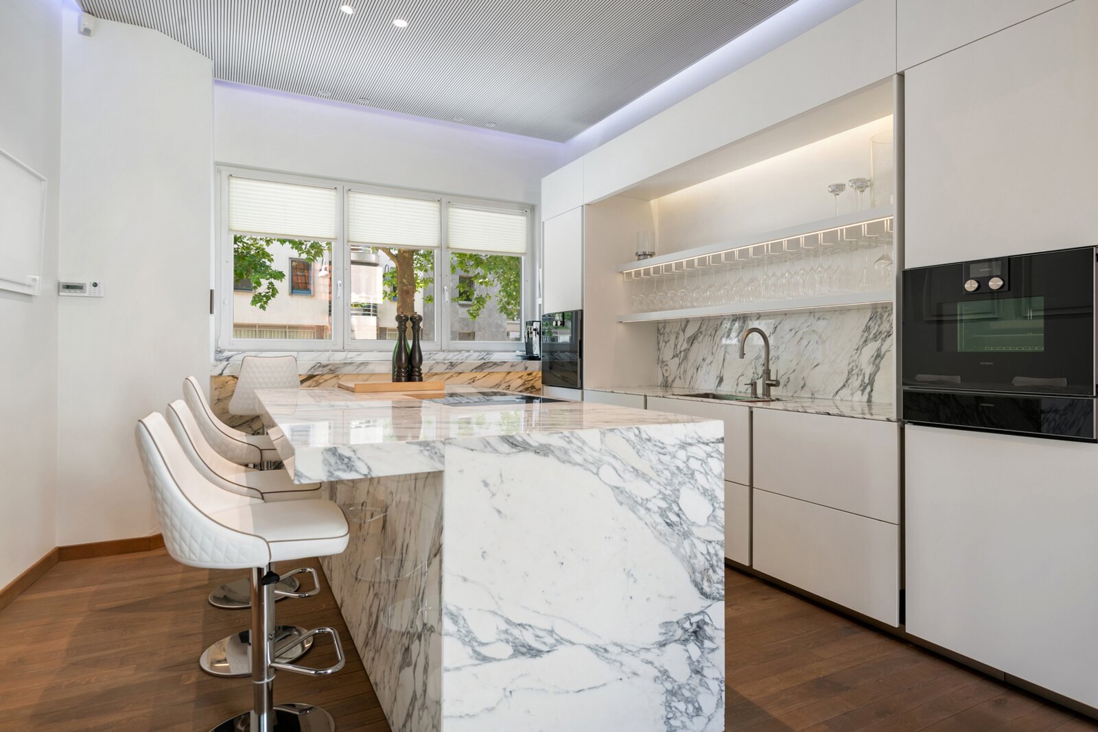 On the first floor, the impressive living kitchen immediately draws attention. The space is finished with attention to detail and equipped with a striking white marble kitchen island, high-quality built-in appliances, and a thoughtful layout, an ideal place for those who love cooking and hospitality.