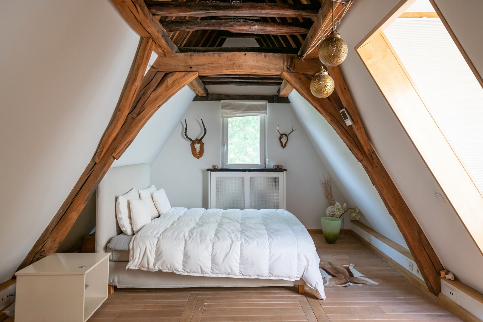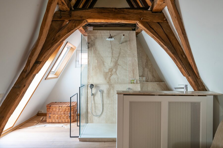 Behind the authentic facade lies a surprisingly spacious home, spread over multiple levels. The house features four bedrooms, three finished bathrooms, an integrated garage, and two pleasant terraces. Original elements such as wooden beams, historic flooring, and monumental fireplaces have been respectfully preserved, while the property is equipped with modern technologies such as central gas heating, solar panels, and an alarm system.