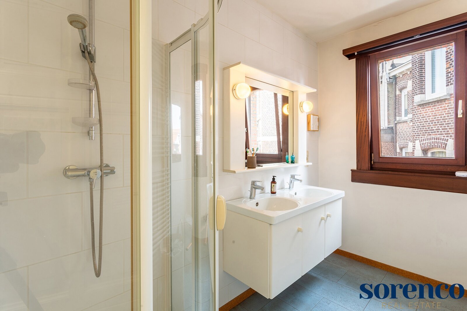 Via de inkomhal met mozaïekvloer komt u binnen in de lichtrijke woonkamer en eetruimte, beide voorzien van parket en een marmeren sierschouw. De volledig ingerichte keuken beschikt over opbergkasten en diverse toestellen, waaronder een 1,5 spoelbak, kookplaat, dampkap, koelkast, afwasmachine, magnetron en oven. Vanuit de leefruimte en keuken heeft u toegang tot het terras en de stadstuin. Daarnaast is er op de gelijkvloerse verdieping een apart toilet aanwezig.