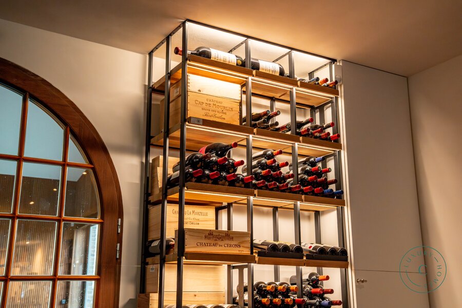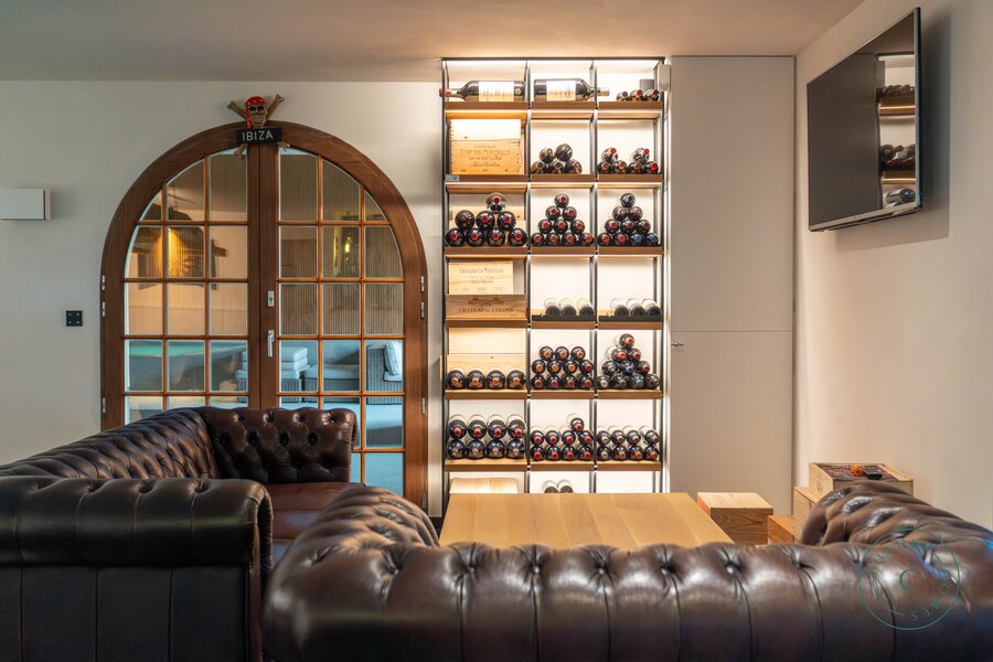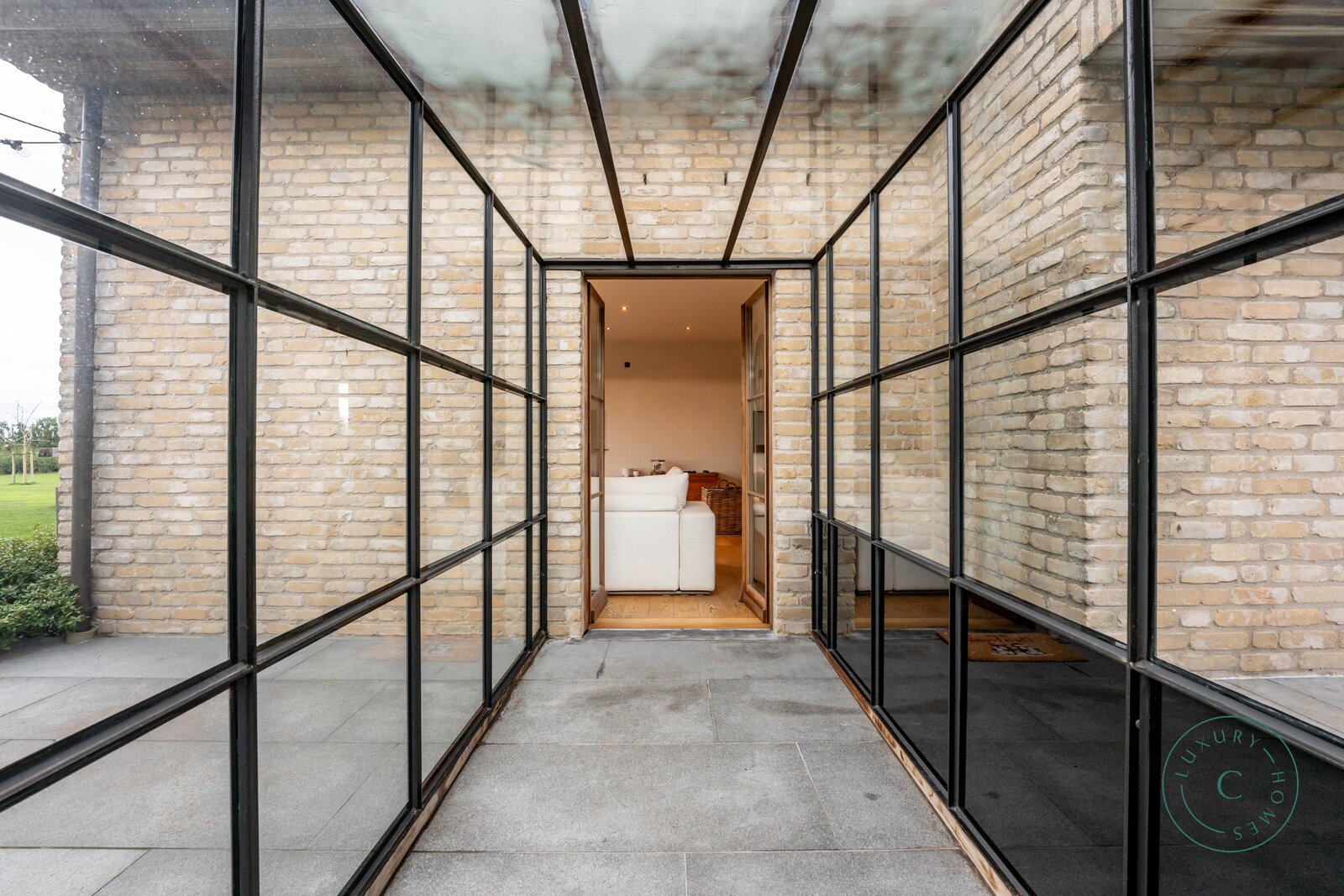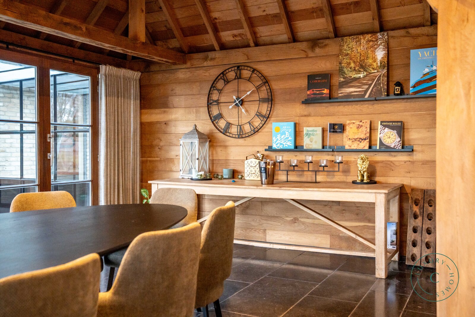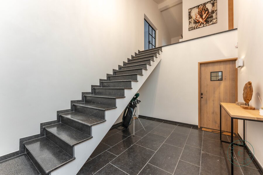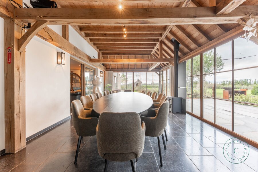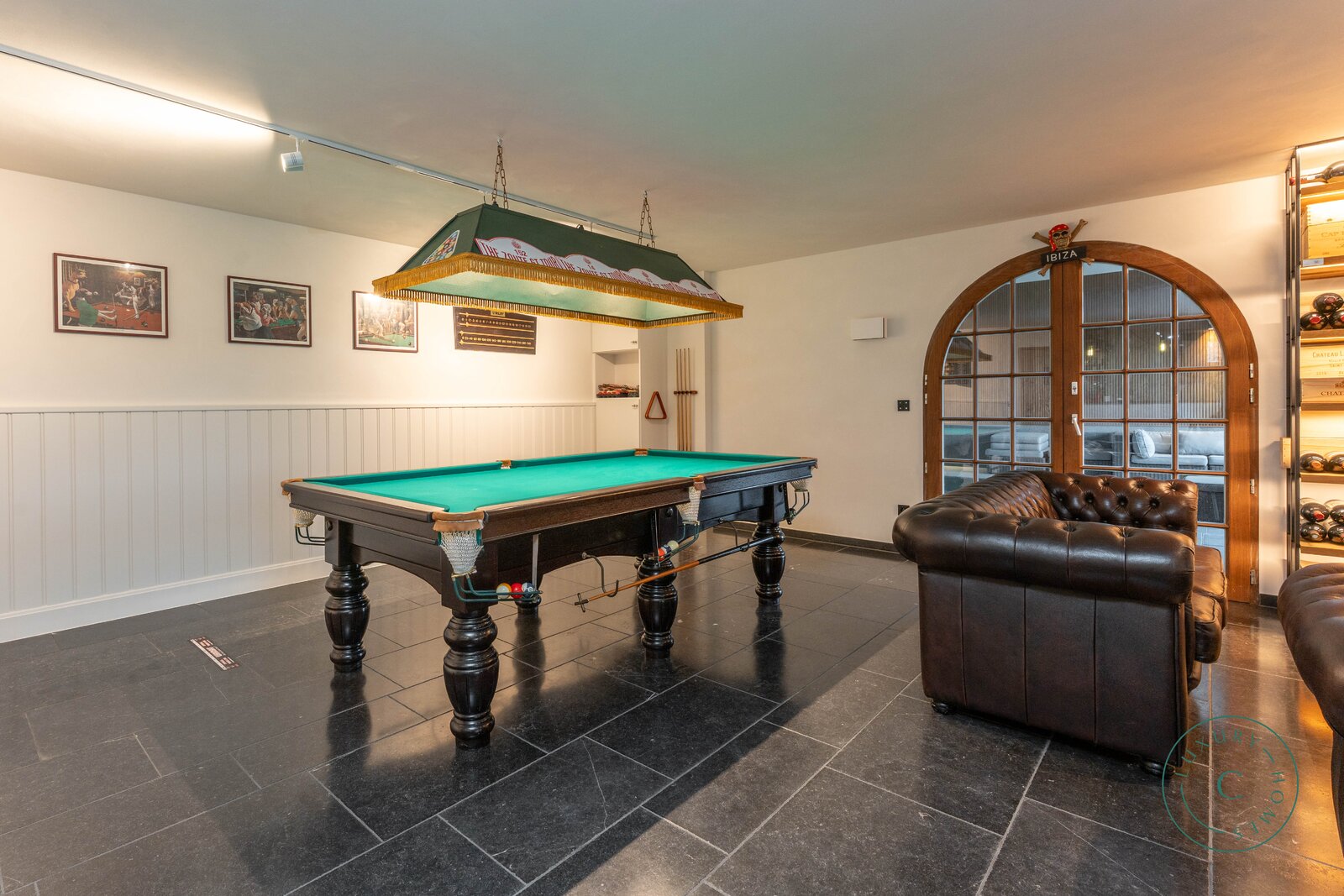 Op het gelijkvloers verbindt een stijlvol afgewerkte gang met ramen in smeedijzer de hoofdwoning met het bijgebouw. Hier vind je een polyvalente ruimte die vandaag gebruikt wordt als extra eetplaats, een gezellige ontspanningsruimte met zithoek en een stijlvolle wijnwand. Bovendien is er een volledig uitgeruste bar met ingerichte keuken, ideaal voor sfeervolle avonden met vrienden of familie.