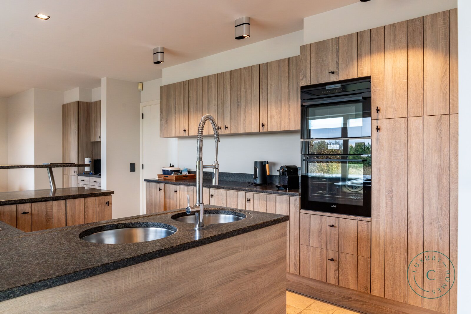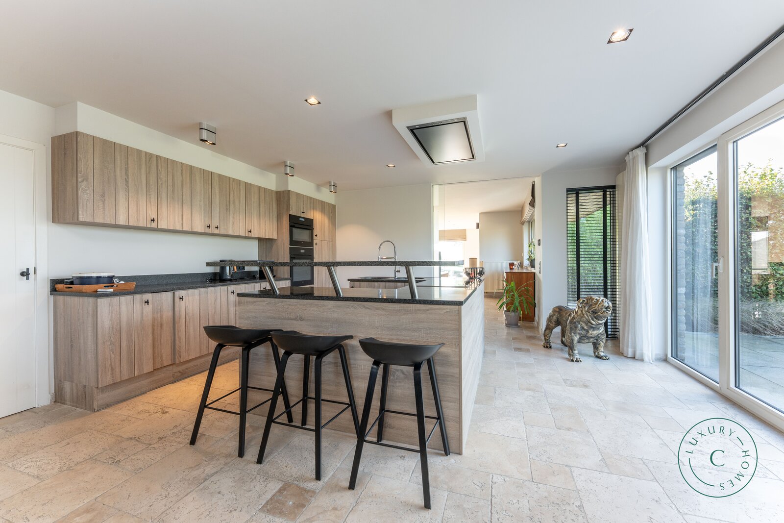 De hoofdwoning verwelkomt je met een lichtrijke leefruimte waar grote raampartijen zorgen voor een natuurlijke verbinding met de tuin. De zithoek met open haard en de aangrenzende eetplaats creëren een warme, huiselijke sfeer. Aansluitend bevindt zich de ruime leefkeuken, met directe toegang tot het terras en prachtig zicht op de zorgvuldig aangelegde tuin. De ideale plek om buiten te genieten van de stilte en de mooie verzichten.