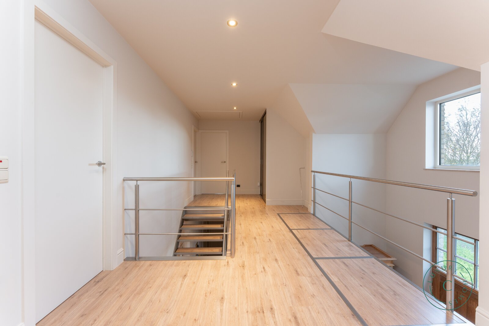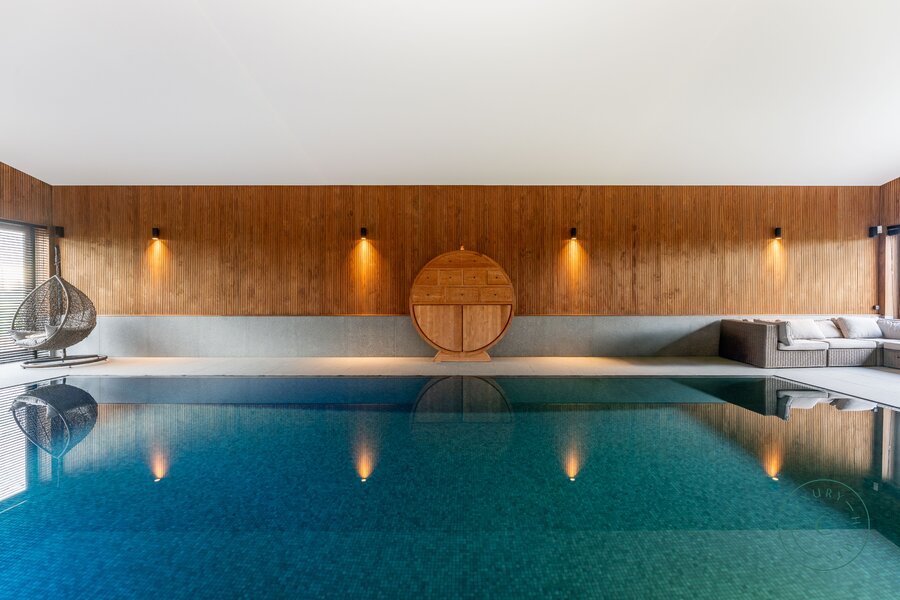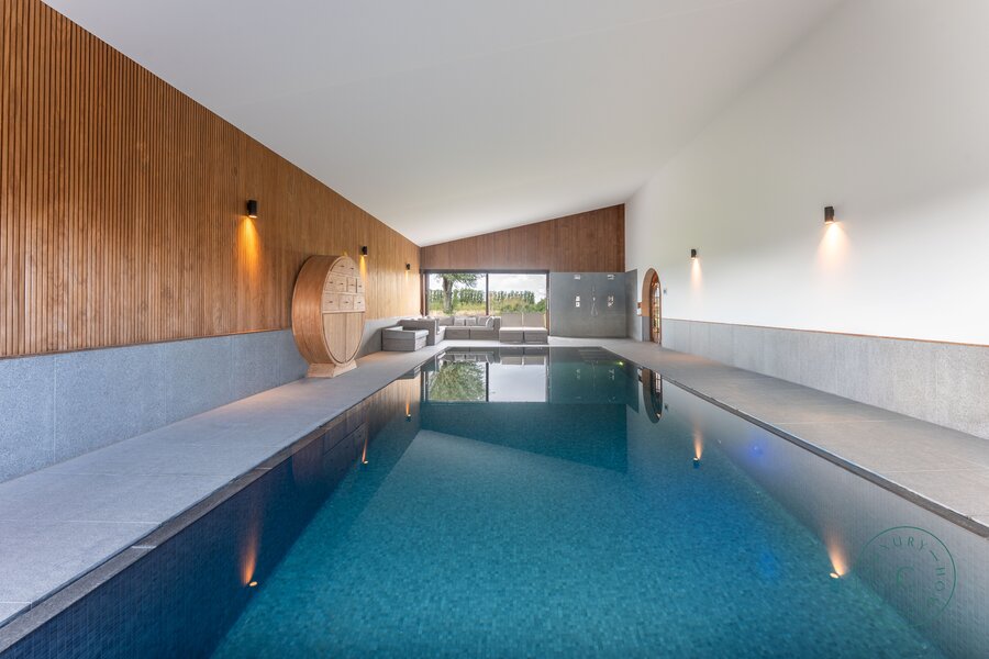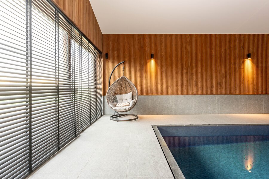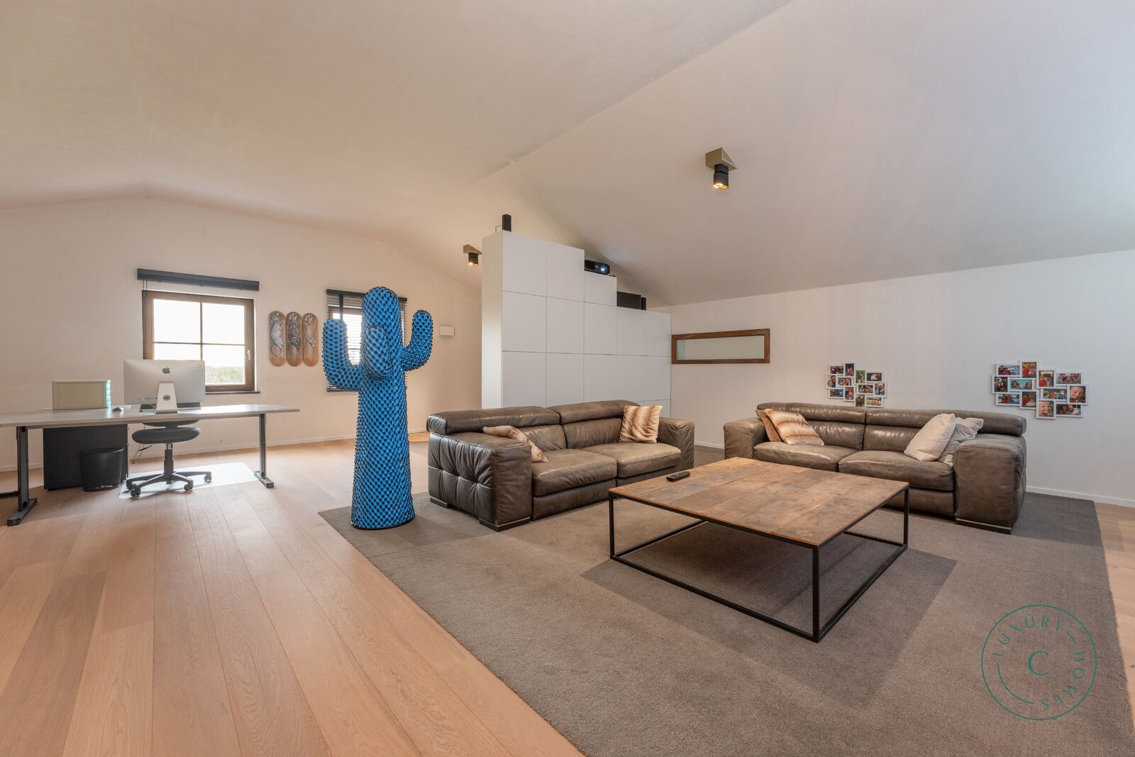Vanuit deze vleugel heb je directe toegang tot het overloopzwembad van 10 x 4 meter, omgeven door grote raampartijen die een prachtig zicht bieden op de tuin en het omliggende groen. Via een aparte trap bereik je de bovenverdieping van het bijgebouw, ingericht als ruime bureauruimte en twee bijkomende kamers die naar wens kunnen dienen als logeerkamers, atelier of hobbyruimte.