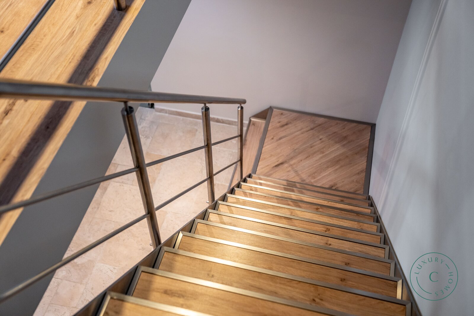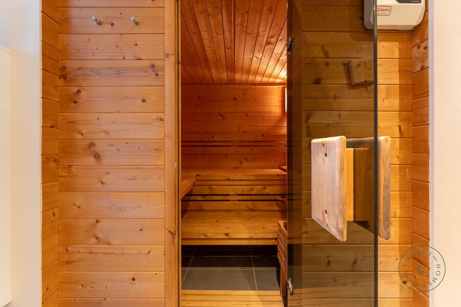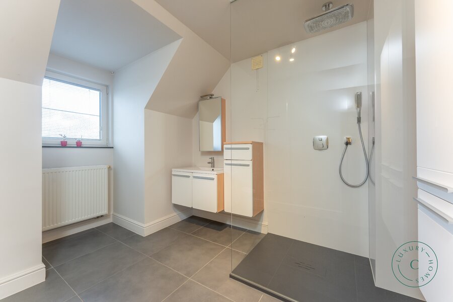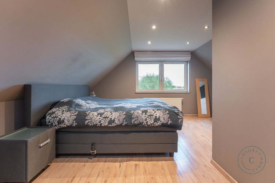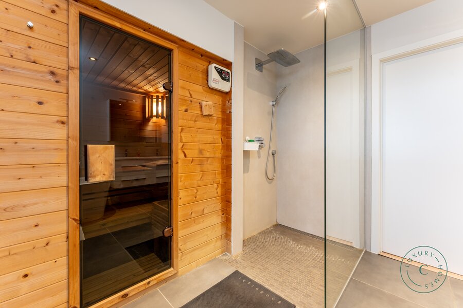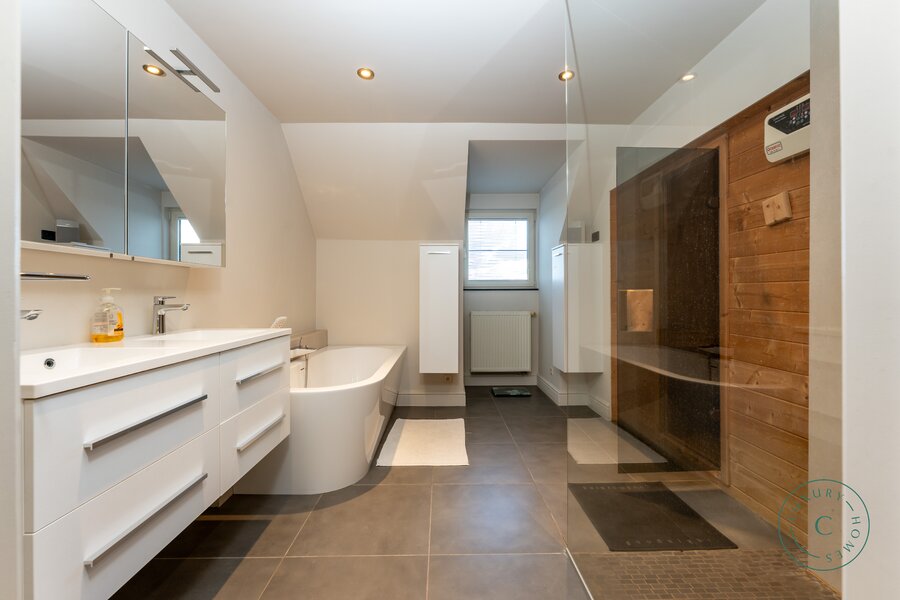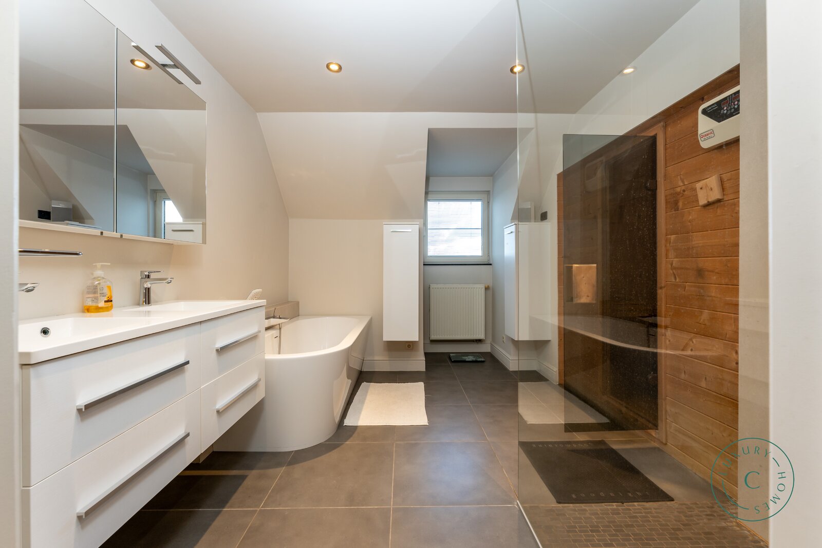 De eerste verdieping herbergt de master bedroom met luxueuze badkamer, uitgerust met inloopdouche, ligbad en sauna. Een stijlvolle maatwerk dressing vervolledigt het comfort. Verder bevinden zich op deze verdieping nog twee ruime slaapkamers en een tweede badkamer met inloopdouche.