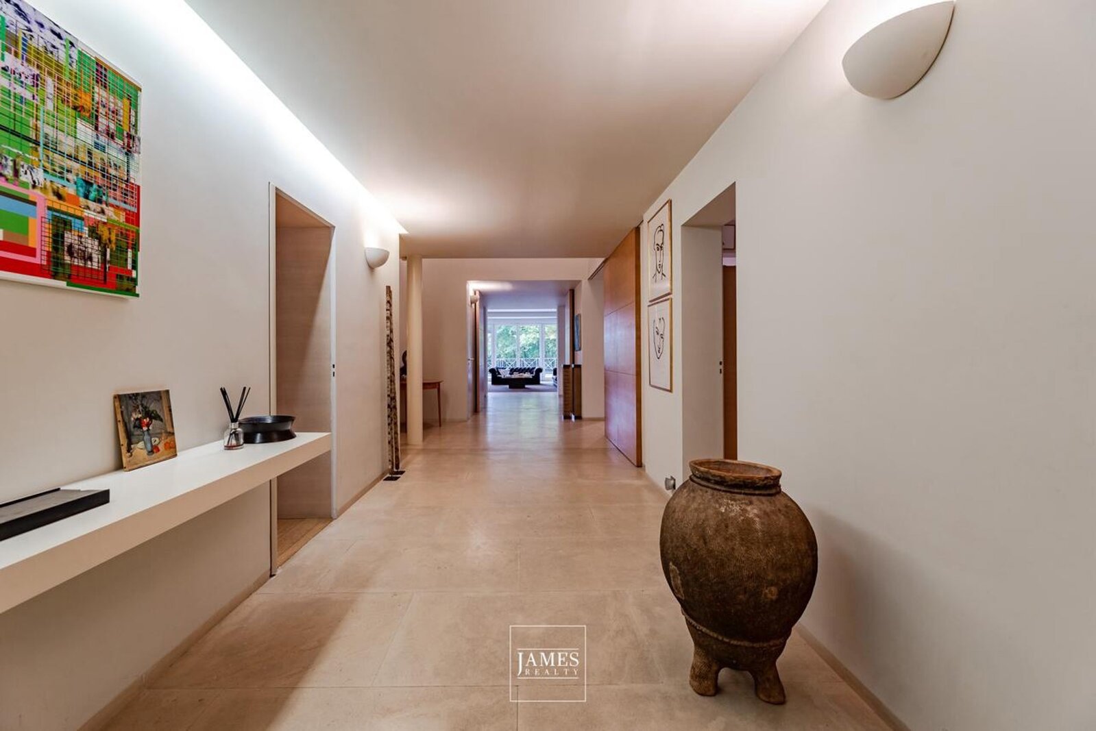 The ground floor features vast reception areas opening onto the garden, a dining room, a fully equipped kitchen with utility room, an office, and a TV lounge with bar. Upstairs, the master suite includes two separate dressing rooms, a full bathroom, and a boudoir-fitness area. A second bedroom with its own bathroom completes this level.