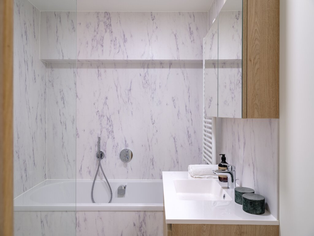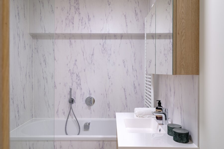 We enter the apartment through the entrance hall with a large built-in wardrobe. At the front, the spaces have been opened up and combined into one large area. This beautiful space accommodates the dining area, living room, and kitchen. The open kitchen with a kitchen island offers ample storage space and is equipped with all necessary appliances.