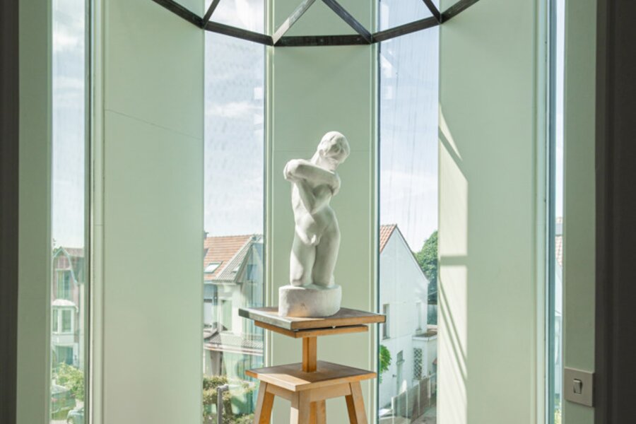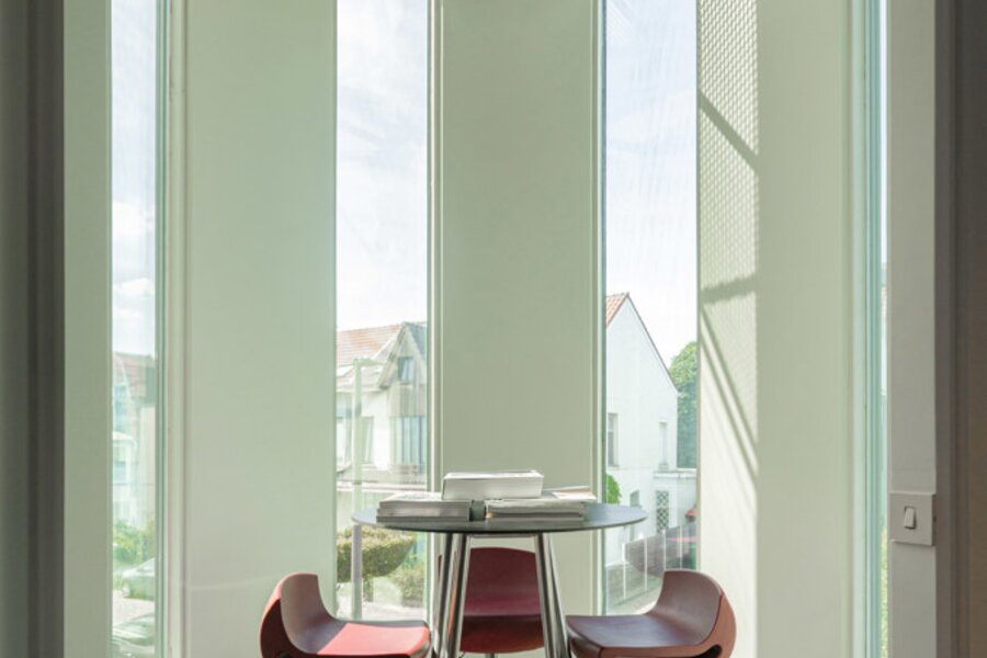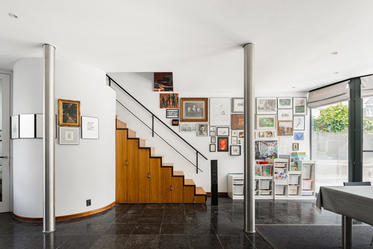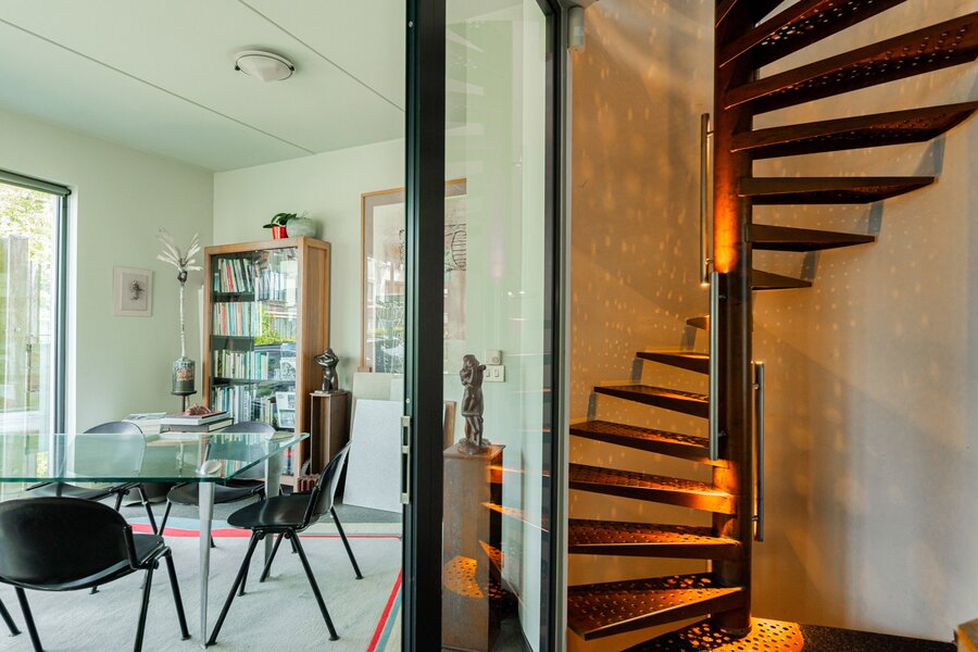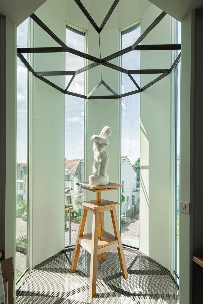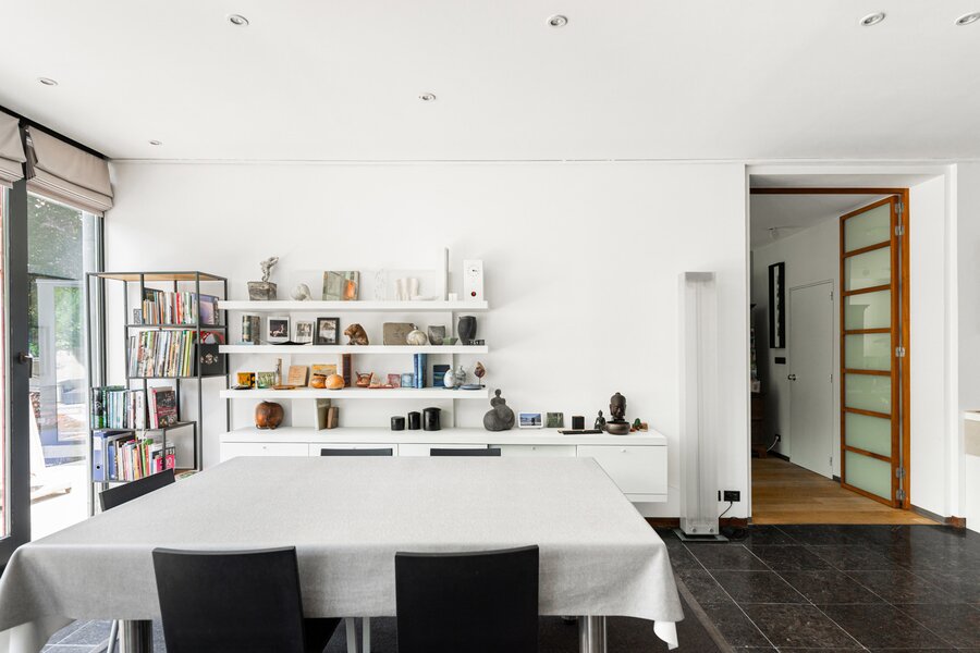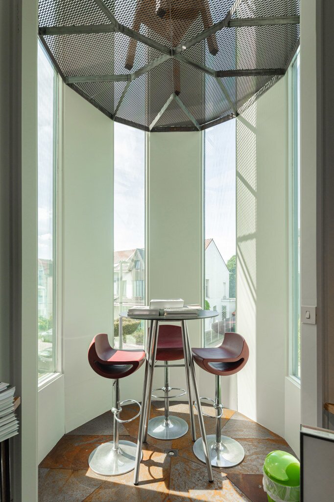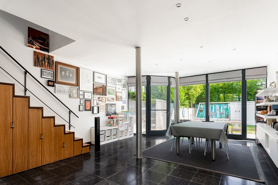 In 1988, the current owners bought the house at no. 64, and six years later they also acquired the neighbouring house, no. 66. With ingenious connections and openings between the two buildings, they transformed their family home into an XL version, with abundant space to combine family life with hobbies and professional activities. A large part of the property is used as the office for the owner’s architecture practice. This immediately explains the playful nod in this home: the pencil-shaped tower, a fun reference to his profession.