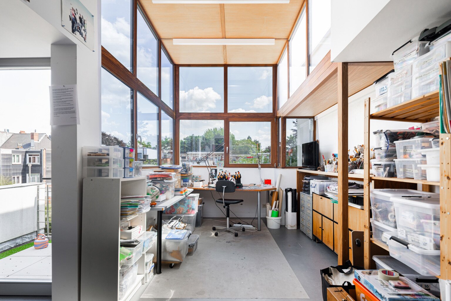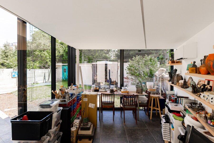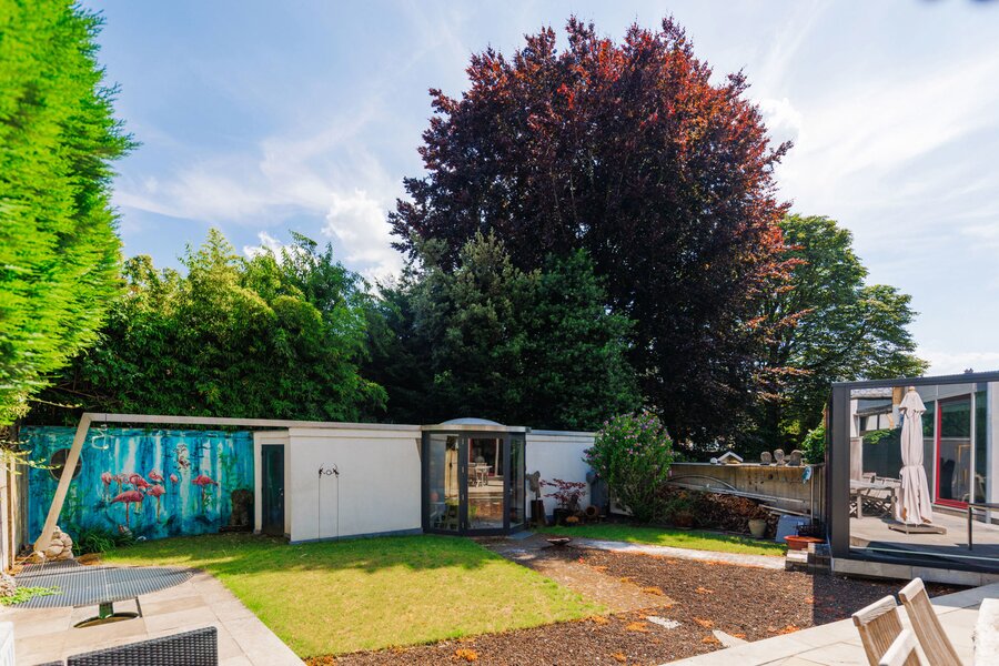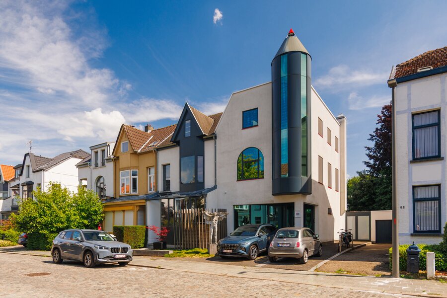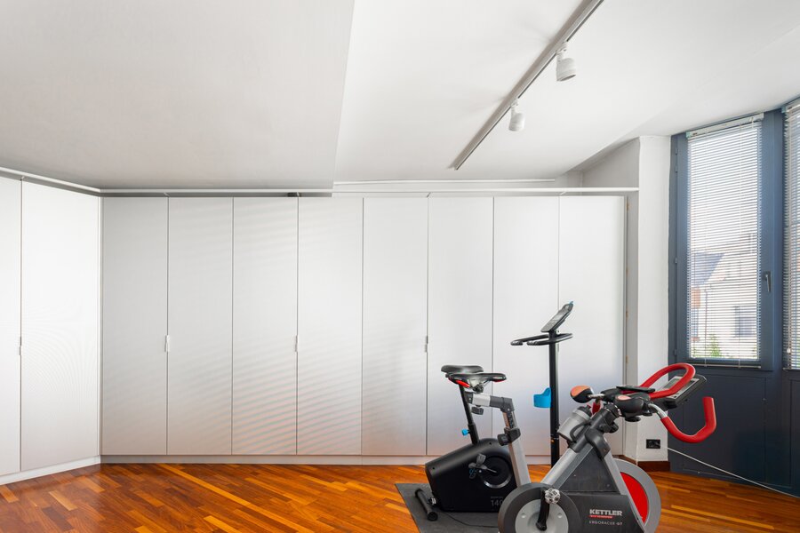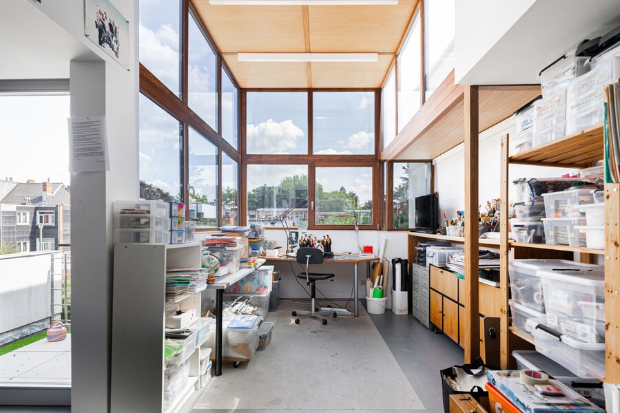 The house has four floors. Ground floor: kitchen with pleasant dining area, cosy living room and fireplace – perfect places to have breakfast together, play games, host dinners, or unwind at the end of the day. Thanks to the unique façade width, you enjoy an exceptionally large, fully enclosed garden with a lovely terrace and not one but two spacious separate workshops. The multipurpose room on the first floor is currently used as a gym. Also on this level: the main bedroom with private bathroom and the large office. On the second floor: another bedroom, a multipurpose room with terrace (currently an atelier) and two more generous office spaces. Finally, the property is largely cellared.