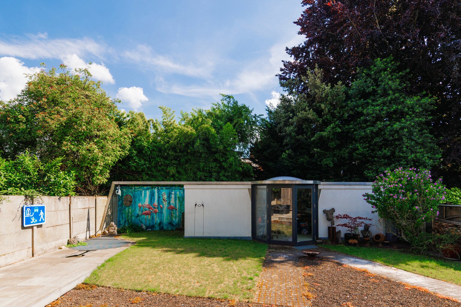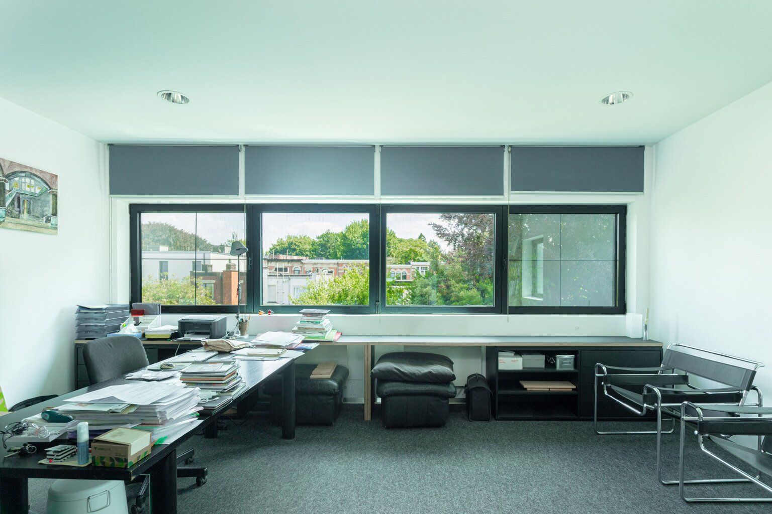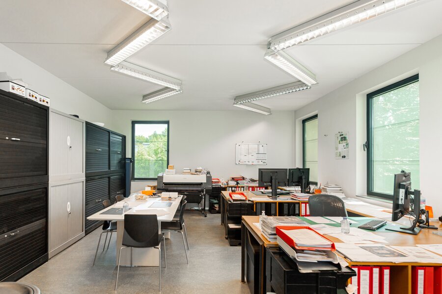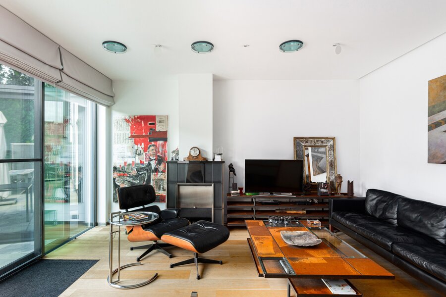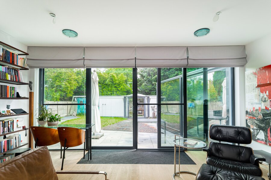The house has four floors. Ground floor: kitchen with pleasant dining area, cosy living room and fireplace – perfect places to have breakfast together, play games, host dinners, or unwind at the end of the day. Thanks to the unique façade width, you enjoy an exceptionally large, fully enclosed garden with a lovely terrace and not one but two spacious separate workshops. The multipurpose room on the first floor is currently used as a gym. Also on this level: the main bedroom with private bathroom and the large office. On the second floor: another bedroom, a multipurpose room with terrace (currently an atelier) and two more generous office spaces. Finally, the property is largely cellared.