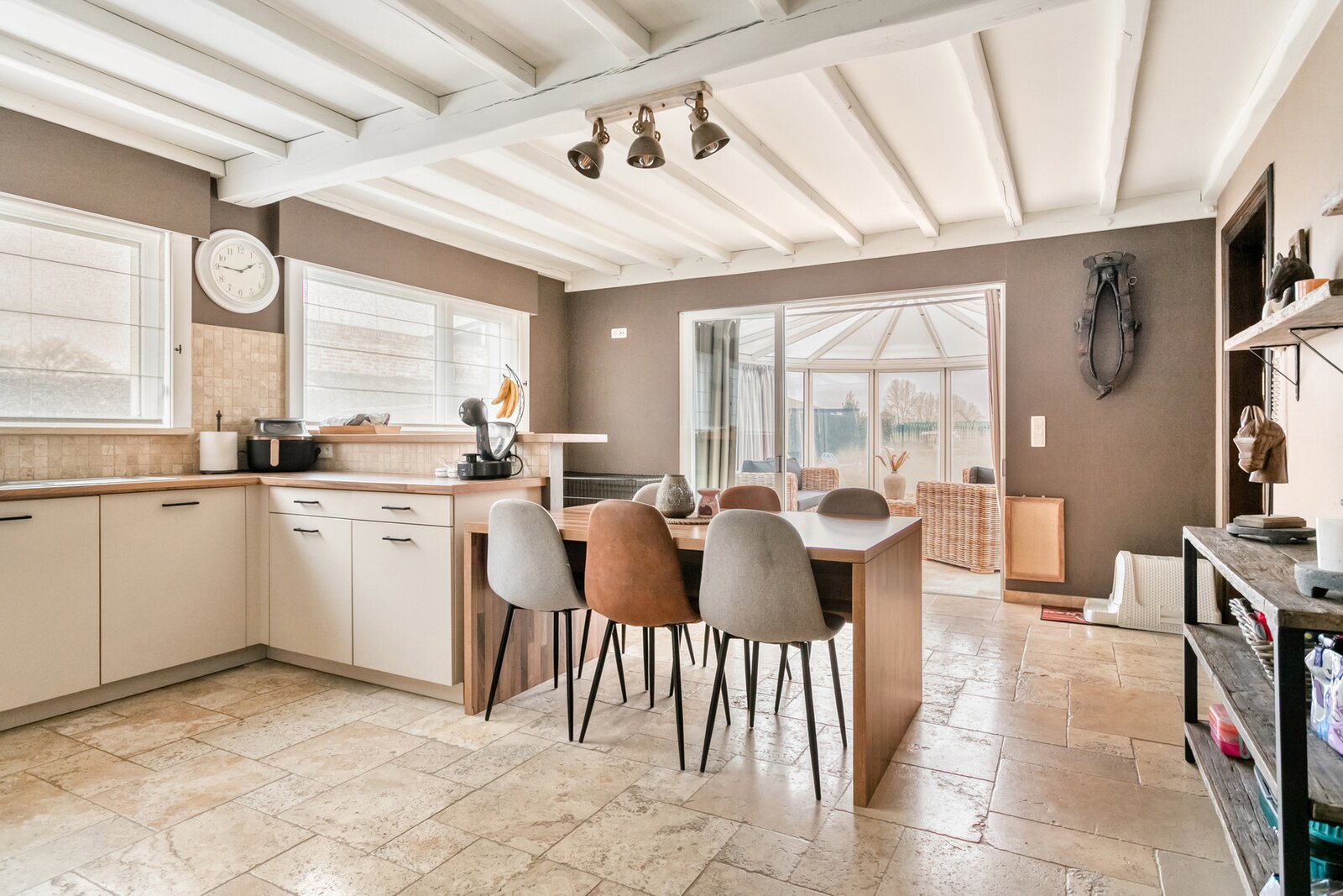 - Fully equipped open kitchen with a view of the garden and veranda