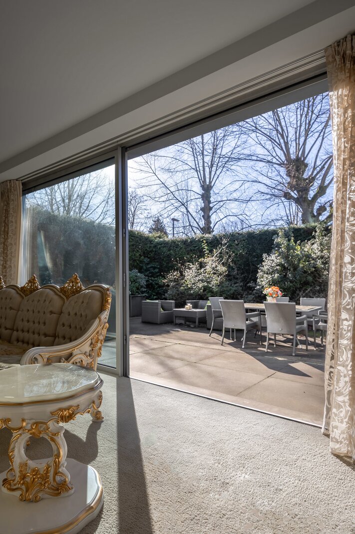 De ruime inkomhal verwelkomt u en leidt naar de lichtrijke living met eetruimte en zitruimte. De volledig ingerichte keuken is verbonden met de eetkamer via een brede schuifdeur, wat een open, vloeiende indeling creëert en tegelijk de mogelijkheid biedt tot afzonderlijke ruimtes. De keuken is uitgerust met een 5-pits gasvuur, hete luchtoven, afwasmachine en grote Amerikaanse koelkast en loopt naadloos over in de praktische bijkeuken met ingemaakte kasten. Zowel de keuken als de living genieten van grote raampartijen met toegang tot het terras en de zonnige tuin.