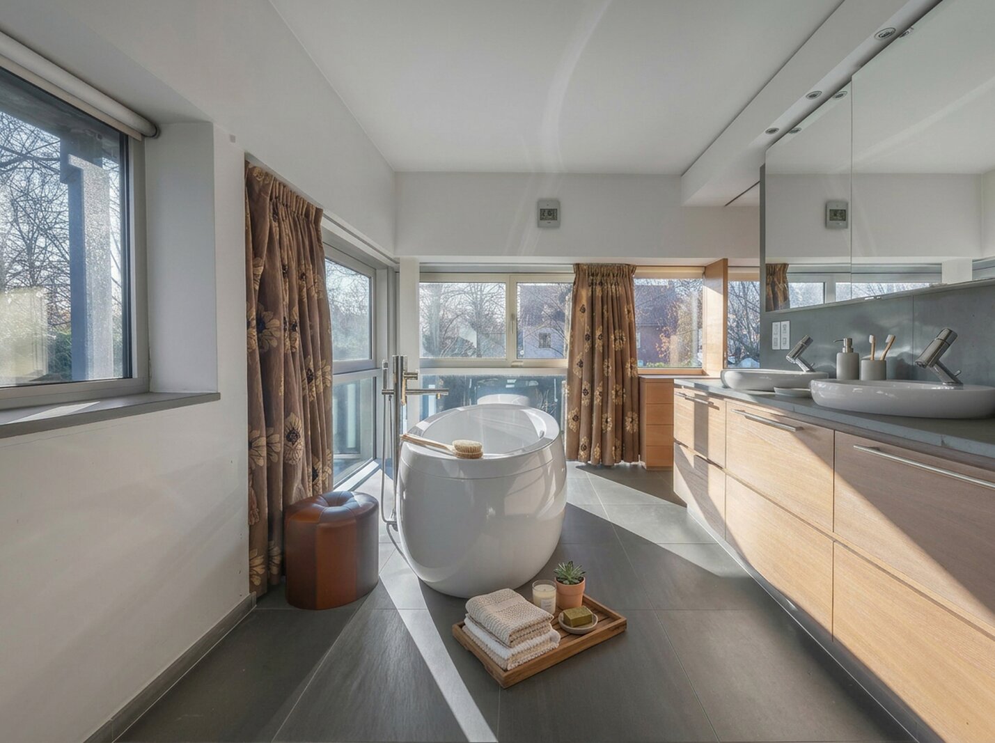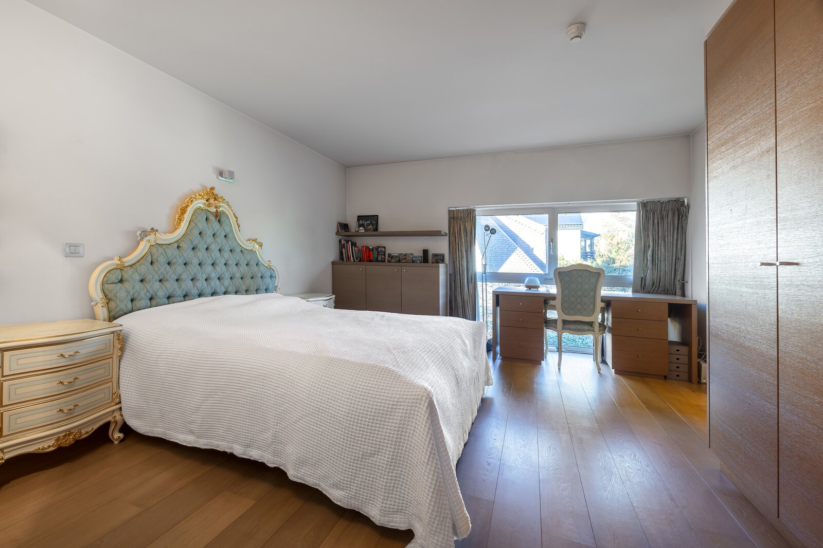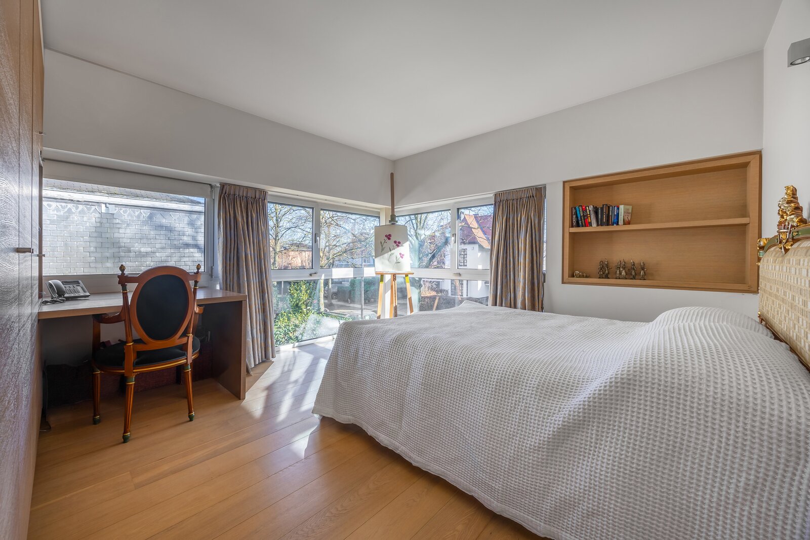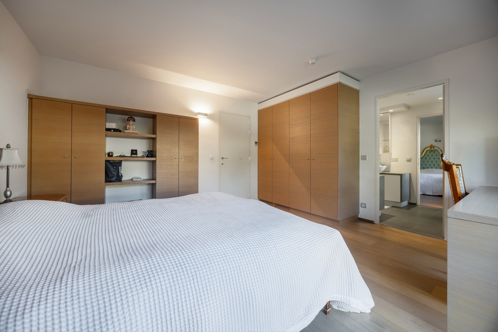 Daarnaast is er een volledig ingerichte suite met slaapkamer, badkamer met bad, douche, dubbele wastafel, wc en dressingruimte. Deze is ideaal te gebruiken als gastenverblijf of thuiskantoor, wat extra flexibiliteit biedt voor gezinnen of thuiswerkers.