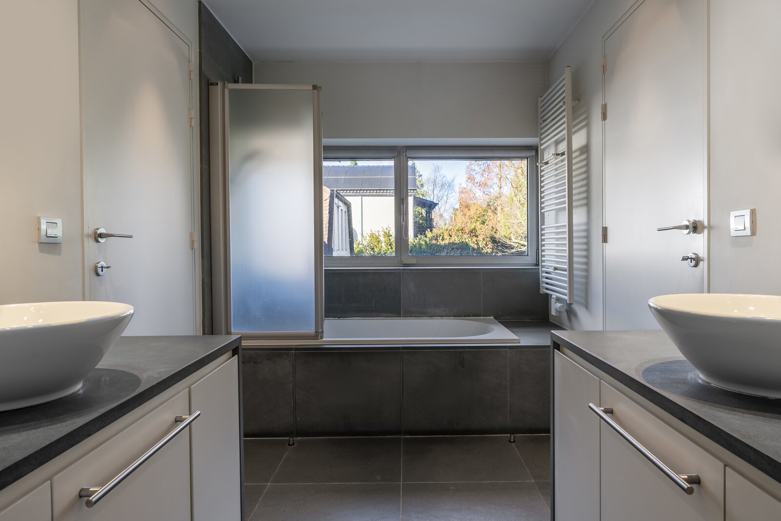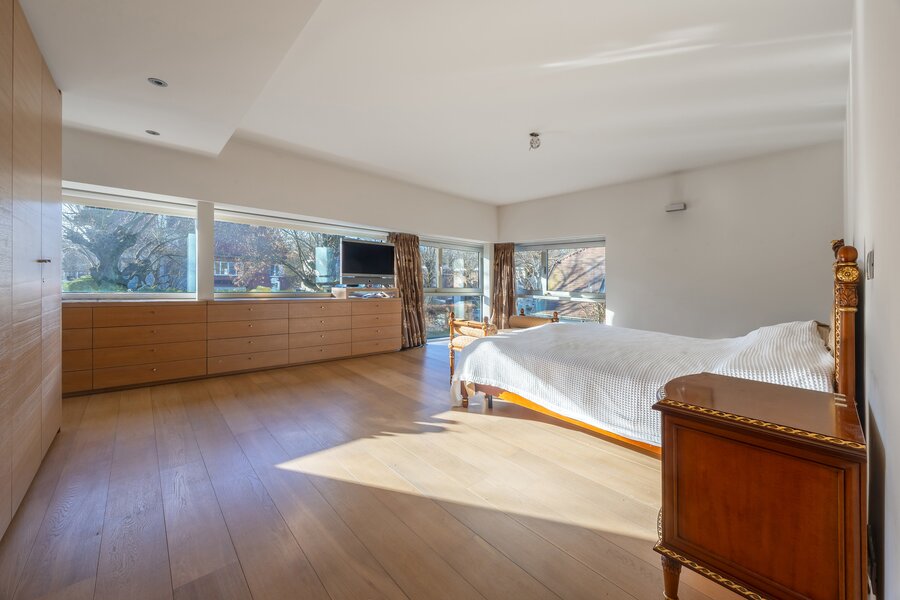 Via een gepantserde deur bereikt u de nachthal met toegang tot 5 ruime slaapkamers (ca. 14 m², 15 m², 19 m², 17 m² en 23 m²). Slaapkamers 1 en 2 delen een badkamer met dubbele wastafel, bad met douchefunctie en aparte wc. Slaapkamers 3 en 4 beschikken elk over een en suite badkamer met dubbele wastafel en bad met douchefunctie. De masterbedroom (ca. 23 m²) is voorzien van ingemaakte kasten en een en suite badkamer met ligbad, dubbele wastafel, douche en wc en en baadt dankzij de grote raampartij in natuurlijk licht.