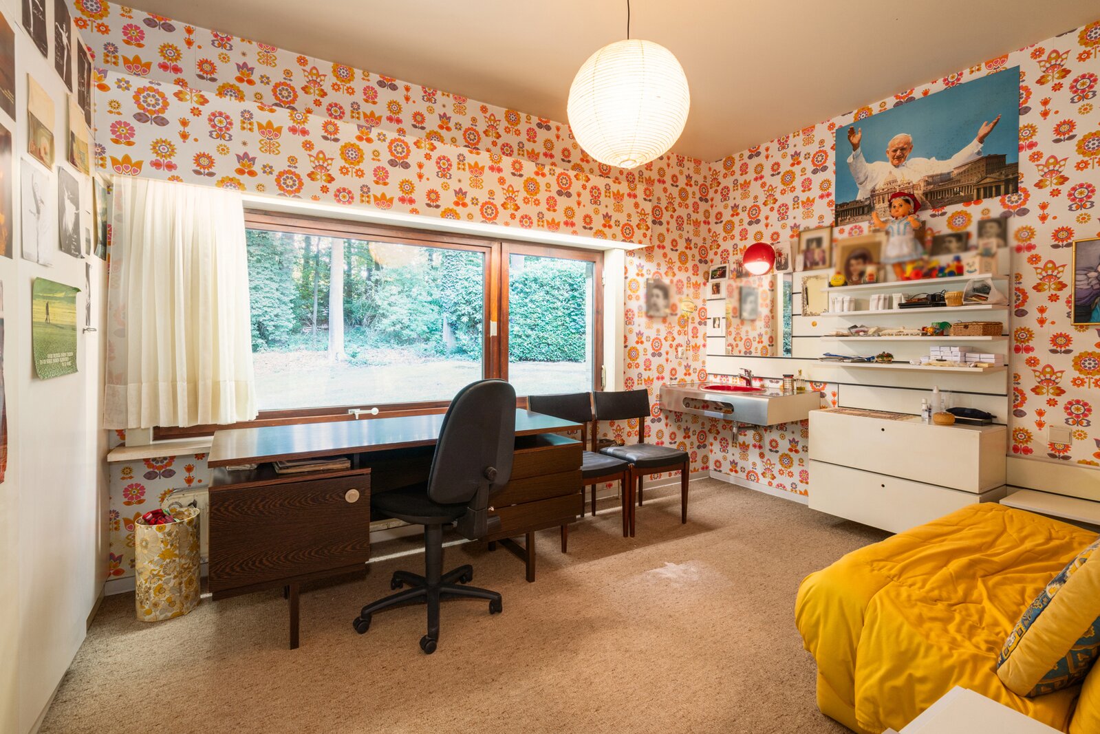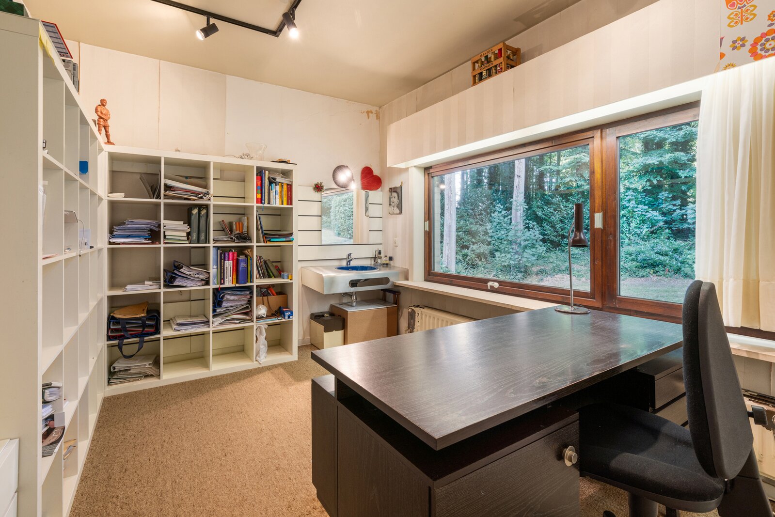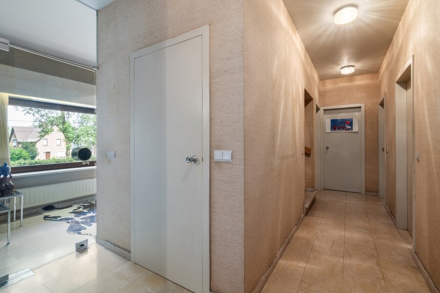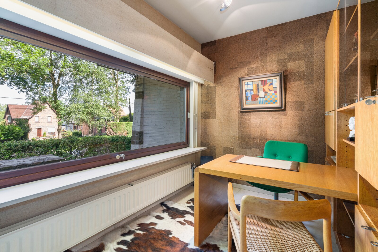 Op het gelijkvloers vinden we een ruime eet- en leefruimte met aangrenzend de lichtrijke keuken. Verder is er een bureauruimte en drie slaapkamers, waarvan één beschikt over een eigen badkamer.