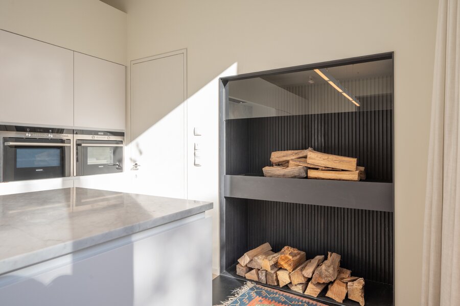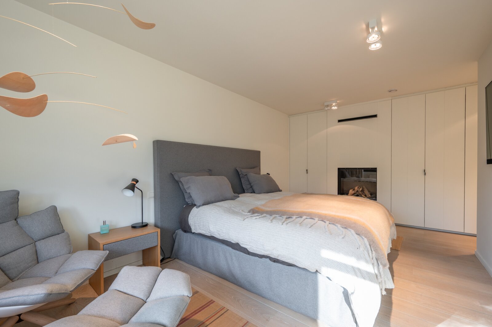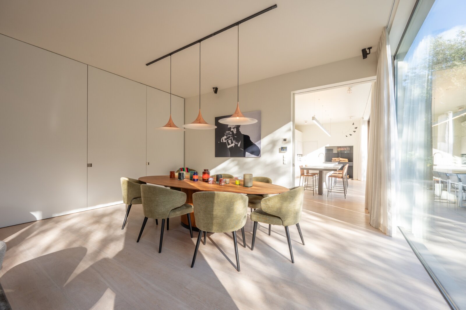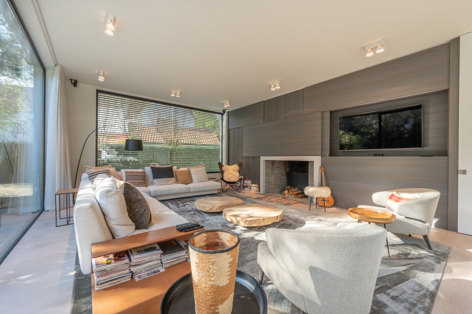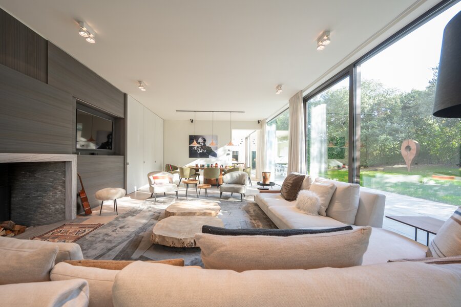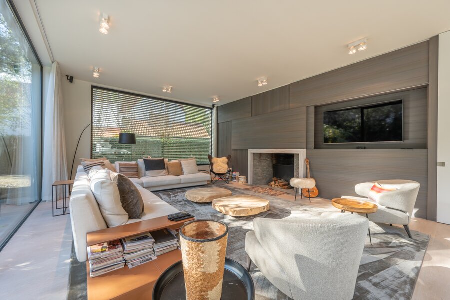 Spacious entrance hall with cloakroom and guest toilet. Office space. Bright and generous living area consisting of a lounge with open fireplace, dining room, and fully equipped kitchen with dining area by Obumex. The entire space opens onto a large outdoor terrace with a view of the garden. Laundry room. Double garage with additional storage space.