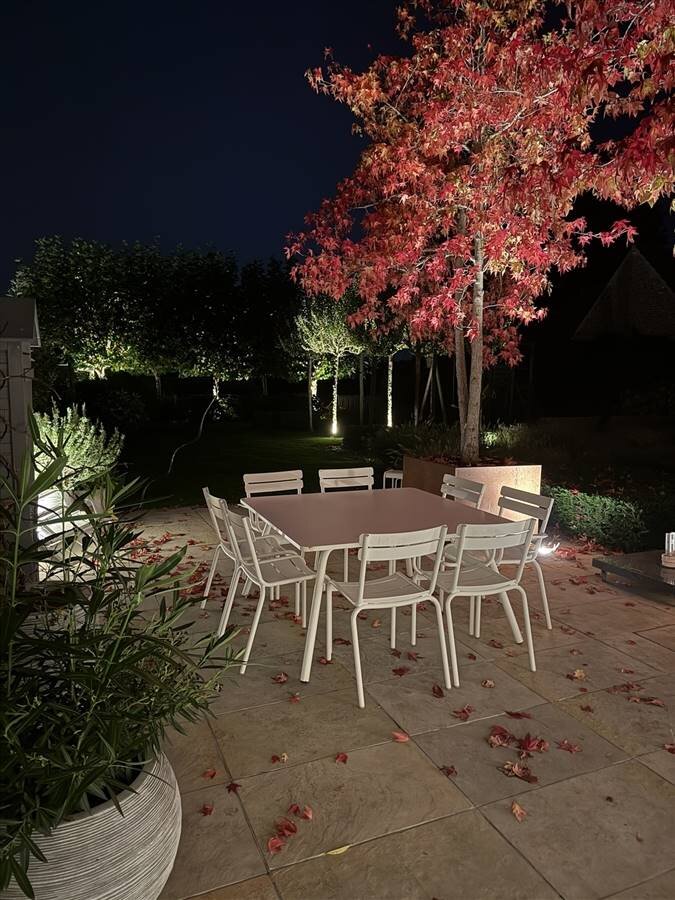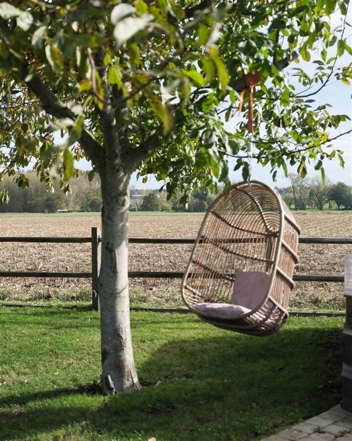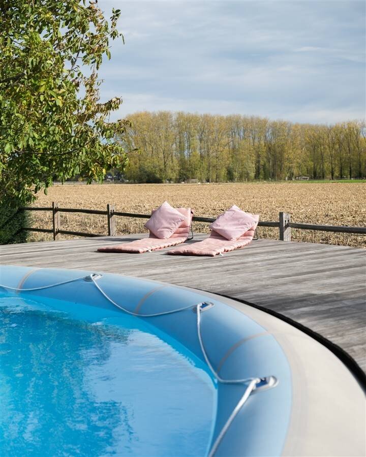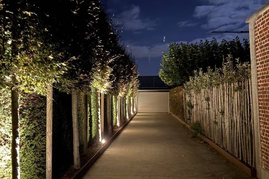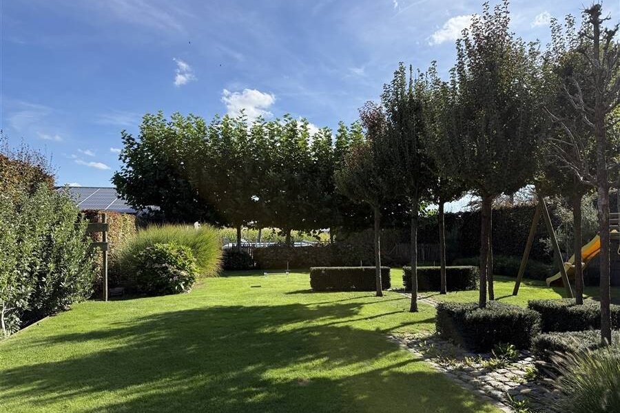 De volgroeide tuin met hoge hagen, (fruit)bomen en geometrische beplanting creëert een oase van rust en privacy. Achteraan ligt het zwembad met houten zonnedek, ideaal om te ontspannen of gasten te ontvangen.