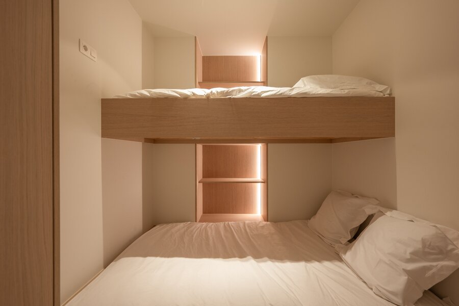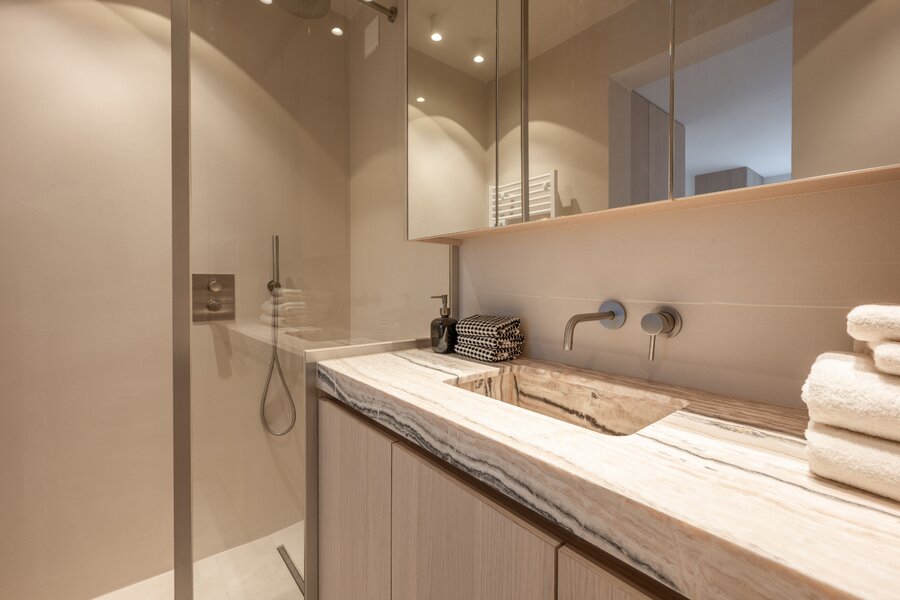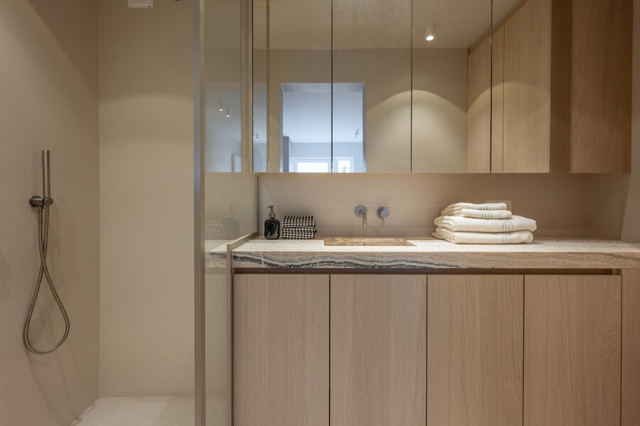 The apartment has two full bedrooms with built-in wardrobes and a third, smaller bedroom. There are also two modern shower rooms, each with a shower and washbasin.