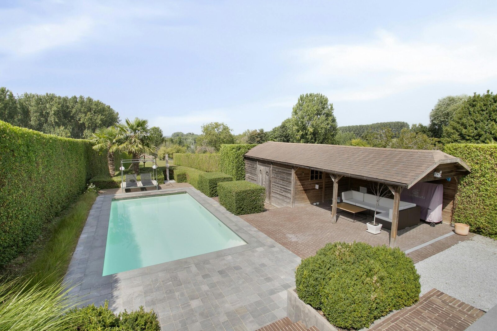 This energy-efficient home has four full bedrooms, a spacious and stylish bathroom with a walk-in shower, and an open kitchen that seamlessly blends into the bright living space. Thanks to large windows, you can enjoy a beautiful view of the landscaped garden with swimming pool and pool house every day.