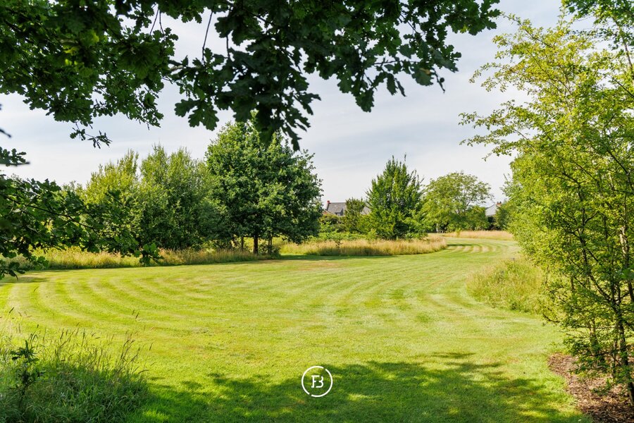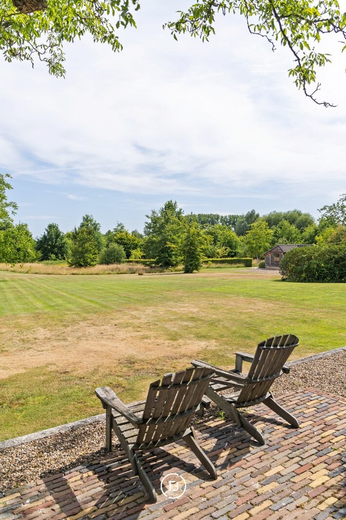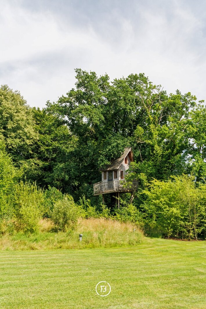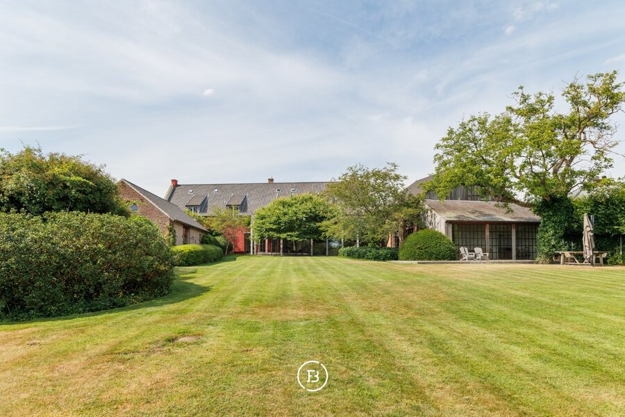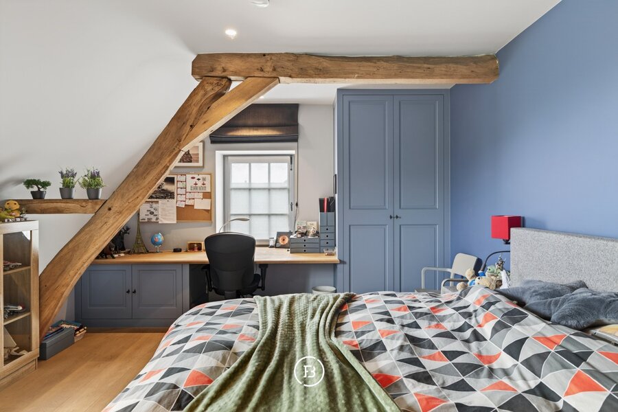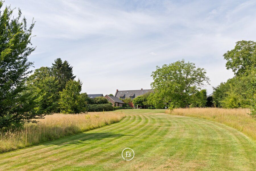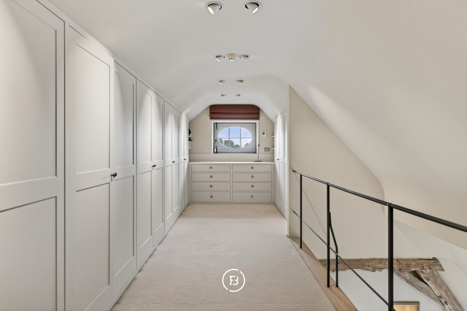 De master suite, met zijn imposante dakgebinte, dressing en ensuite luxe badkamer, heeft een ruime oppervlakte van 70 m². Hier is ook een toegang tot een apart terras met weids uitzicht over de eigen parktuin van bijna anderhalve hectare met volwassen bomen, een boomhut en een discreet achterliggend uitweggetje.