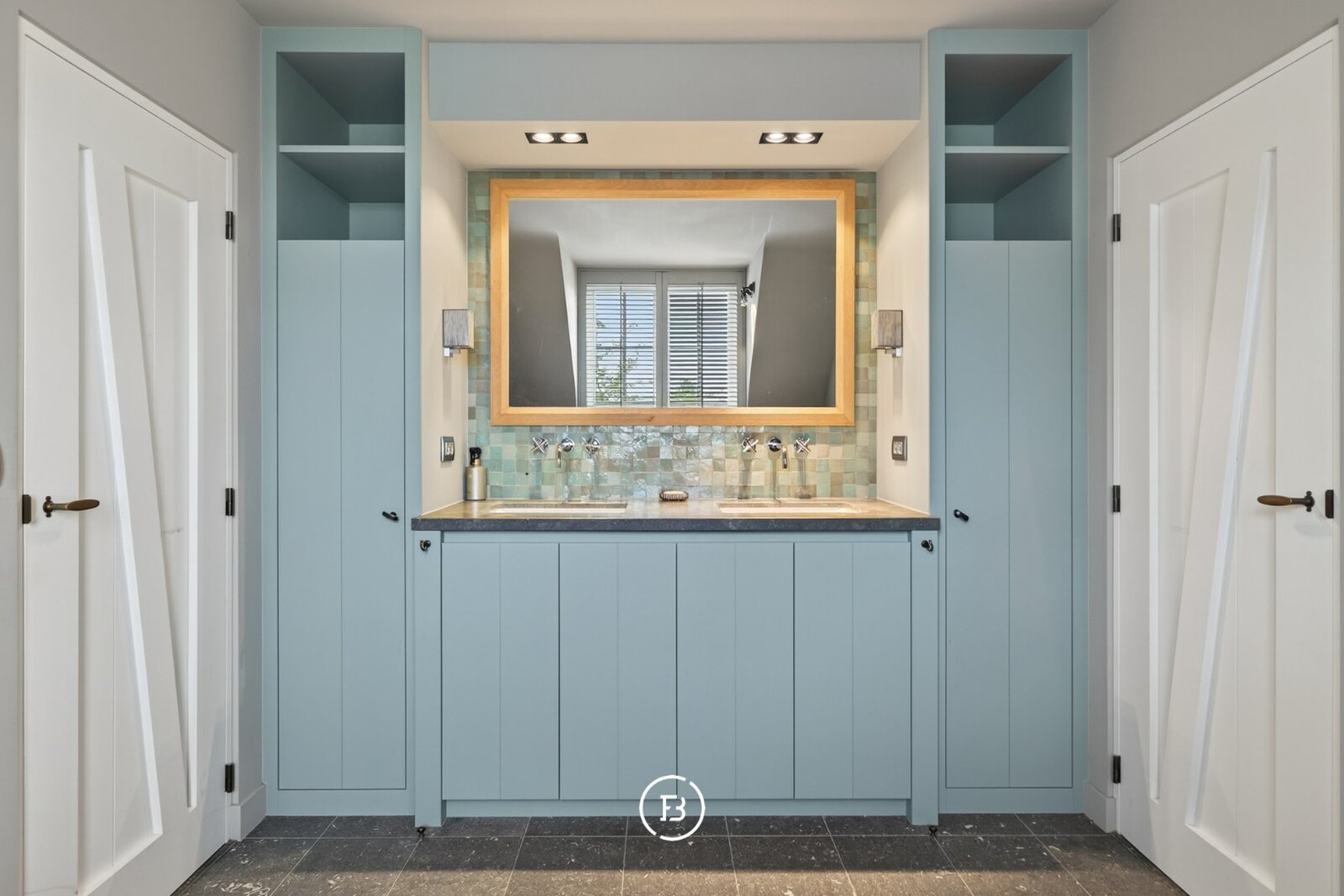 Vijf ruime slaapkamers en drie badkamers bieden comfort op maat van een gezin of gasten, terwijl een afzonderlijk bureel van 80 m² met eigen ingang ideaal is voor wie wonen en werken elegant wil scheiden.