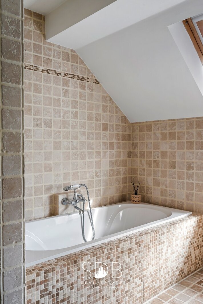De eigentijdse badkamer beschikt over een dubbel lavabomeubel, een douche, een ligbad en een toilet.