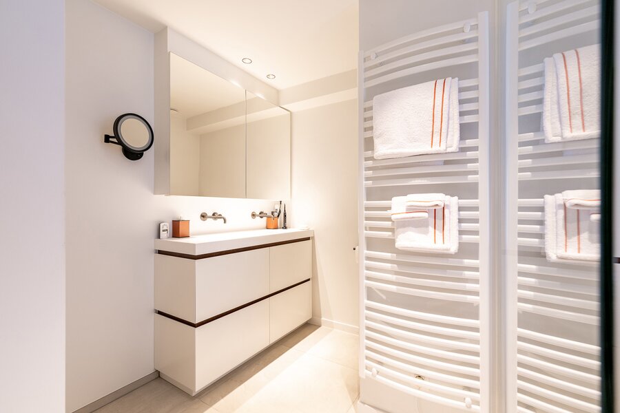 The master bedroom has a separate dressing room and an en-suite bathroom, finished with high-quality materials. There is also a second full bedroom and a third, smaller room that is perfect for use as an office or children's room. These rooms share a modern shower room.