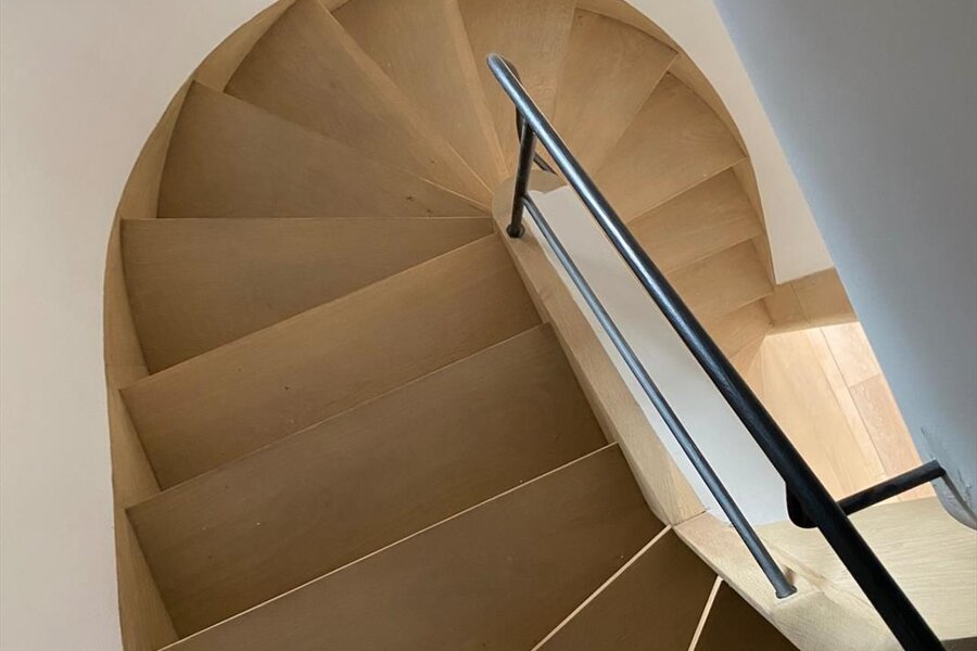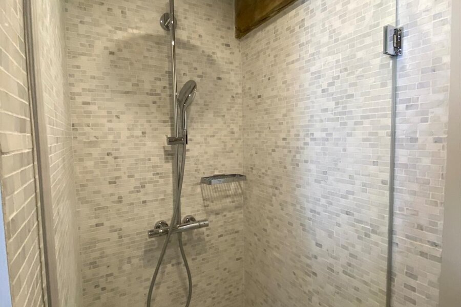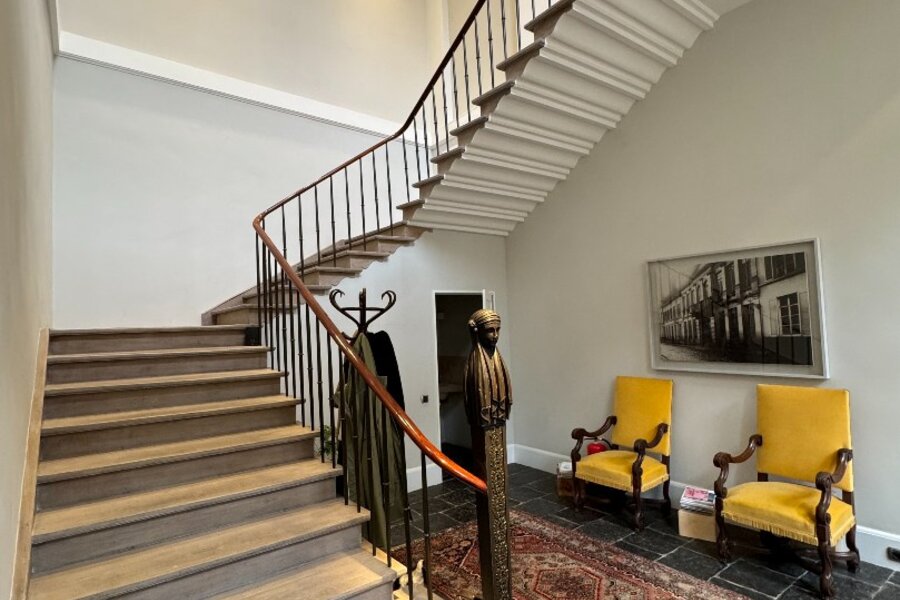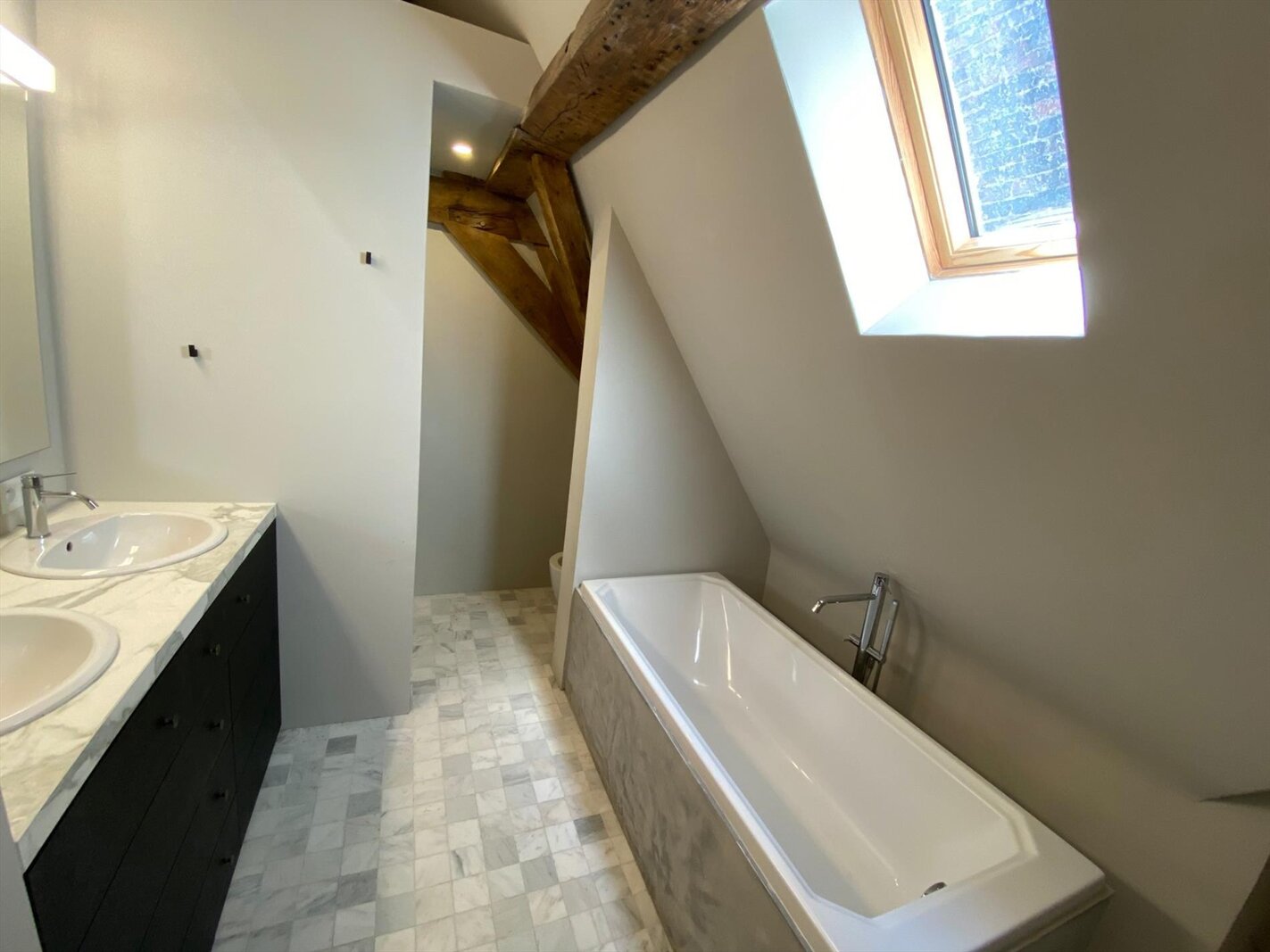 De bovenverdieping omvat twee volwaardige slaapkamers en een elegante badkamer uitgerust met zowel ligbad als douche. Het zonnige dakterras vormt een absolute meerwaarde, een discrete buitenruimte waar u in alle rust kan genieten van de zon, midden in de stad.
