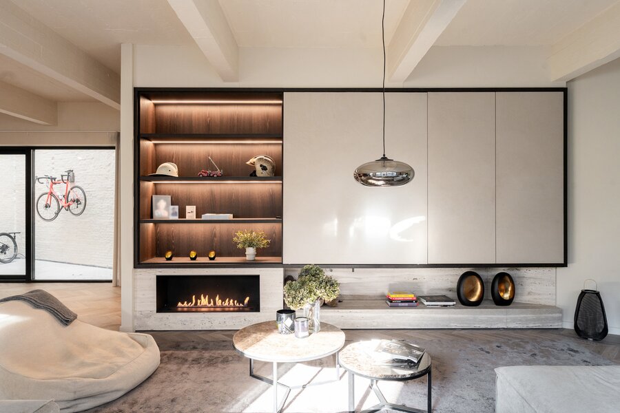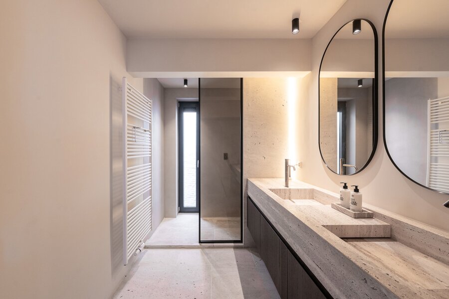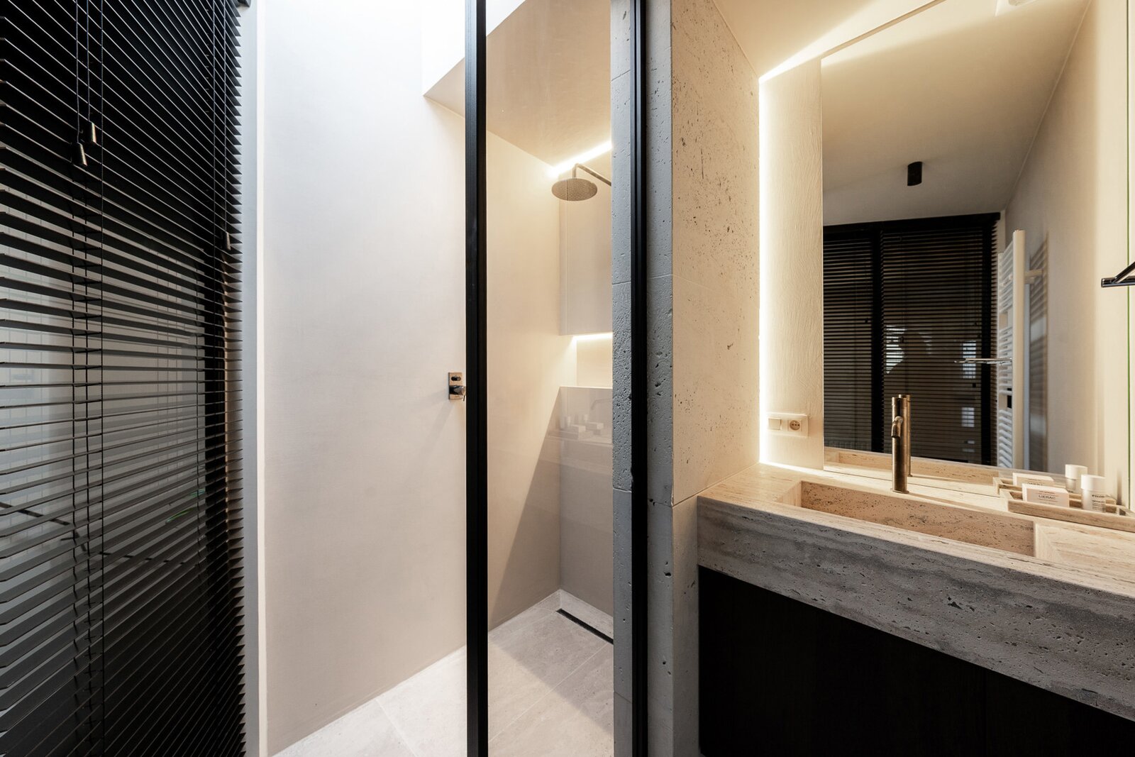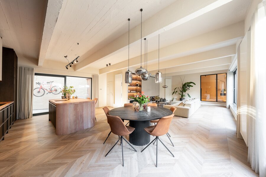 De hoofdingang bevindt zich aan de Lambermontstraat en is bereikbaar via het voorliggende appartementsgebouw. Aan de voorzijde ligt het eerste terras, ruim genoeg voor zowel een eet- als zitgedeelte. Bij binnenkomst betreedt u de inkomhal met trap en directe toegang tot de kelderverdieping, waar zich de ondergrondse parking bevindt. De sfeervolle woonkamer met open keuken is stijlvol ingericht en uitgerust met een bio-ethanolhaard. De keuken is volledig voorzien van een Quooker-kraan, afwasmachine, combi-oven, koelkast, diepvries en wijnkoeler. De fineerhouten kasten vormen een prachtig contrast met de roze travertin. Aansluitend aan de keuken bevinden zich een berging en een koer.
