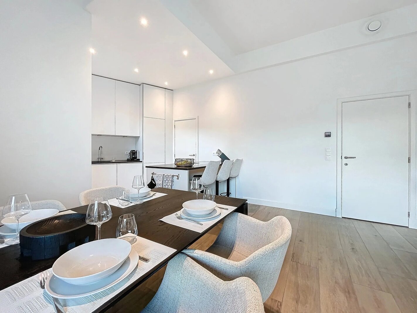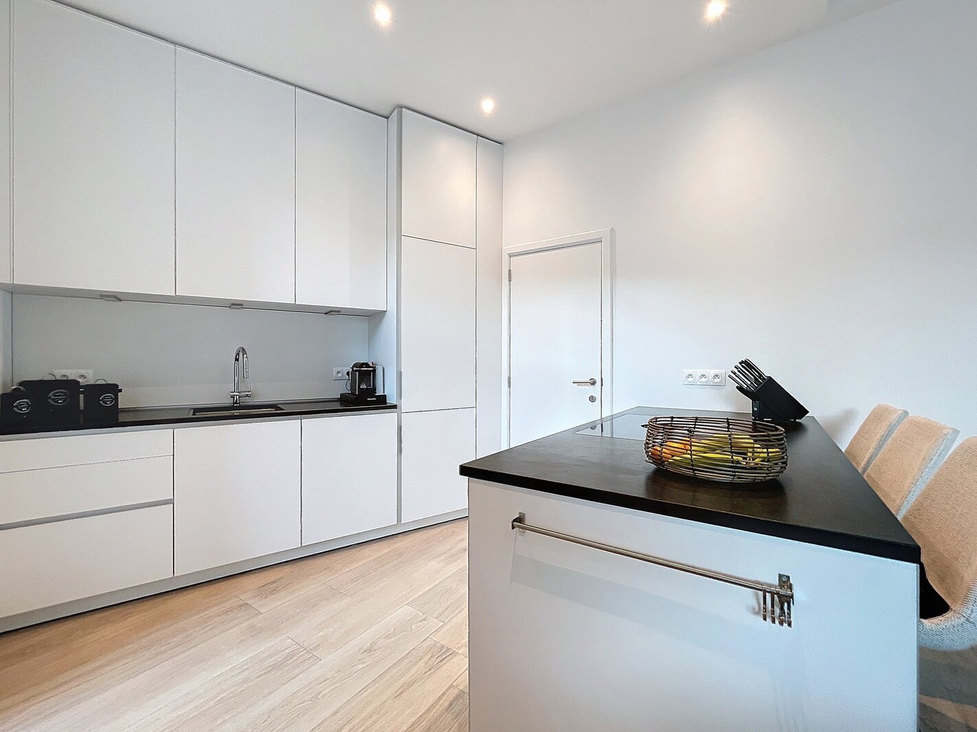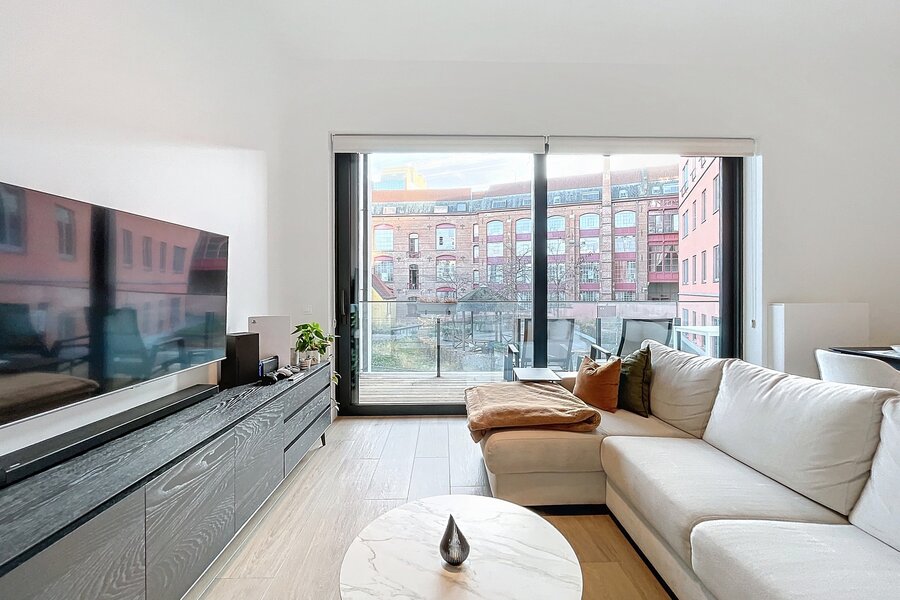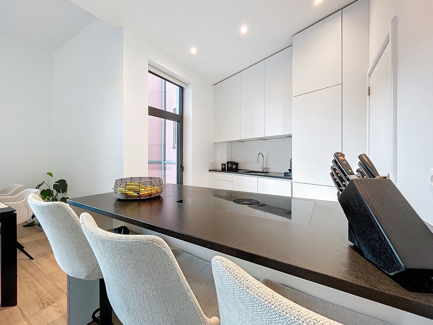 The living space forms the heart of the apartment and features a high-end, open-plan kitchen by Bulthaup, fully equipped with modern appliances. Adjacent, you will find a storage room, perfect for extra storage.