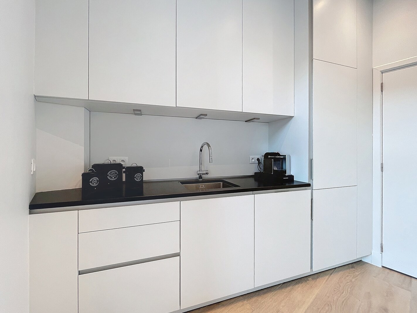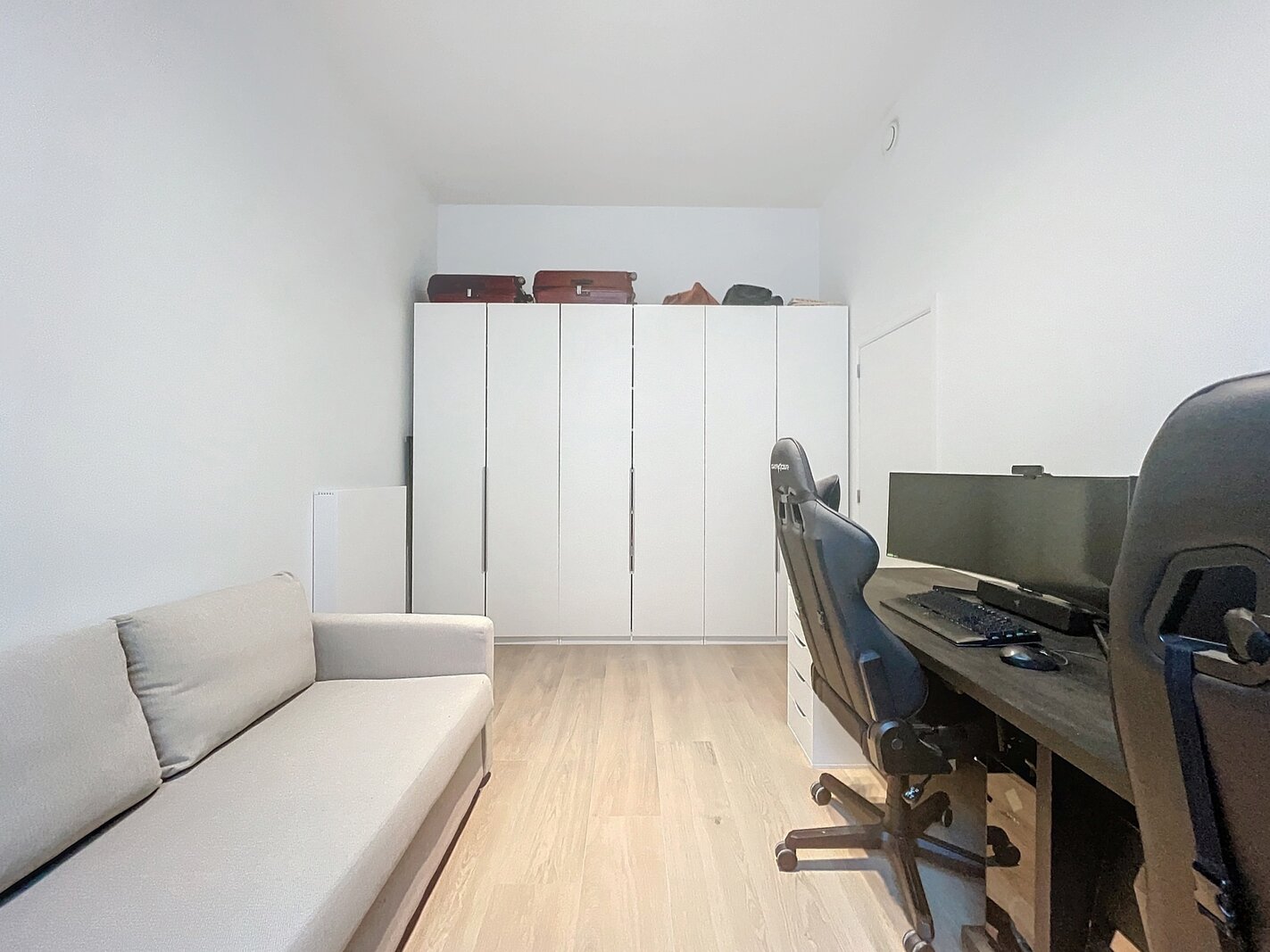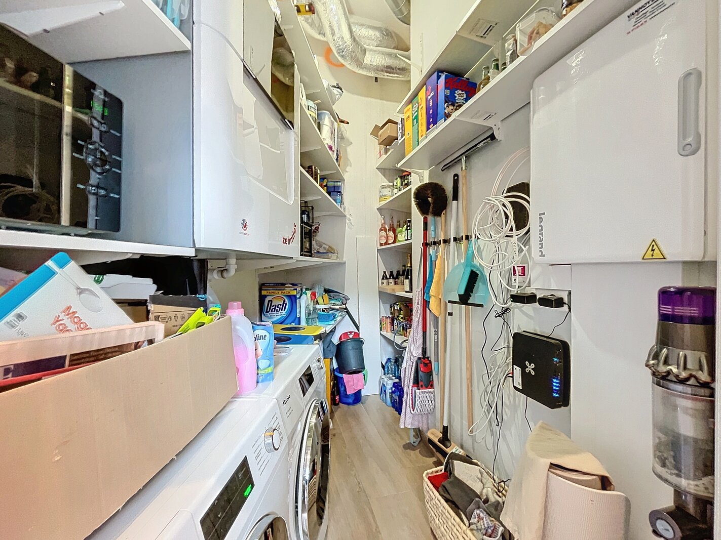 The living space forms the heart of the apartment and features a high-end, open-plan kitchen by Bulthaup, fully equipped with modern appliances. Adjacent, you will find a storage room, perfect for extra storage.