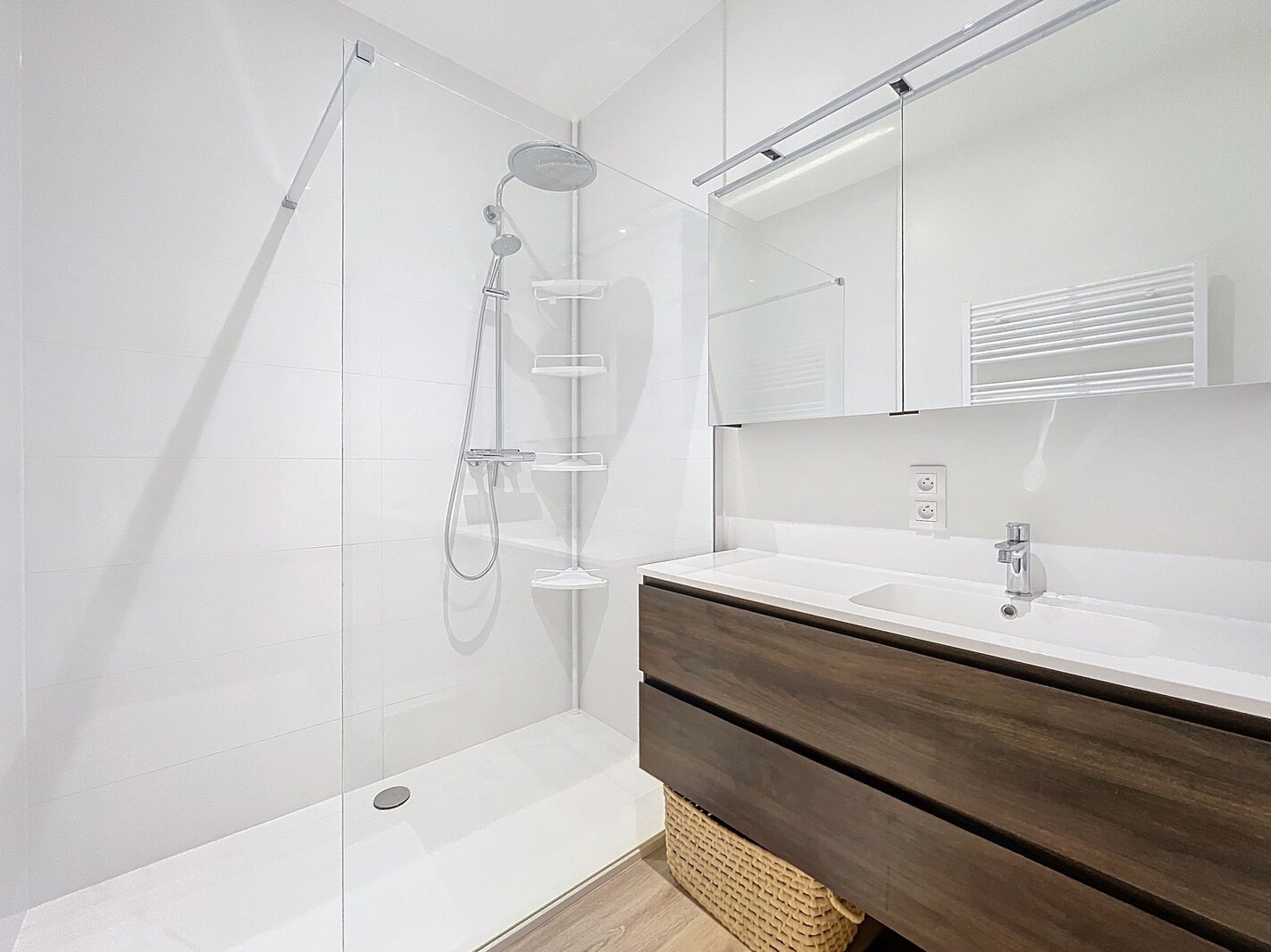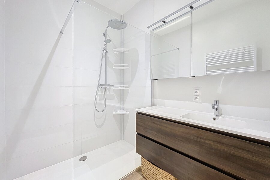 The bathroom is equipped with a walk-in shower, and the flat also boasts a separate toilet and two bedrooms to fully meet your living needs.