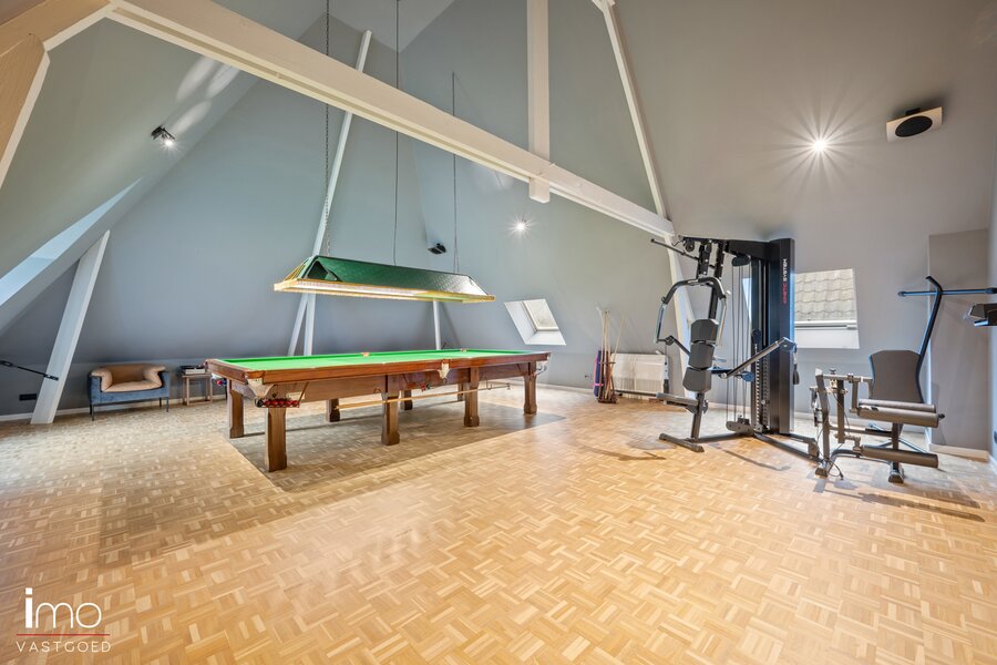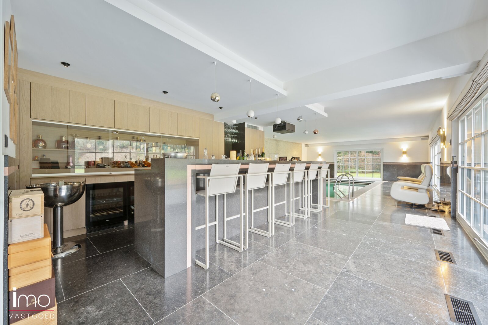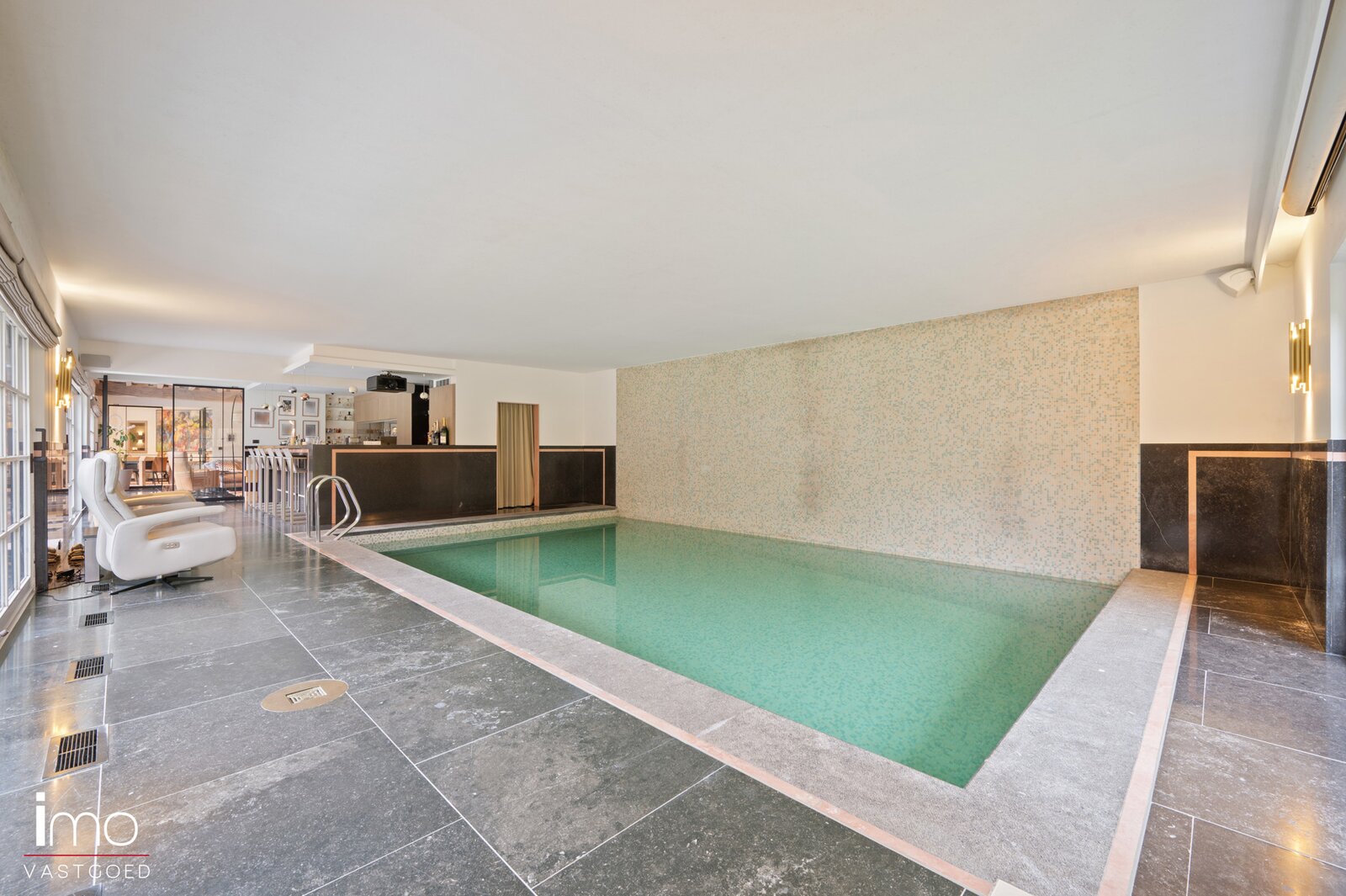 Het verwarmd binnenzwembad bevindt zich ook op de gelijkvloerse verdieping en kijkt uit op de groene tuin. De ruimte beschikt over een prachtige bar voorzien van opnieuw alle luxe zoals wijnkoelers, ijsmachine, champagnekast enzovoort. Een kleedruimte en douche zijn tevens voorzien. Tot slot kan u gebruik maken van de beamer die de ruimte omtovert tot een ware homecinema.
