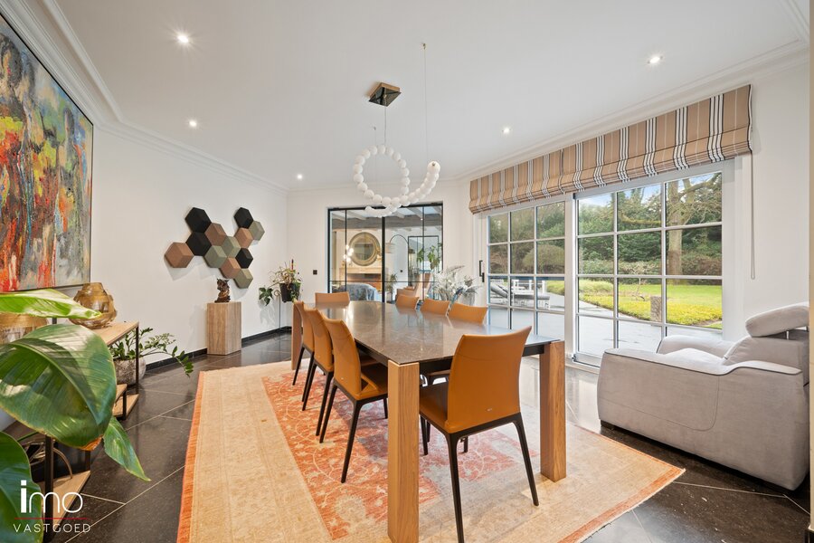 De eetkamer staat in verbinding met de keuken die op haar beurt werd volledig uitgerust met de meest luxueuze materialen van onder andere het merk Gaggenau. Ook hier zorgen de grote raampartijen voor een natuurlijke lichtinval.