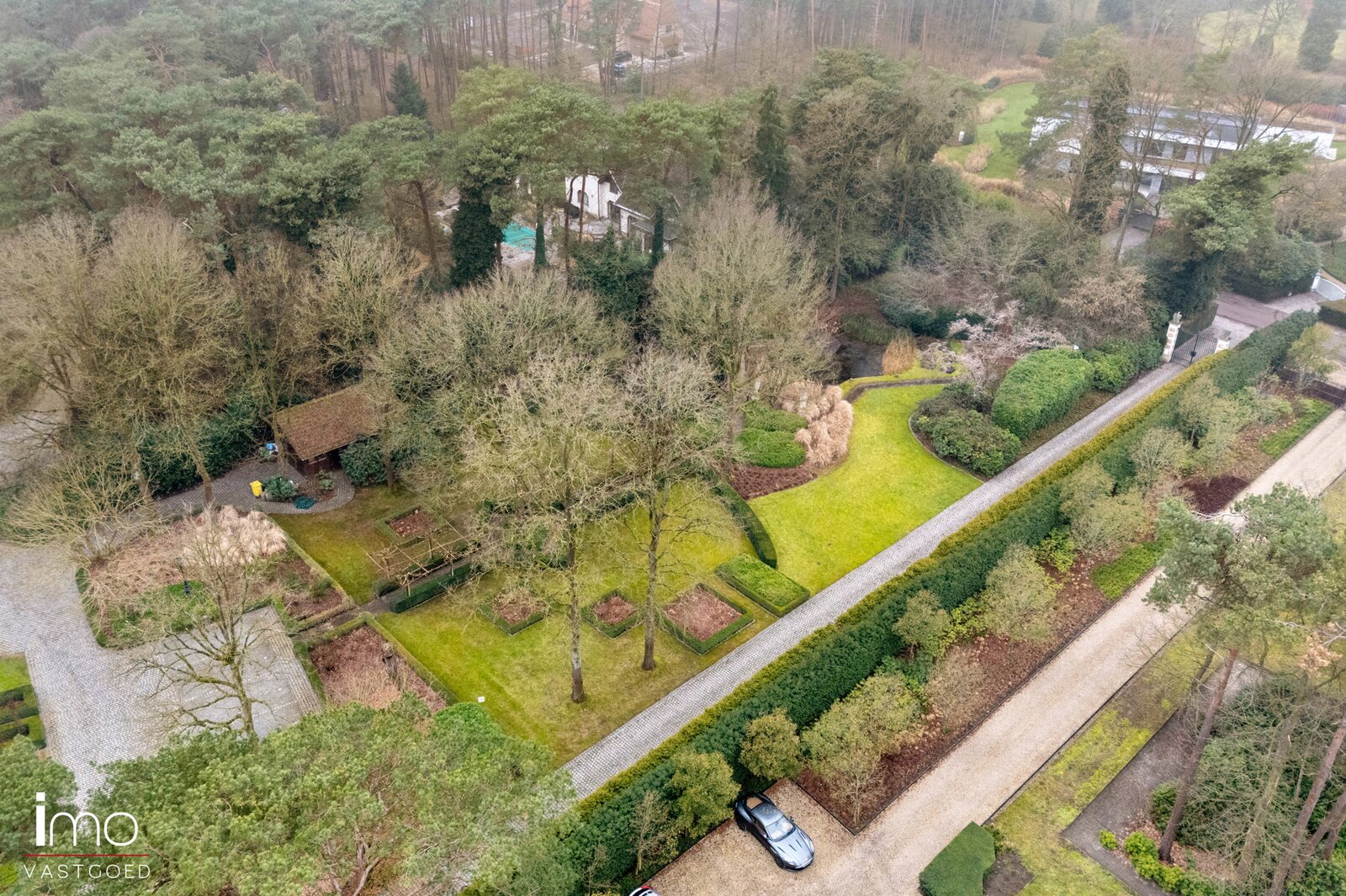 Het perceel is volledig omheind en enkel toegankelijk via de grote poort met oprijlaan tot aan de woning.
