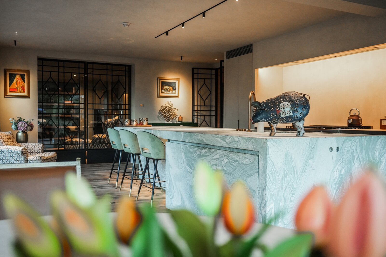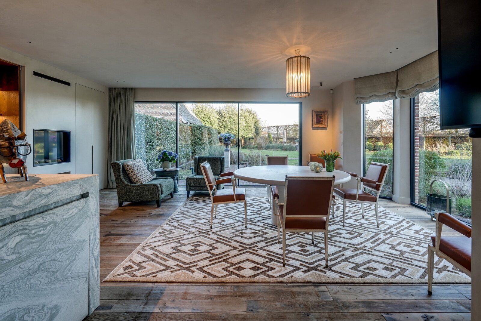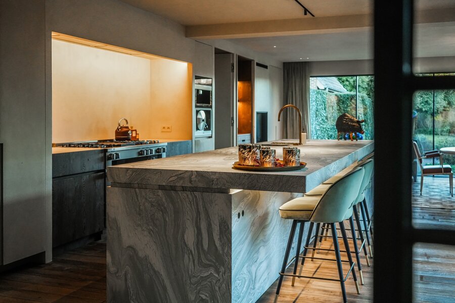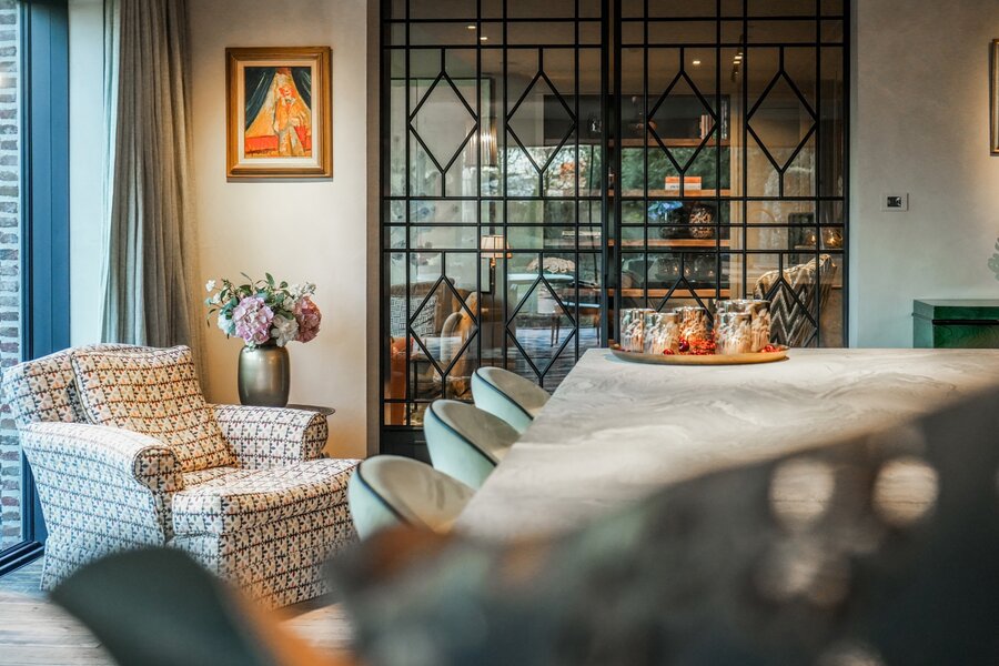 In a quiet, green residential area, this exceptional villa offers high-quality finishes and thoughtful living comfort. The living spaces are filled with natural light and provide beautiful views of the landscaped garden. The kitchen, finished with premium materials and modern appliances, serves as the functional heart of the home. In addition, there is a separate professional kitchen, perfect for entertaining guests. The office with a view of the ornamental garden makes working from home both comfortable and stylish.