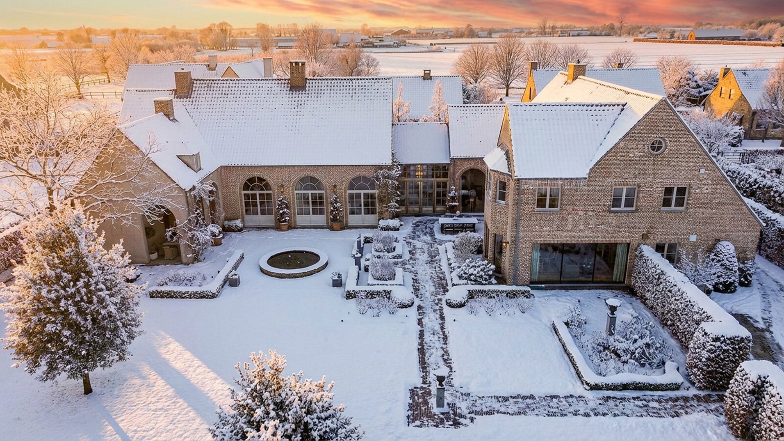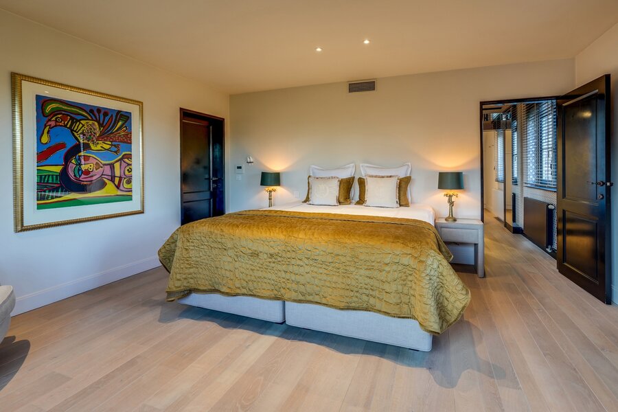 Outside, a covered terrace with built-in grill allows for year-round outdoor enjoyment. A wellness area with sauna and fitness room completes the comfort. Three separate garages provide ample space for vehicles and storage.