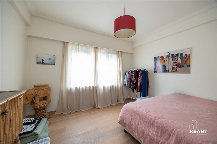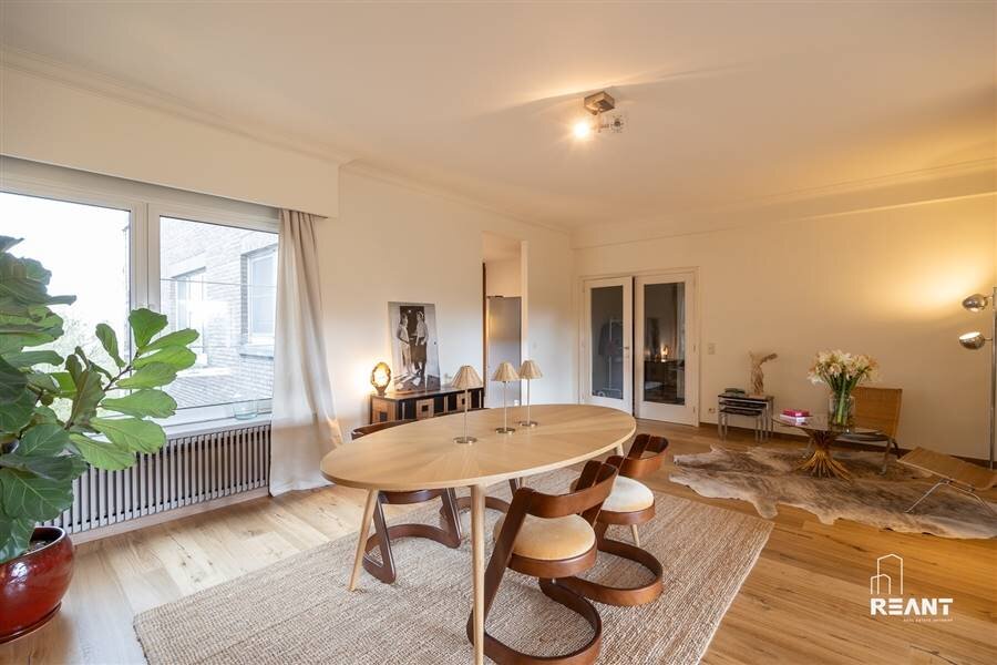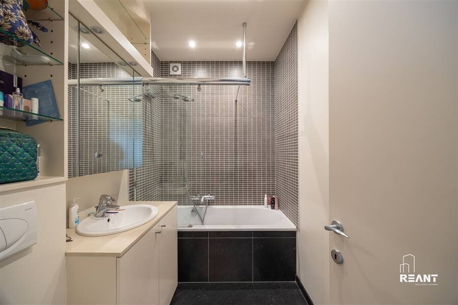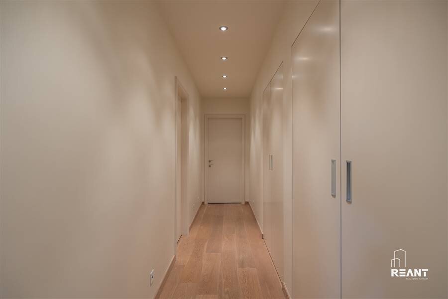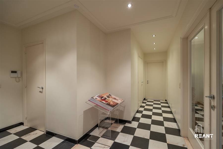 We betreden dit appartement via de royale inkomhal afgewerkt met natuursteen, wandverlichting en moderne ingebouwde kasten , comfort en charme staan hier centraal.