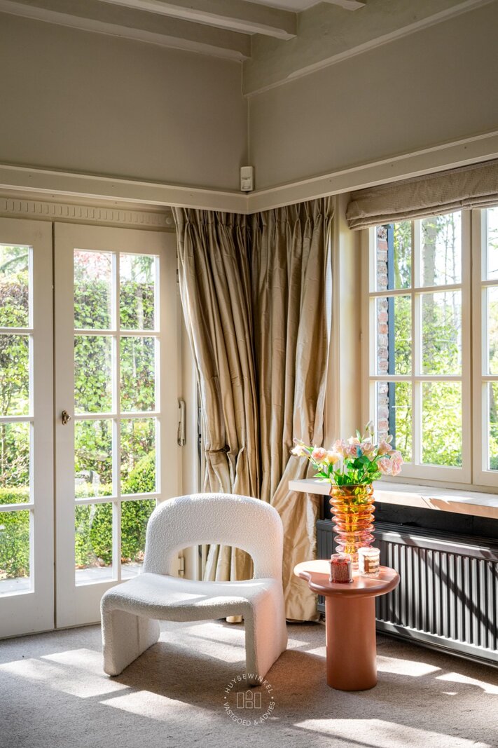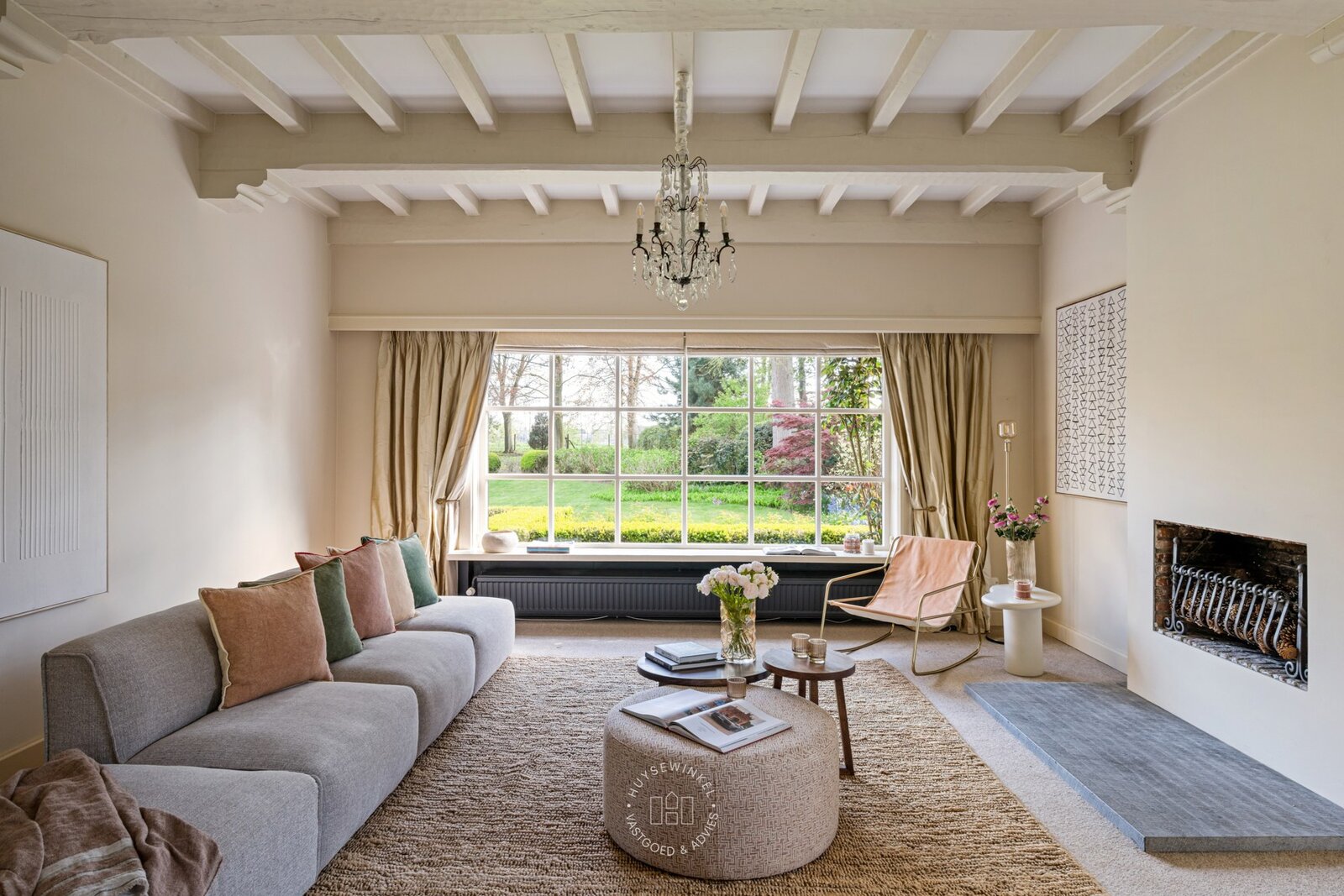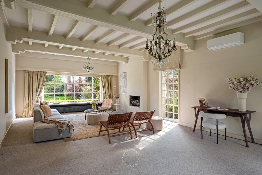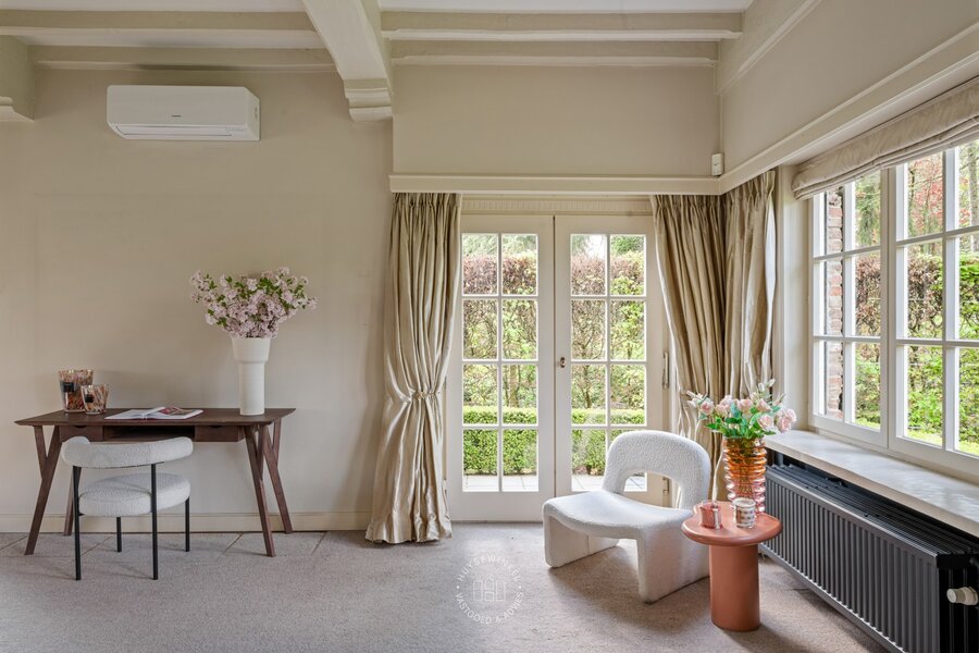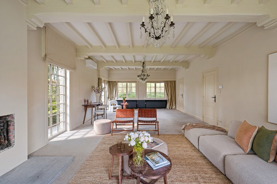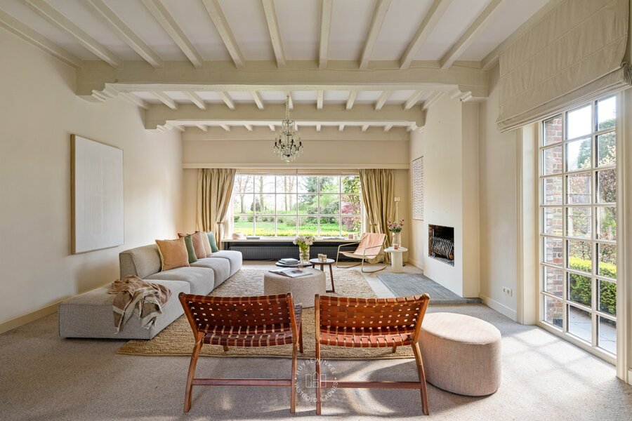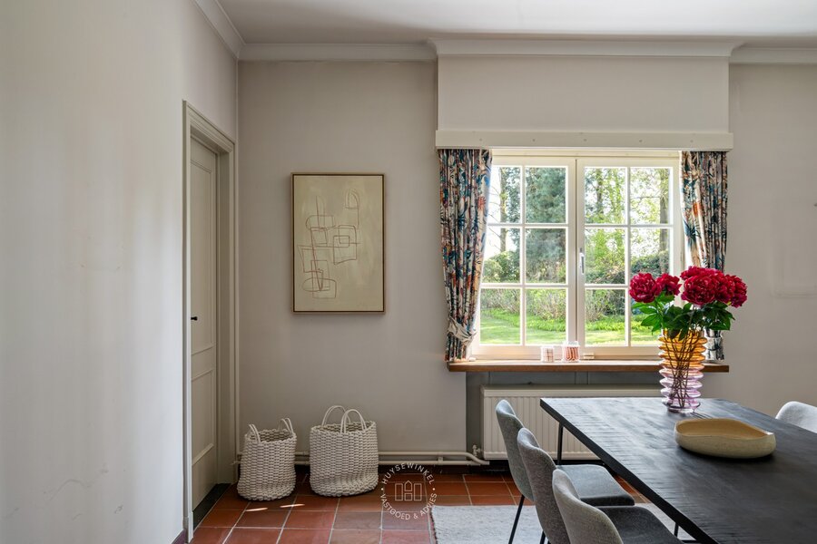 U betreedt de woning via een royale inkomhal met gastentoilet, die toegang biedt tot alle leefruimtes op het gelijkvloers. De lichtrijke leefruimte biedt een prachtig zicht op de aangelegde tuin en geniet van een warme, huiselijke sfeer dankzij de gezellige houthaard. Aansluitend bevinden zich een aparte keuken en een veelzijdige eetkamer, die perfect kan ingericht worden als bureau, hobbyruimte of gelijkvloerse slaapkamer. Verder beschikt de woning over gelijkvloerse badkamer en een inpandige garage.